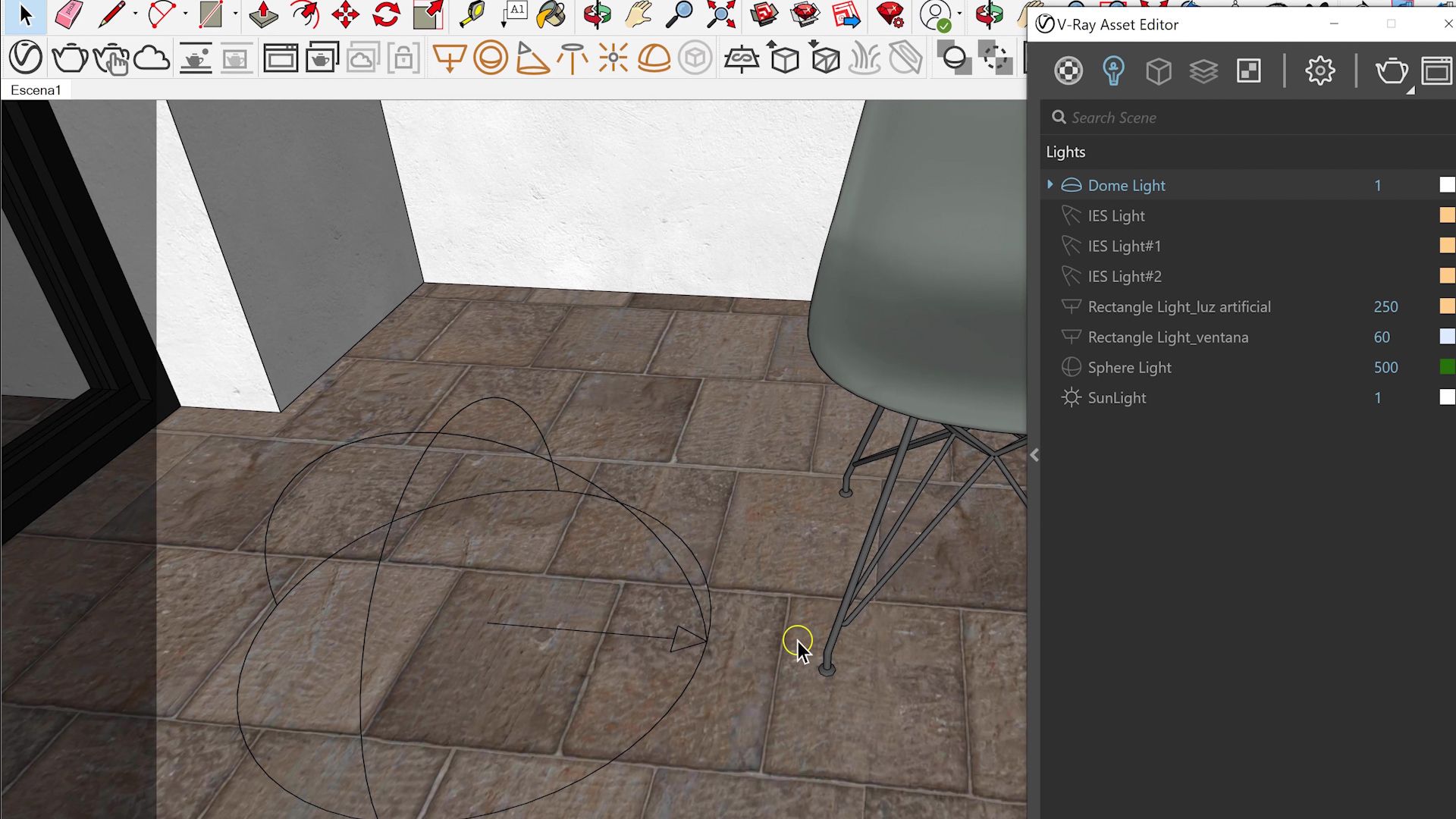 Before we start, remember that in the V-Ray interface, you can access all the lights you have placed in the scene in the right menu bar, in the Lights section of the Asset Editor. This is where we should go to see the first of our lights, Sunlight.