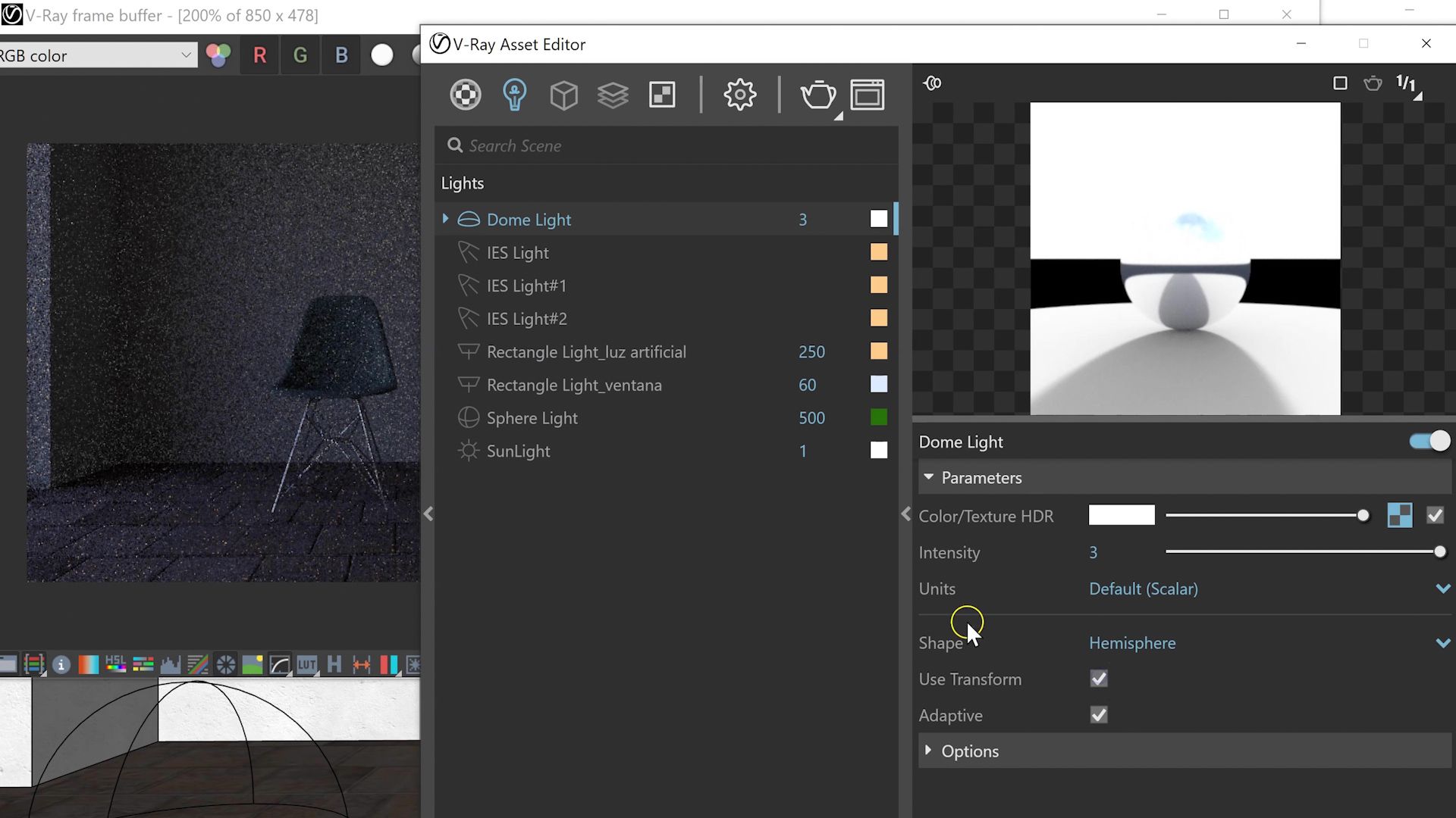 A Dome Light is a dome of light that surrounds our model. Usually, the Dome Light will have an associated sky texture; the arrow inside the Dome Light indicates where the Sun is located in your artificial sky.