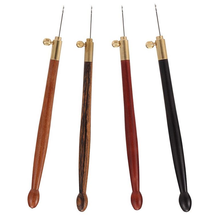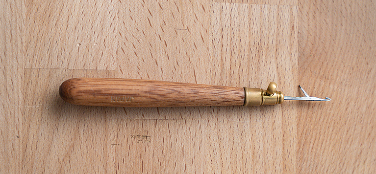 It has a rounded point and a lever that is activated by a spring. The design of the Kantan needle was influenced by knitting machines. It usually has a handle made from wood. The spring mechanism makes it easier to embroider. If you want to buy a Kantan needle, make sure it has a spring–don’t confuse it with other needles that are used for tapestry (you will recognize them because they are much bigger, such as the last three in the image below).