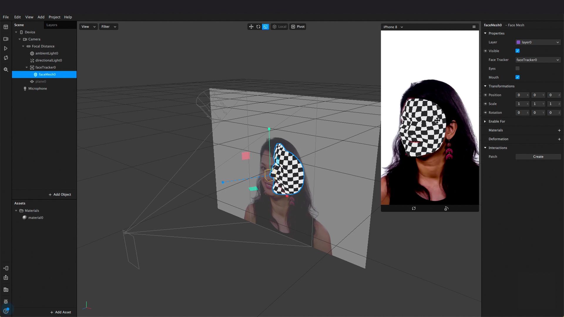 We’re going to zoom in on two elements that you can add to the Scene panel and which will be very useful when you come to start creating your augmented reality filters: Face Tracker and Face Mesh. Face Tracker follows the movement of our face and can be applied to all the movements we want, but our main focus is on Face Mash, a 3D mesh that adjusts to our face.
