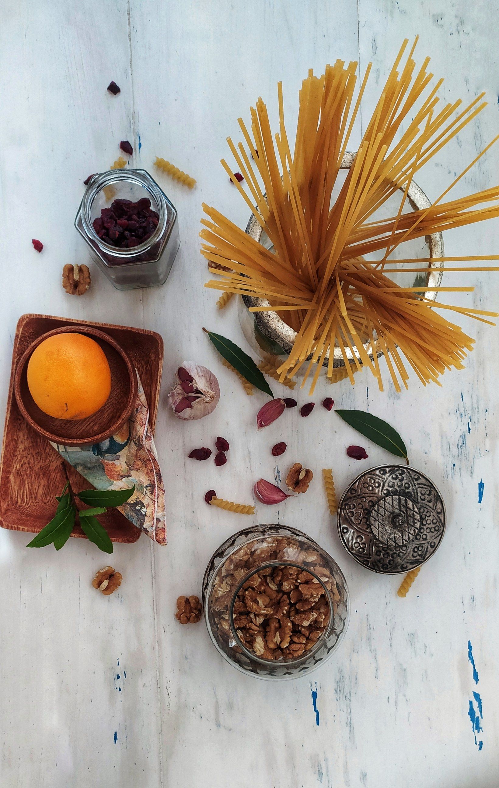 An example of how a harmonious color palette highlights ingredients and kitchen utensils. It is a project of the Professional Photography for Instagram course.