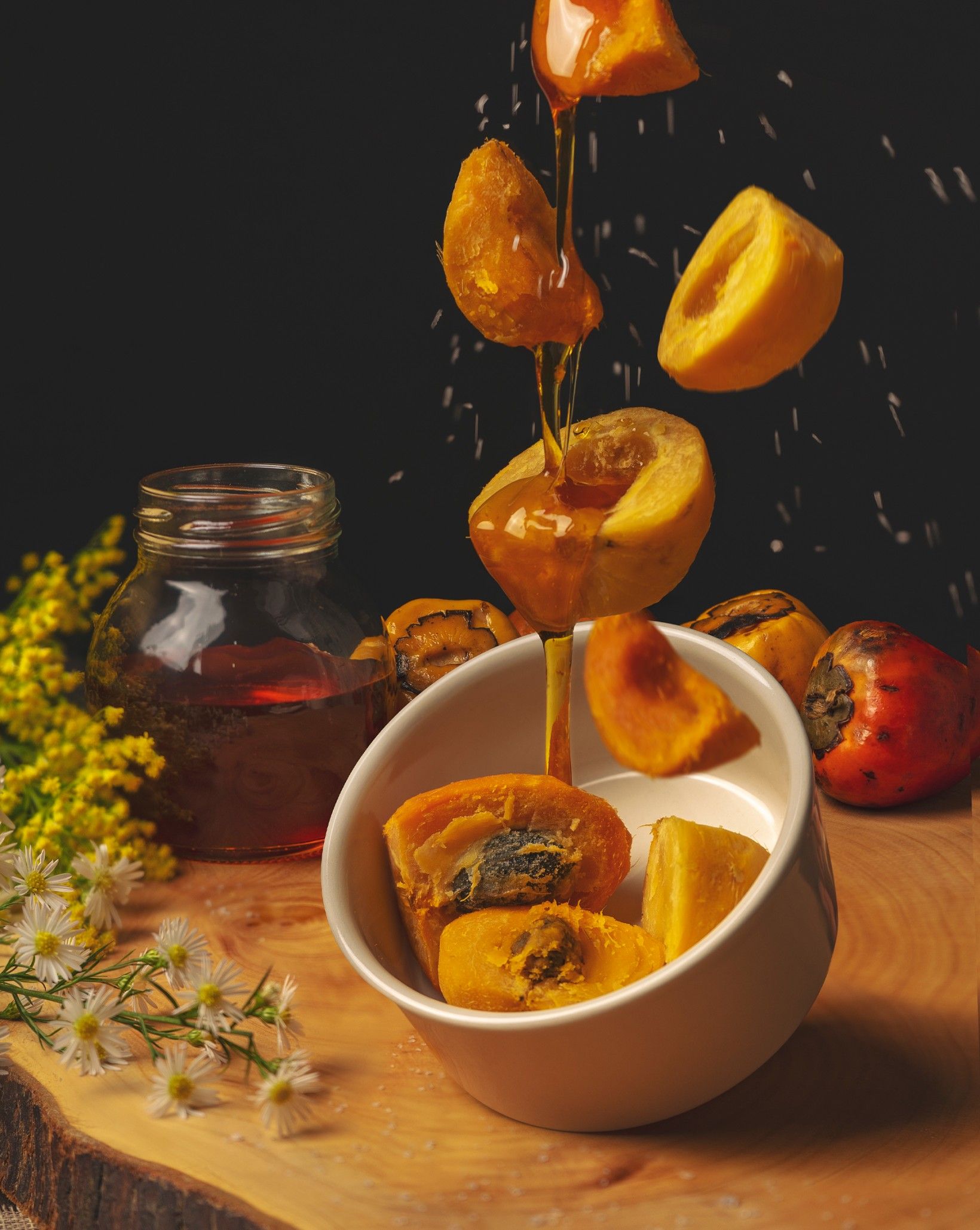 This attractive scene was created, in which the fruit floats while receiving a honey bath, was created in Adobe Photoshop. The sweet and natural quality of food is thus highlighted in an image with a pictorial influence.