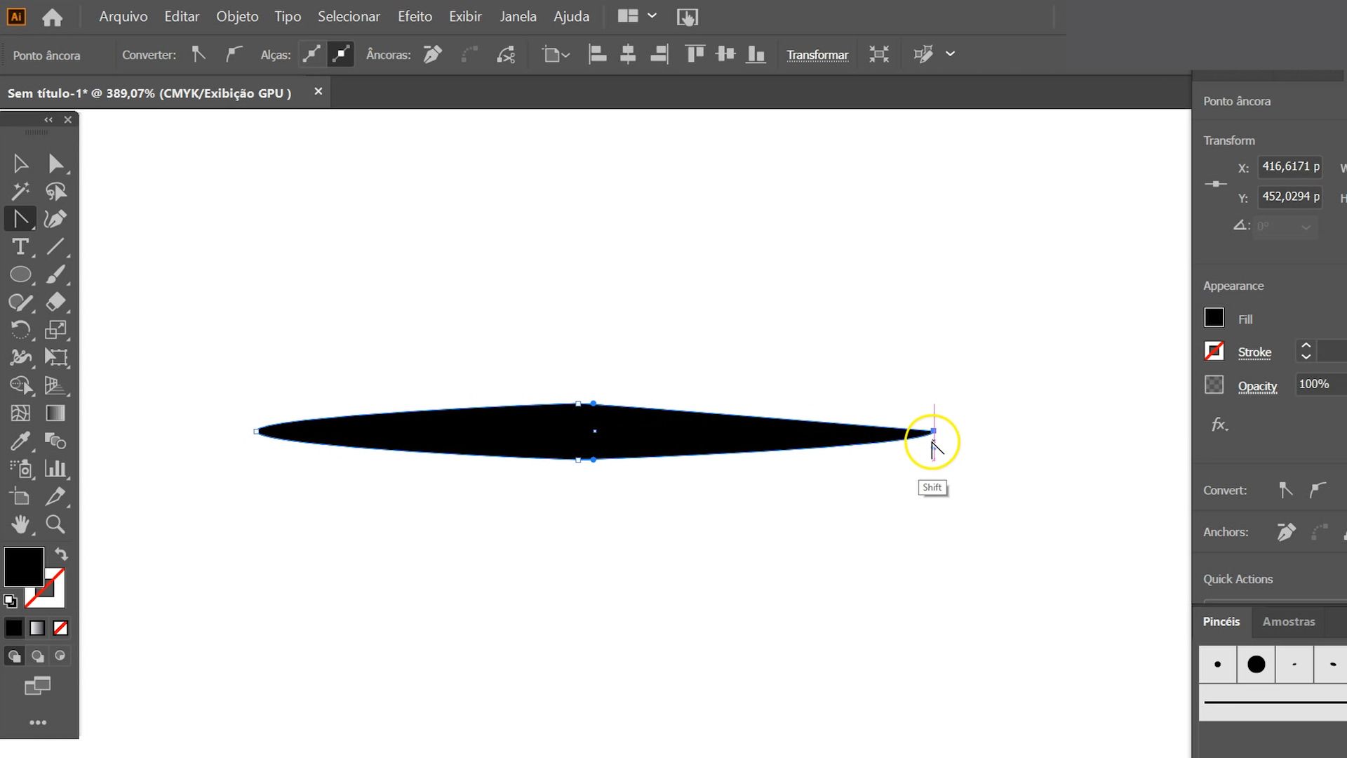 Use the command Shift + C to bring up the anchor point tool. Drag the sides of the circle to the right and left, creating a stroke.