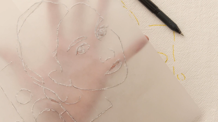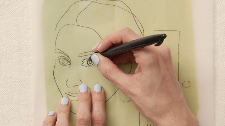 When working on portraits, our expert recommends starting with the subject’s eyes, since they will be the most challenging part of the face. Use a hard pencil, a burin, a fabric pen or a normal pen without ink to trace your design. Then, if we accidentally puncture through both sheets of paper, going through to the fabric, we can easily erase any marks and the fabric won’t get damaged.
