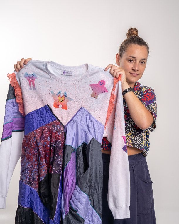 She presented her recycled 90s tracksuits in the Ego de Cibeles catwalk in 2007. The press called her style Sport Deluxe. From that moment, her collections have been part of the Mercedes-Benz Madrid Fashion Week and the 080 Barcelona Fashion. She also sells them in her shop in the Catalonian capital. Read on to discover how she creates two sports outfits out of an old sweatshirt, using upcycling, and see a gallery of her pieces.