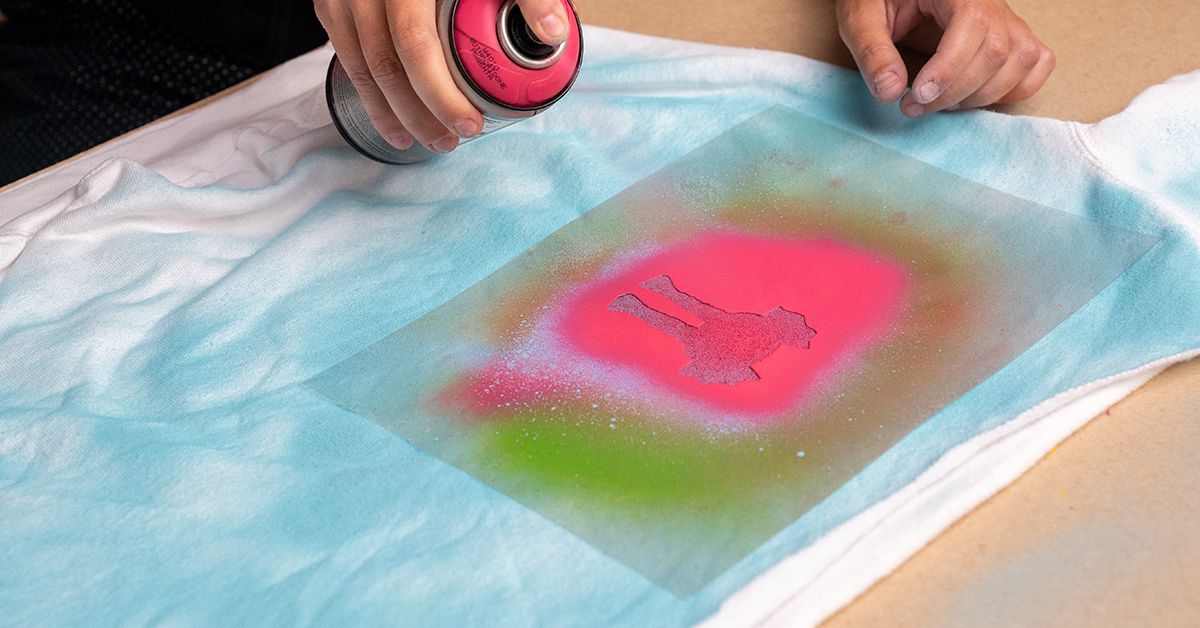 The steps below show how she created two garments, a dress and a hat, out of a sports sweatshirt, using stenciling and spray paint.