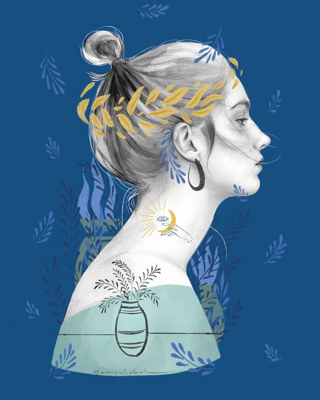 Dreamy-looking women are the protagonists of Naranjalidad's illustrations, who uses them as a canvas to capture a wholly natural universe.