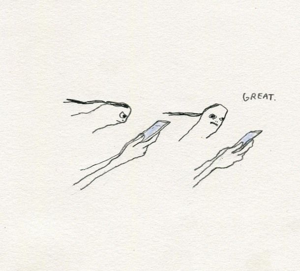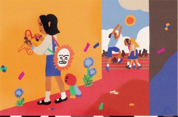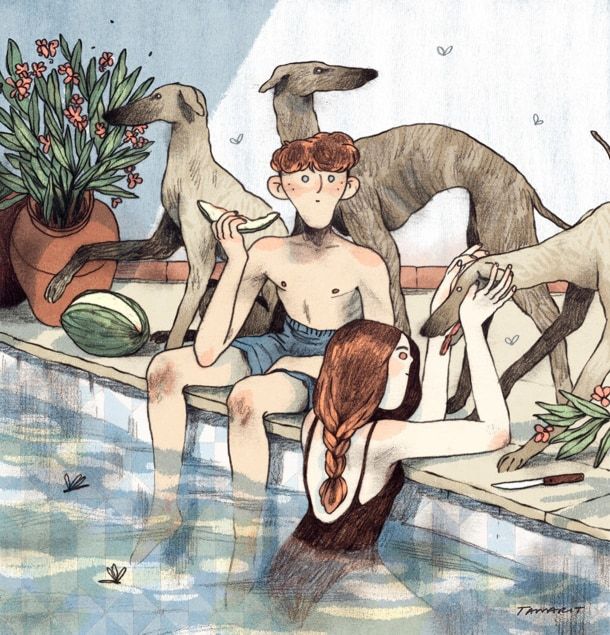 Valencia-born Núria Tamarit’s illustrations appear to transcend the paper. They jump off the page to take a breath and spill over the frame. Her characters, with their distinctive profiles, their reddened knees and knuckles, and perfectly disproportionate limbs, are often seen frowning at the frantic activity happening around them.