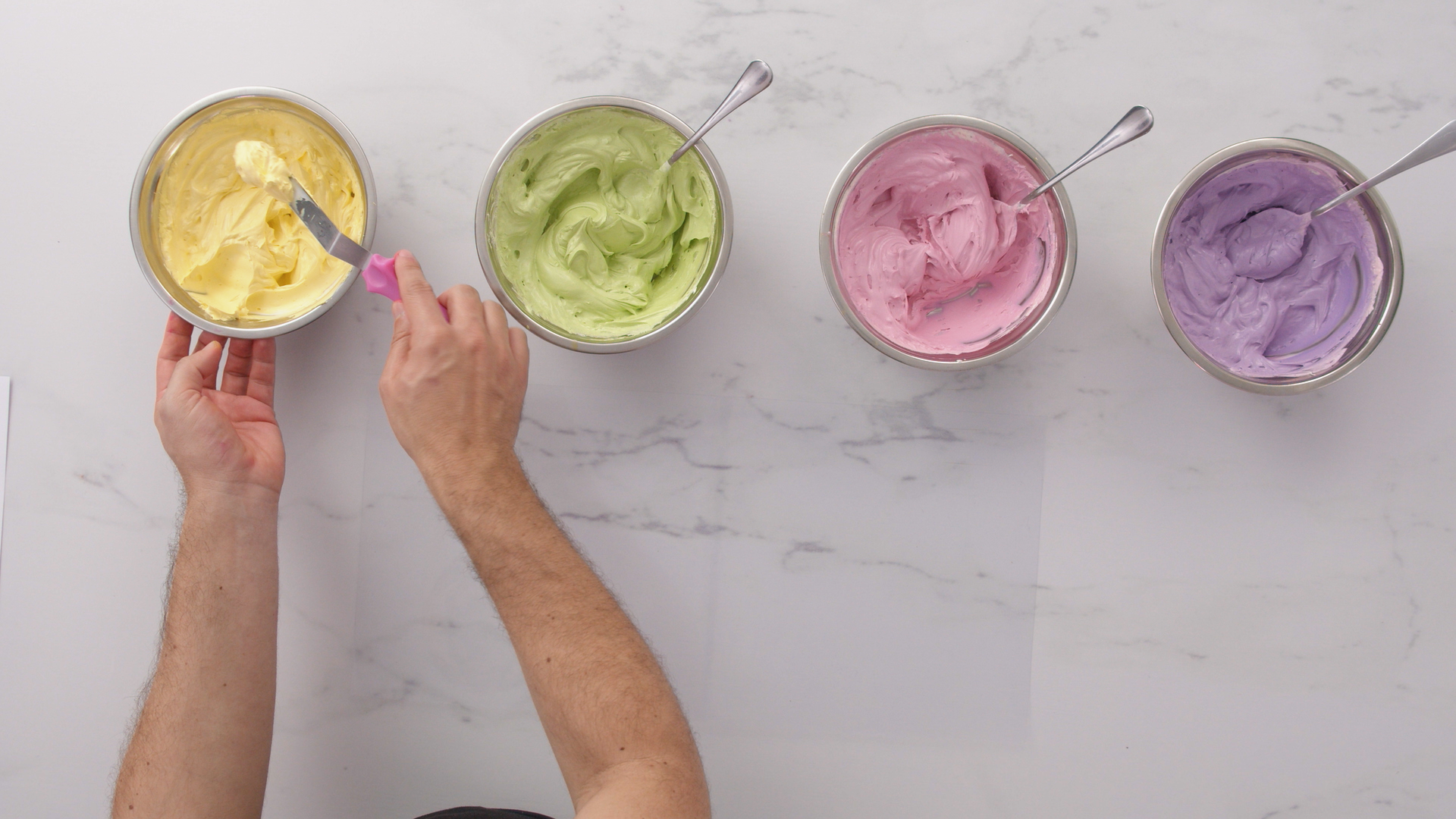 Remember to give each bowl a brisk stir with a spoon to keep it smooth before placing the butter cream onto the acetate.