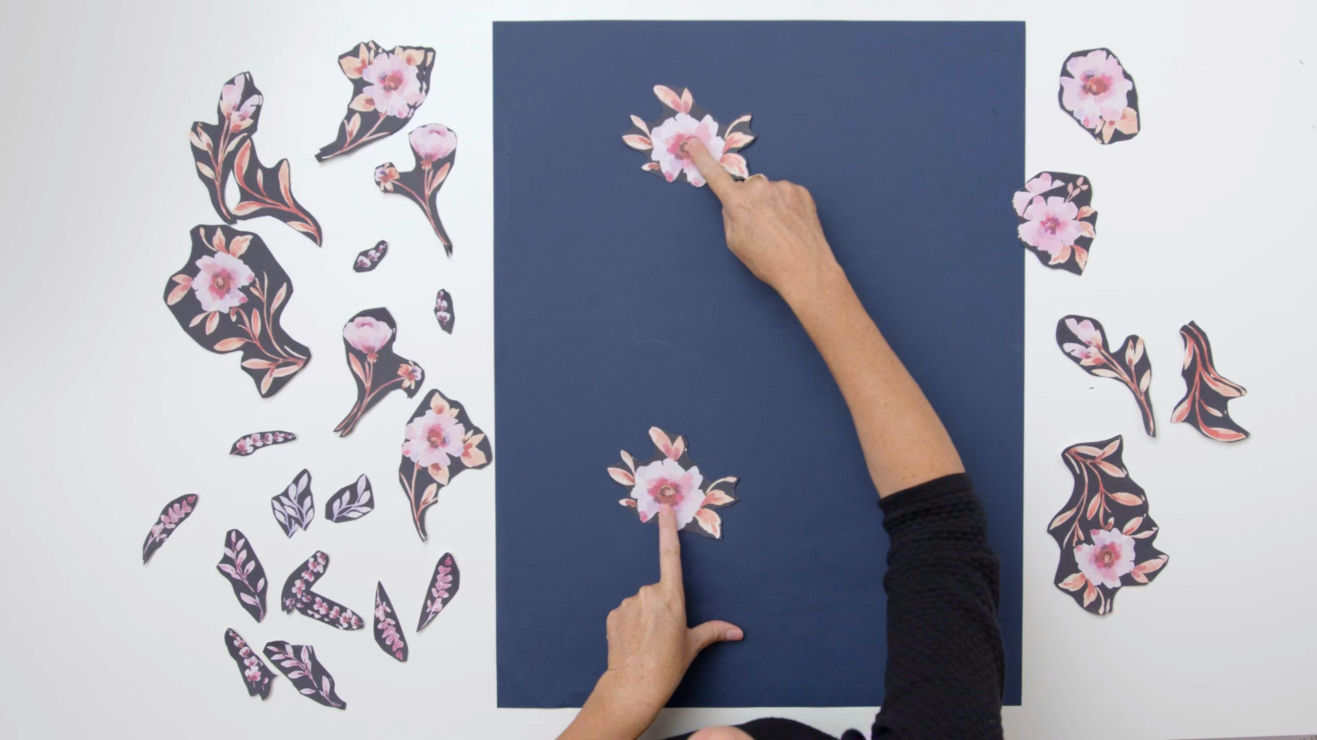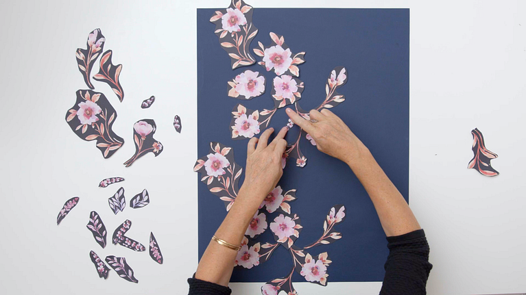 Arrange your pieces on the paper in such a way that they never form horizontal or vertical lines, as these create very rigid lines or grids and do not allow for more dynamic designs.