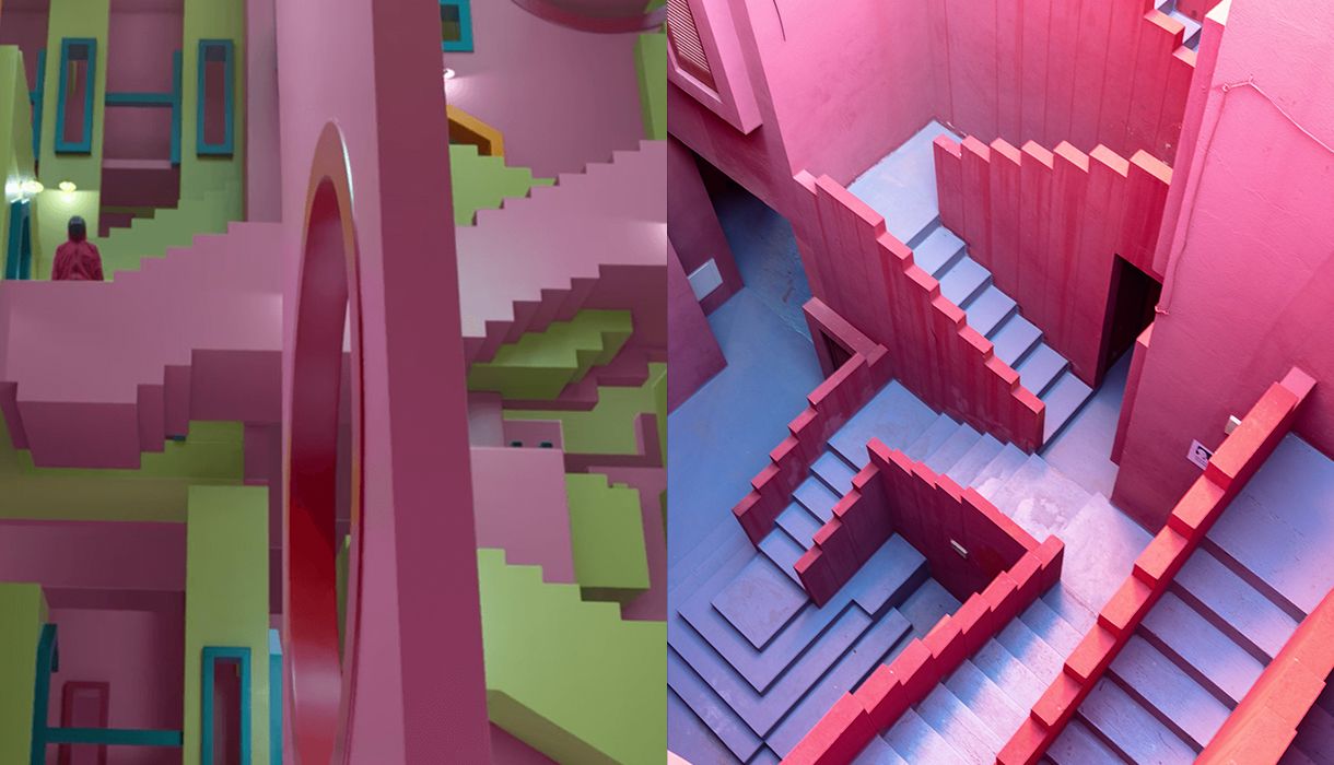 If Escher's work was the inspiration for the structure of the stairs, Spanish postmodernist architect Ricardo Bofill was undoubtedly the primary guide for color and design. His housing project La Muralla Roja (The Red Wall) bears a remarkable similarity to the stair room in the series, both representing a labyrinthine structure and a utopian aesthetic.