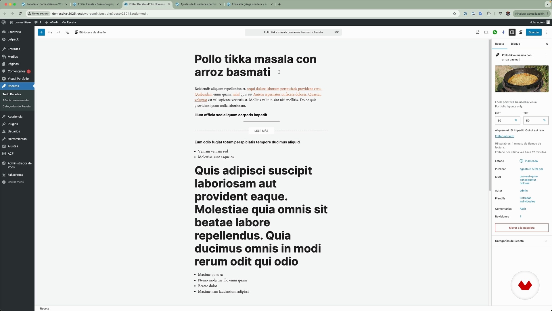 “The recipes have so far only included a title and content. a content. a featured image. you know. just the usual elements that are typically included. but it is possible that we might encounter a situation where we need to. There are other field types or options not part of the main content that we still want to display in some way. even if they aren't directly visible. Consider a recipe with its ingredients. How do we add them? Initially. it's straightforward. I simply place the ingredients here. This method works but demands careful attention. And I start listing the ingredients. right? O...”