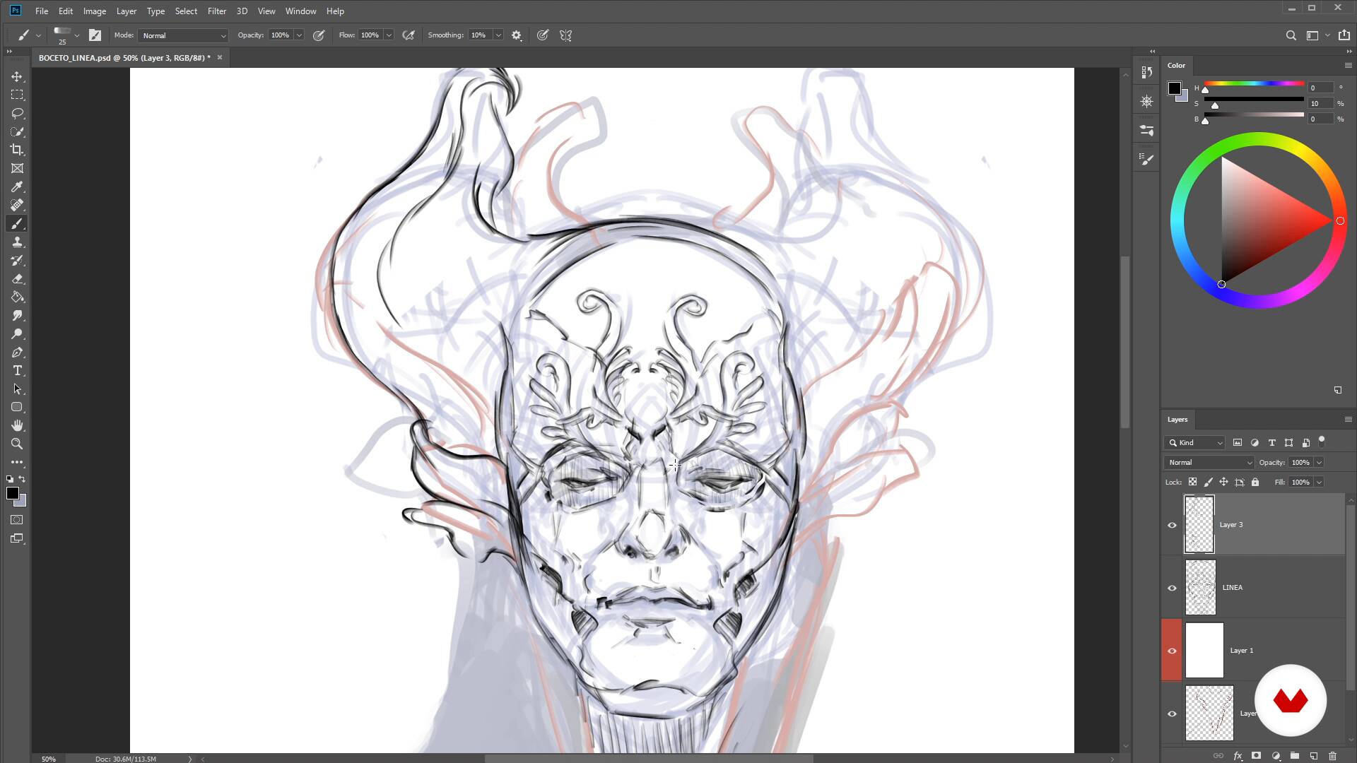 “PHOTOSHOP FOR CONCEPT ART COURSE 6 LESSON 2 Defining our character through the line Now we will refine our sketch by adding the line to be able to apply the color. I show you. With the Crop tool, we will make the canvas a little larger, let the composition breathe more. Anyway, I don't want to paint any further, I want to focus on the face. In fact, when I make the suit, I won't detail it as much as the face. Don't forget to mirror the image, invert it. It is very useful to see if there are problems in anatomy or composition. Now that we have it, a new layer and I'll paint it white. I'm goi...”
