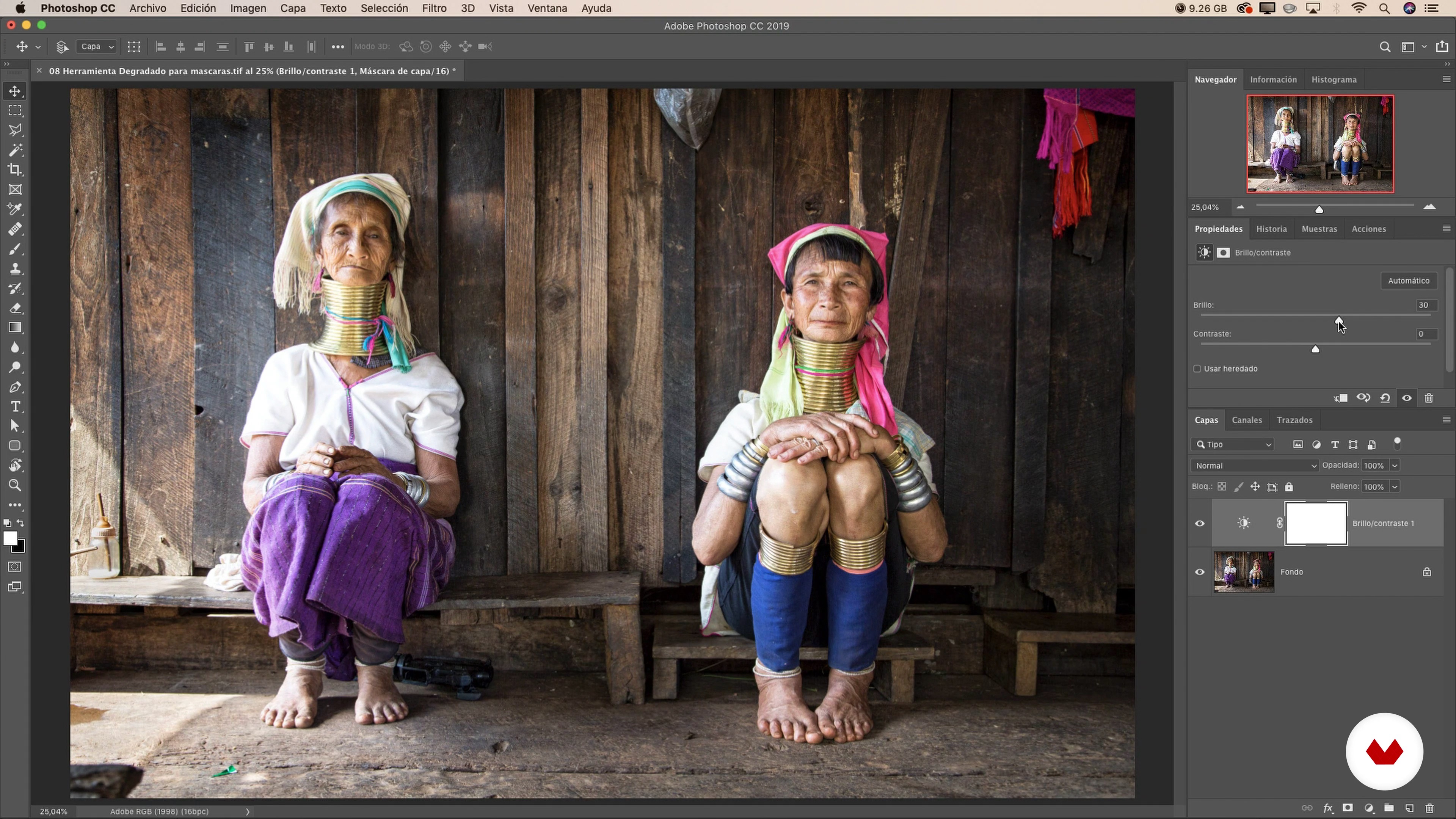 “PHOTOSHOP: LAYERS, CHANNELS, AND MASKS COURSE 2 LESSON 7 Gradient Tool for Masks One of the most important aspects when touching up an image is that the adjustments we make can’t be noticeable. So our masks need a smooth transition. We can achieve that effect with the Gradient tool. We’re going to make transition so smooth that our adjustments will go unnoticed. Let's see it. In this case, we’re lightening these women’s faces using a Brightness/Contrast layer with a layer mask based on gradients. Open a Brightness/Contrast adjustment layer. In the Properties pane, slide the Brightness slide...”