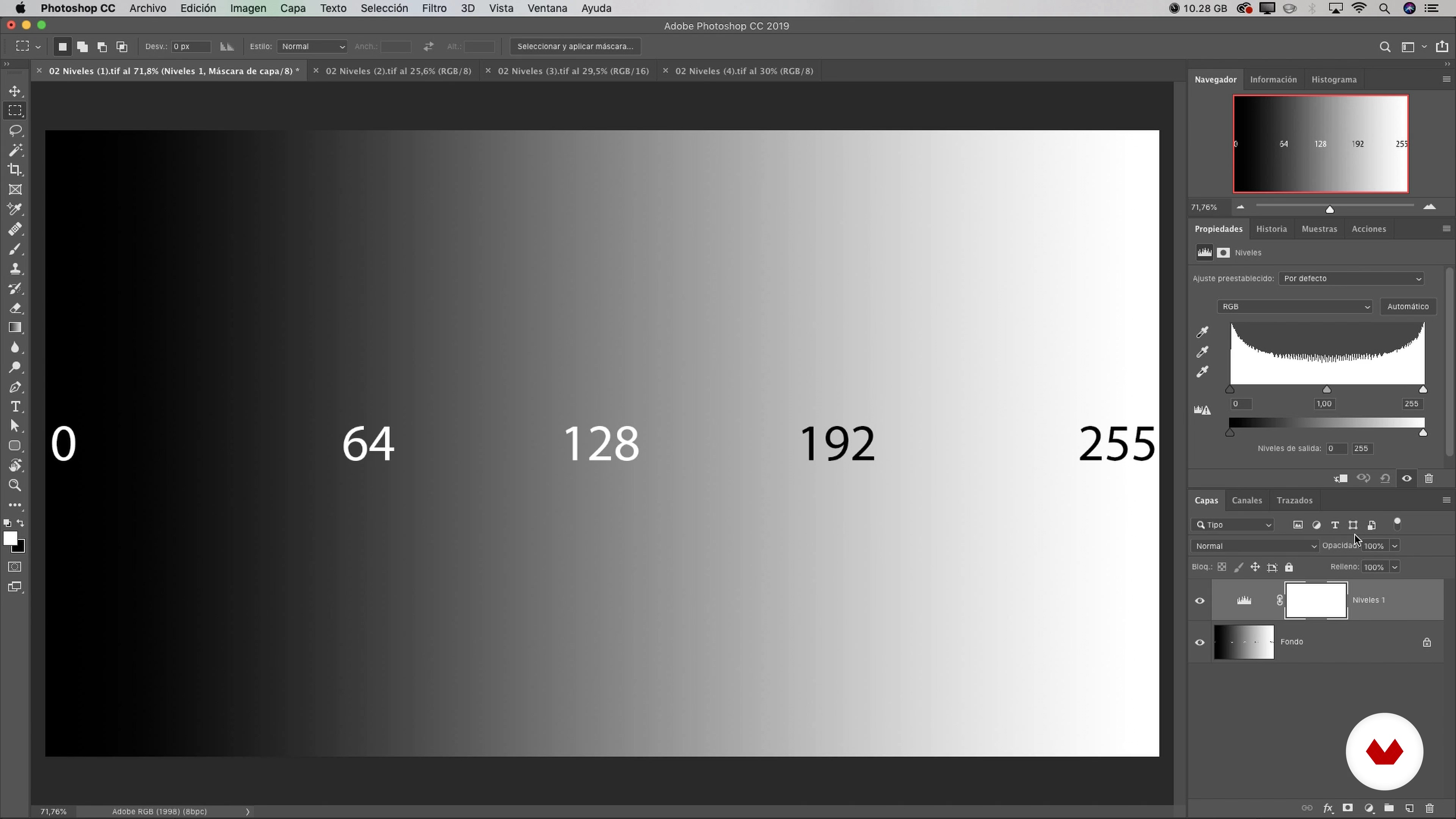 “In this unit you will learn why the “level adjustment layer” is so important and so precise. You will see how to use this adjustment layer using the histogram that it provides us. Also, you will understand what you are really doing when you move some of the sliders on the level adjustment layer. ”