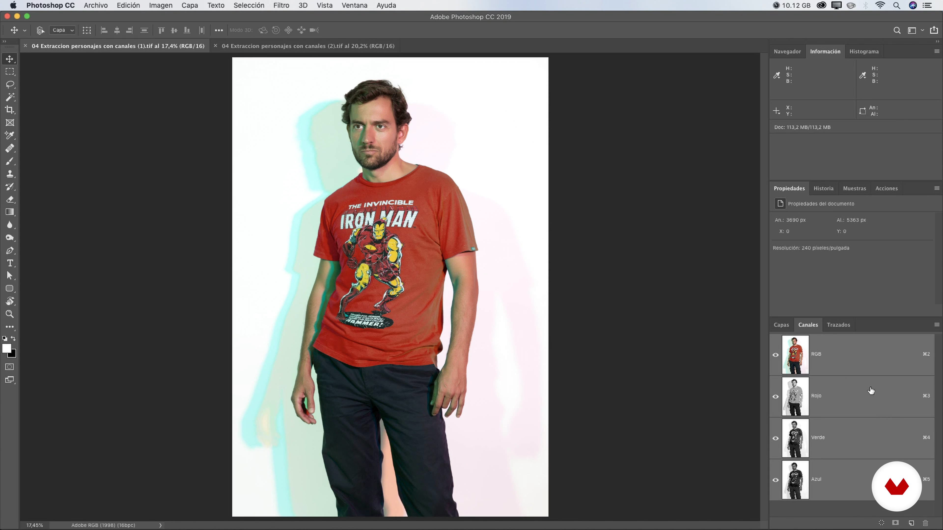 “PHOTOSHOP: LAYERS, CHANNELS, AND MASKS COURSE 4 LESSON 4 Extracting your Characters with Channels Now we’ll use our channels to extract characters from the background. You'll see how, this time, our selections will look almost perfect. We're doing something similar to our previous lesson. We’ll also be using our Brush tool to improve our selection. It’ll be very easy. Let’s do it. This picture was shot using three flashes and a front color filter. That’s why the shadows look cyan, green, and magenta. We’re going to extract Raúl from the background to paste him into this other image we’ve pr...”