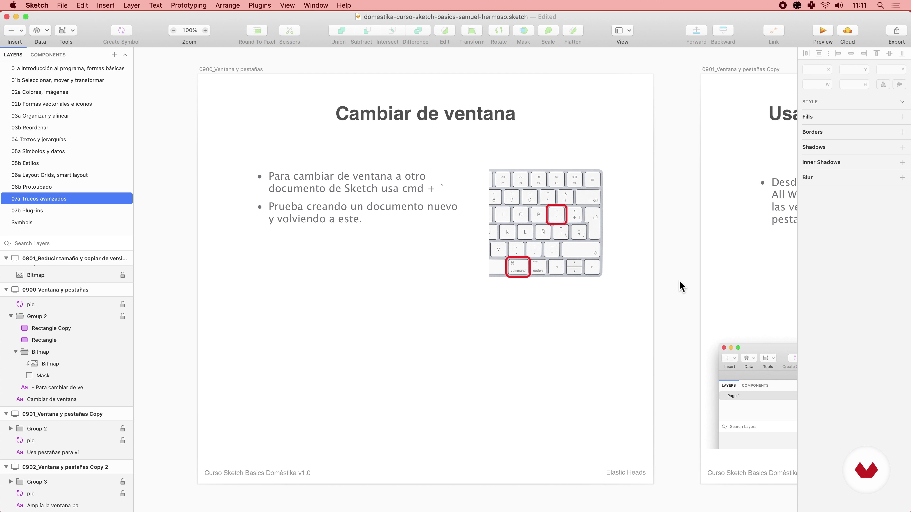 “INTRODUCTION TO SKETCH COURSE 7 LESSON 10 Change window and tab In this lesson we will see that we can work in Sketch with multiple documents at once using tabs or a shortcut to change windows. I show you how. Change window Sometimes windows on mac they drive you a little crazy and you can't find them, you have to go to the dock or you have minimized them. There is a way to switch between one screen and another, which is the shortcut for the key that is attached to the P key. Let's see how it is done. I will make a new file, Command + N. It's full screen and I don't see the other one. I see...”