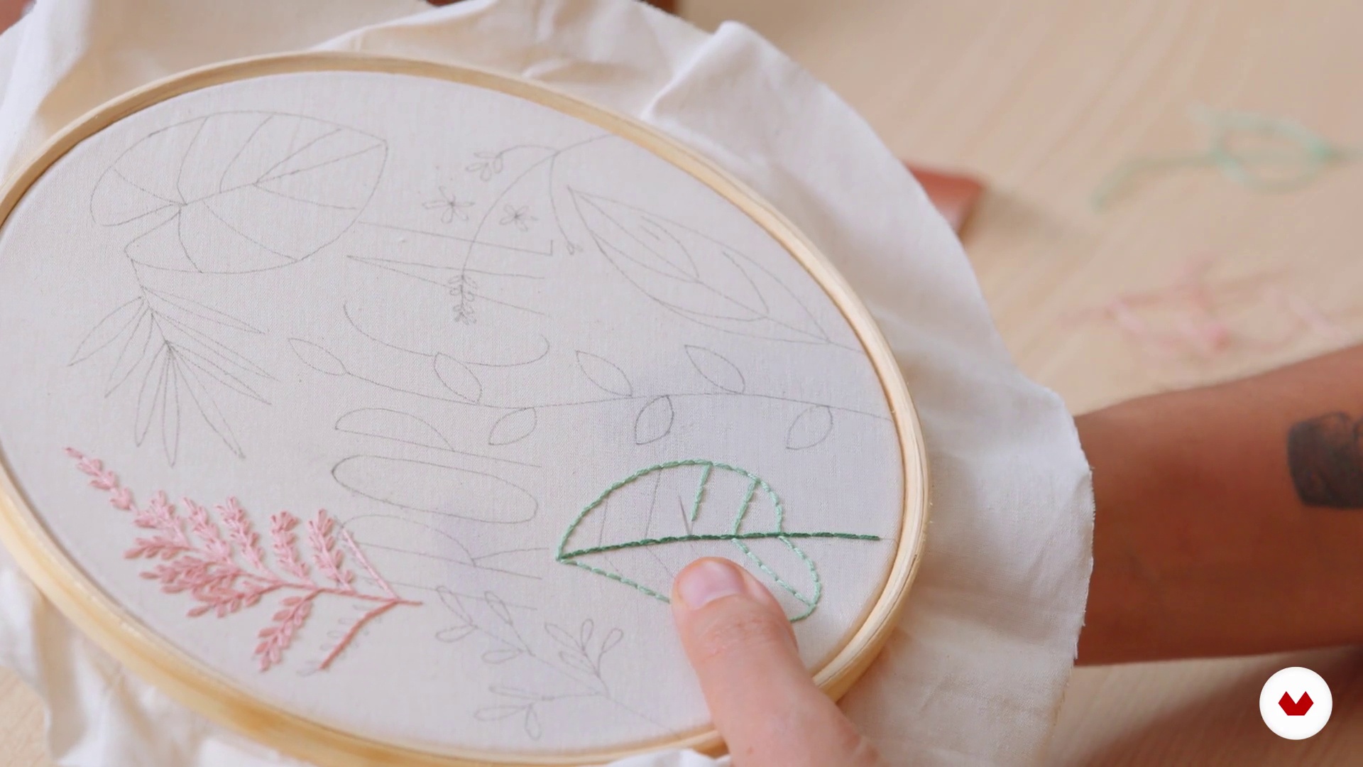 “In this lesson. i'll start applying the stitches and the outline stitches. I'll begin with the elements that are behind. In my embroidery. this is the one I'll start with first. Here. i'll use the stem stitch. It works well on curves. The daisy on the leaves. On this little plant. i'll do the stem too. For this one. i'll just outline it. so I'll do it here with a backstitch. I want this larger leaf to stand out more. so I'll use the Peking knot stitch to make it pop. And I'll do the leaf stitch on the leaves. For the Peking knot here. i'll use the same color. no different shades. I prefer i...”