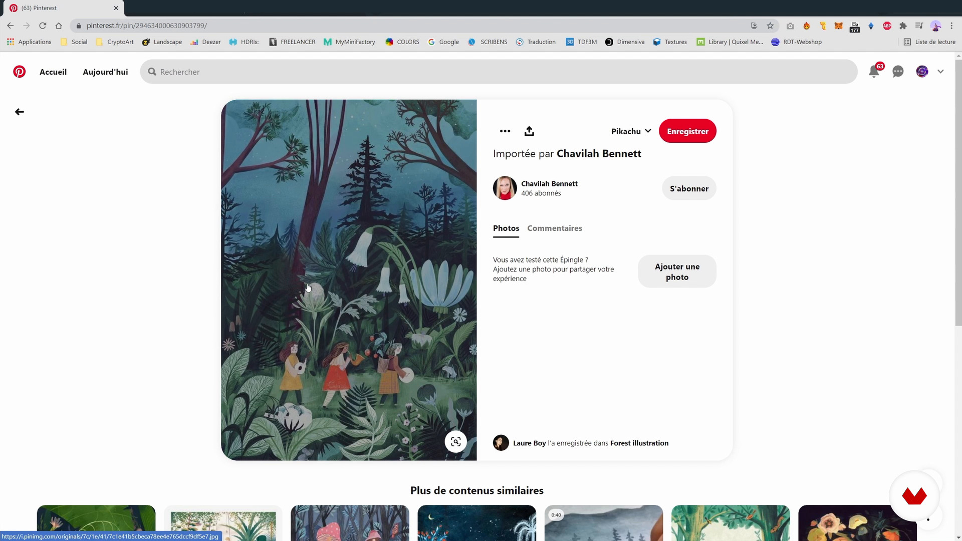 “Search for References Now that you know more about me, in this lesson, we will see how to find and organize our references on Pinterest, and we'll see that right away. I've already opened Pinterest, it's a platform which is really practical for this subject. It generates images for you, as you go along, based on what you've searched before. It’s really practical. That's why it's the main platform we're going to use for our research. I have a very small personal account where I have created a small board, called Pikachu, a funny little name. In this file, I have lots of illustrations that I ...”