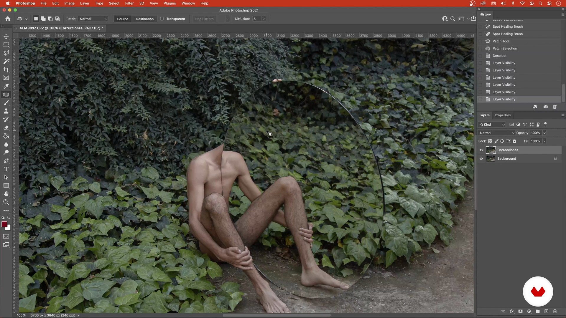 “Fixes Once my file is exported to Photoshop We start with the corrections. Join me and I'll show you my process. Since we imported our photo into Photoshop Let's start our editing process. We're going to duplicate layers and we're going to call this Corrections. Here we will start to make small corrections and see things that make us noise in the photo. For example, let's see, let's get closer and here I can see the dry leaves, that cause me a little noise, so let's start removing them little by little. We're going to use the Spot Healing Brush Tool, which is quick. He does a good job there...”