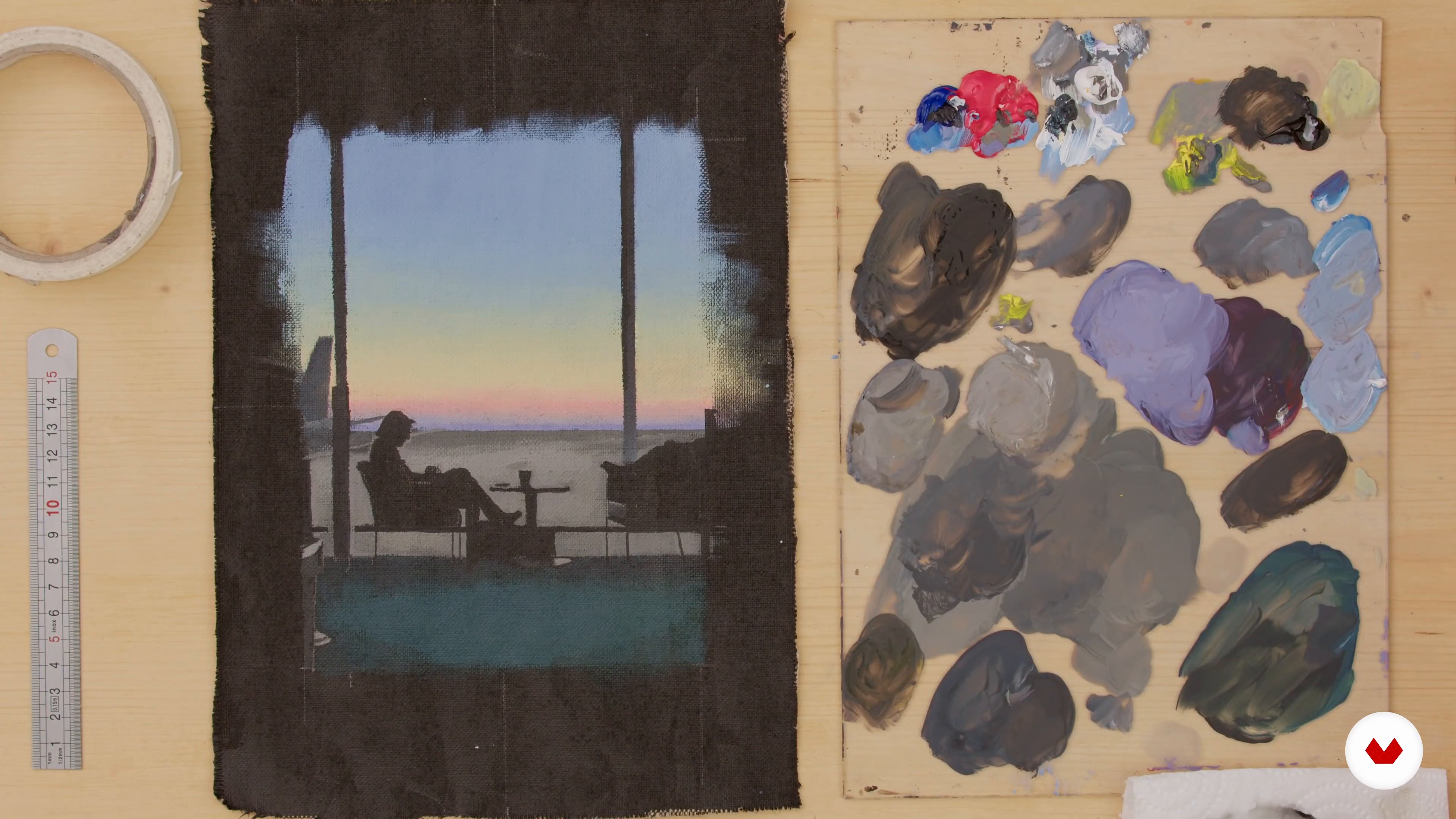 “The silhouettes In this lesson, we will paint the silhouettes, the silhouettes and all the dark tones that we left for the end. When we look at the canvas, we realize that we have eaten in several places the spaces that were supposed to be left dark. So, using the criterion, we will retrace all the lines which have disappeared so that they can then be painted. When I think I've drawn all the lines that will help me to fill in the spaces that need to be darker, I can start painting. We can start with the easiest areas, the ones where we're going to give away masking tape to make straight lin...”