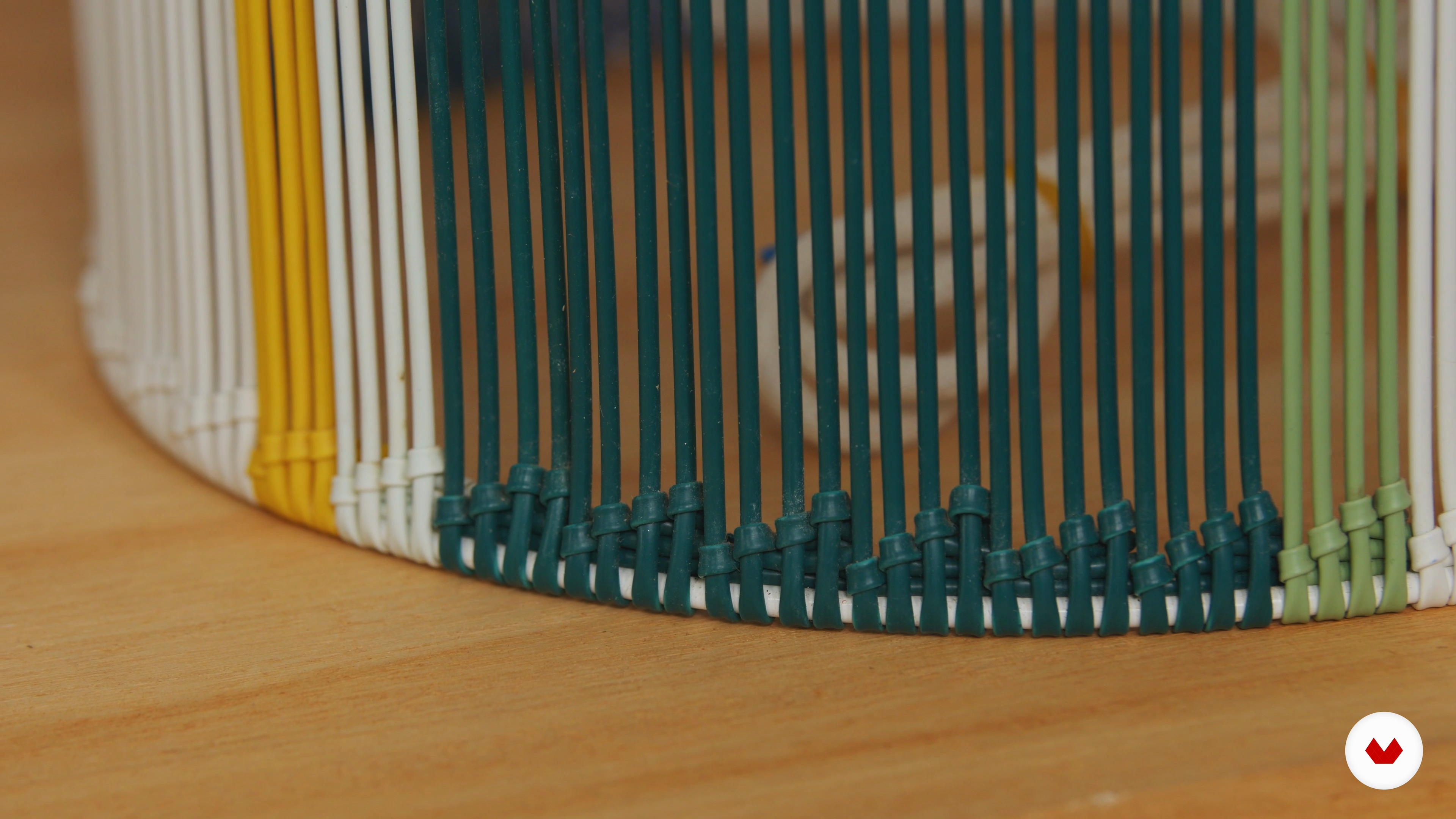 “In this lesson, we will show you other applications of this technique in decorative objects. You can apply this technique in the design of lamps. In this case, we have covered the structure of the lamp with the cable. Since the bottom of the lamp is wider, we circle the hoop twice before going back up. Thus, the design is more uniform. If you want to learn more about decoration techniques, you can watch the video that I have left you in the description. We have also lined the vertical parts of the frame with cable, thus preventing the frame of the lamp from being seen. We have worked with l...”