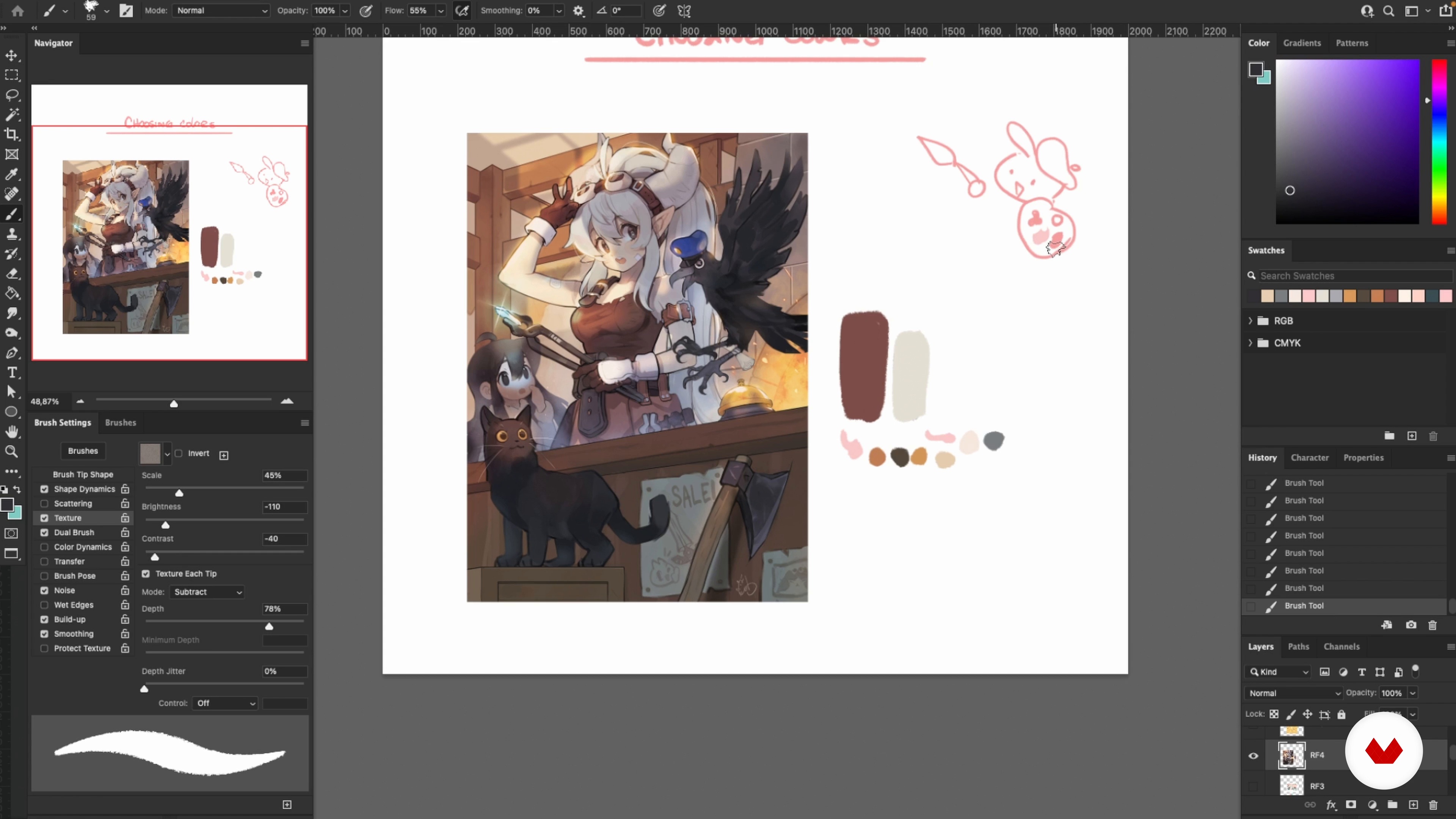 “Color will always play one of the most important roles when designing characters. It's one of the first elements we perceive and carries a lot of meaning in and of itself. Therefore, you'll see how to define character colors.”
