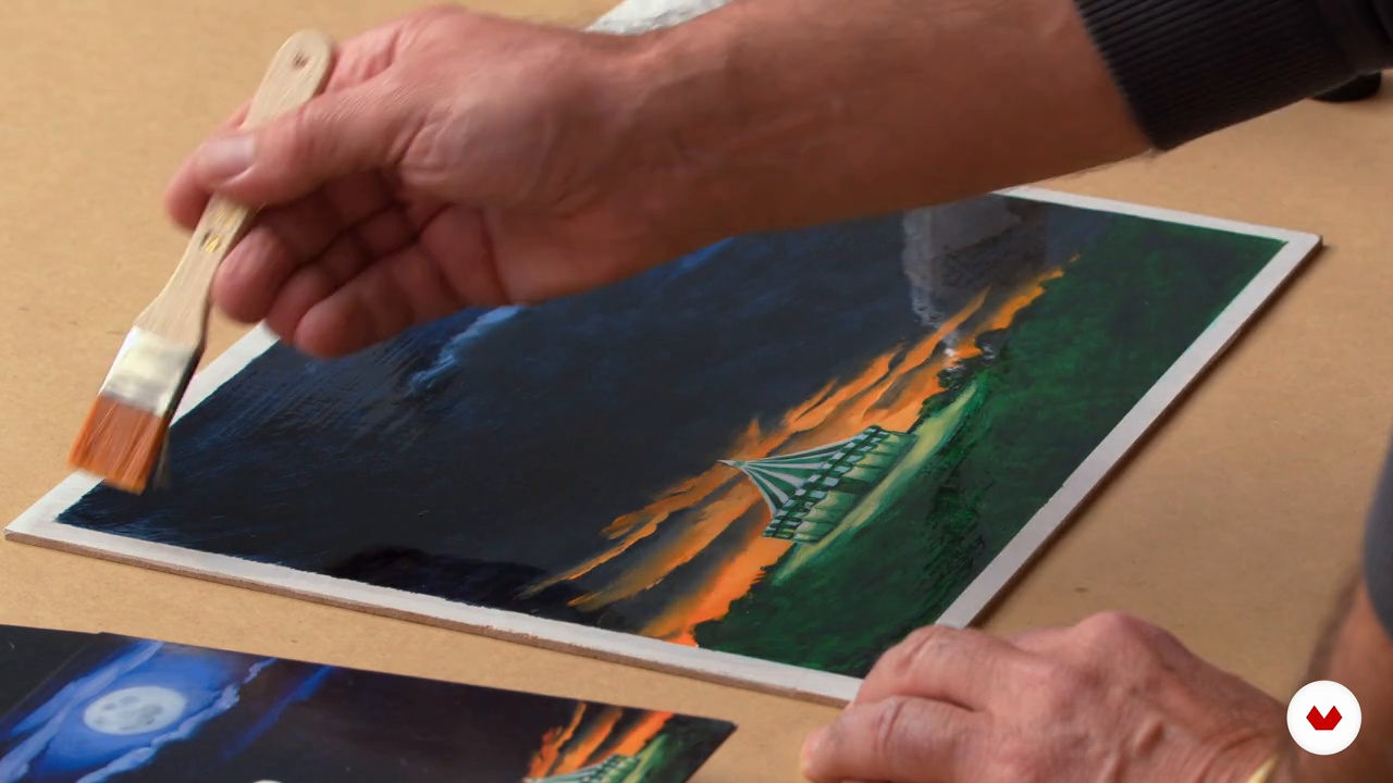 “Well. now our painting is complete. but as expected. it's still wet. much like signs often warn when something has just been painted. We must wait before applying varnish. It's important to ensure the paint is I brought a piece intended for the bottom of our package. We mentioned the black background so we can add our landscape to any side of the box. This will include a circus tent. a full moon. and some clouds. idea is to create a whimsical scene that complements the overall design. ensuring it stands out and captures This piece I brought is completely dry. It's crucial not to varnish bef...”