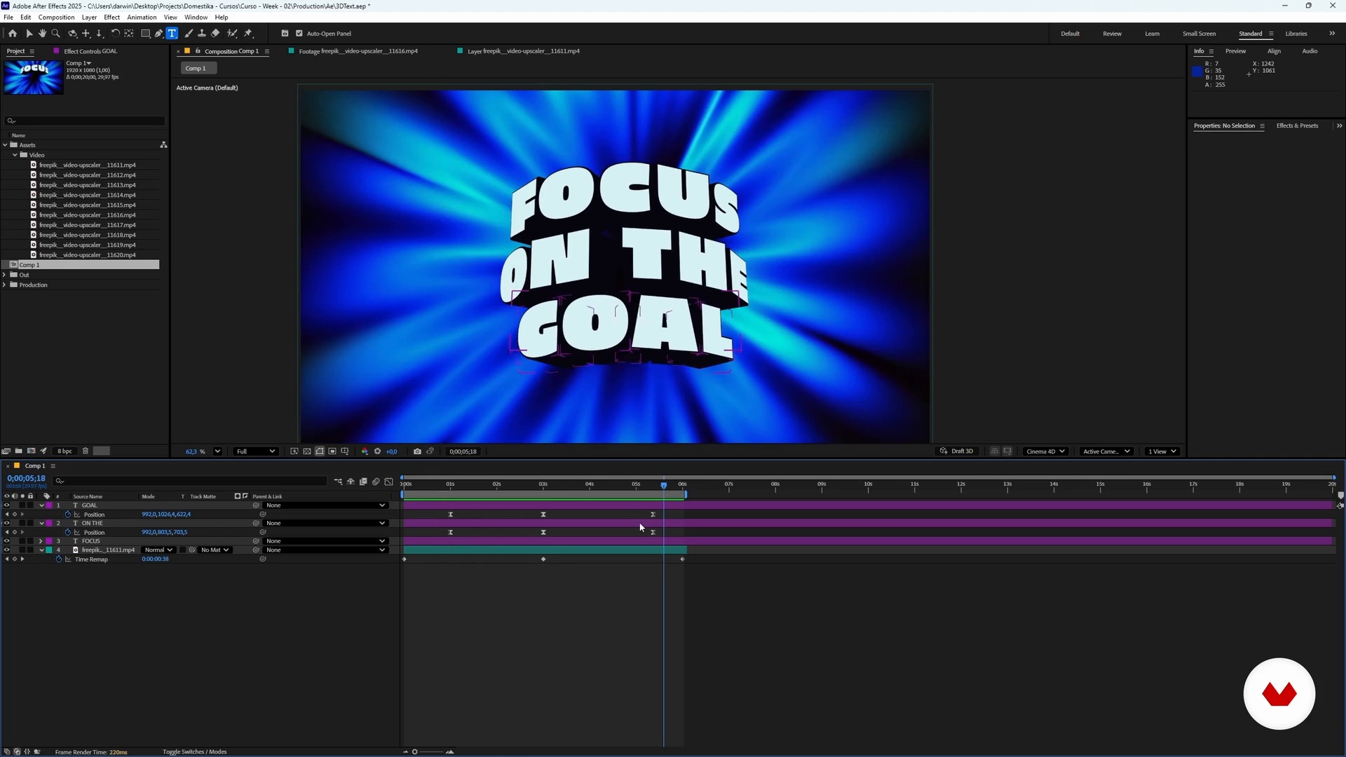 “You'll learn how to create 3D text animations in After Effects by applying extrusion, colors, and rotations, setting up masks and loops, and using keyframes for fluidity. You'll reuse the animation across different words through duplication and precompositions, and apply effects such as shadows and grain to achieve a professional and consistent result.”