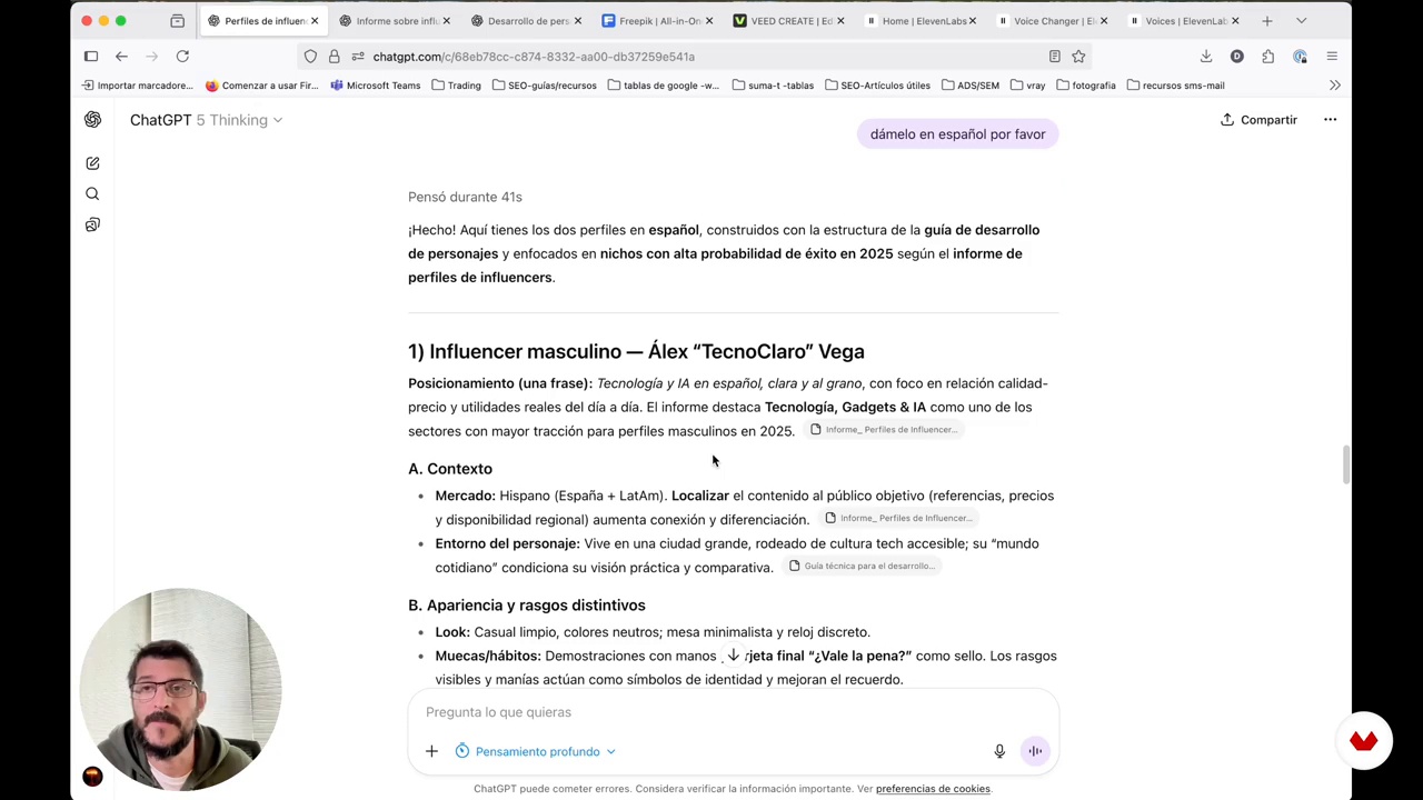 “Here, you'll learn how to create strong influencer profiles using ChatGPT. You'll generate a trends report and a character development guide, working in depth to define personality, context, visual style, and voice. This material will provide a coherent and professional foundation for successfully designing your avatars.”