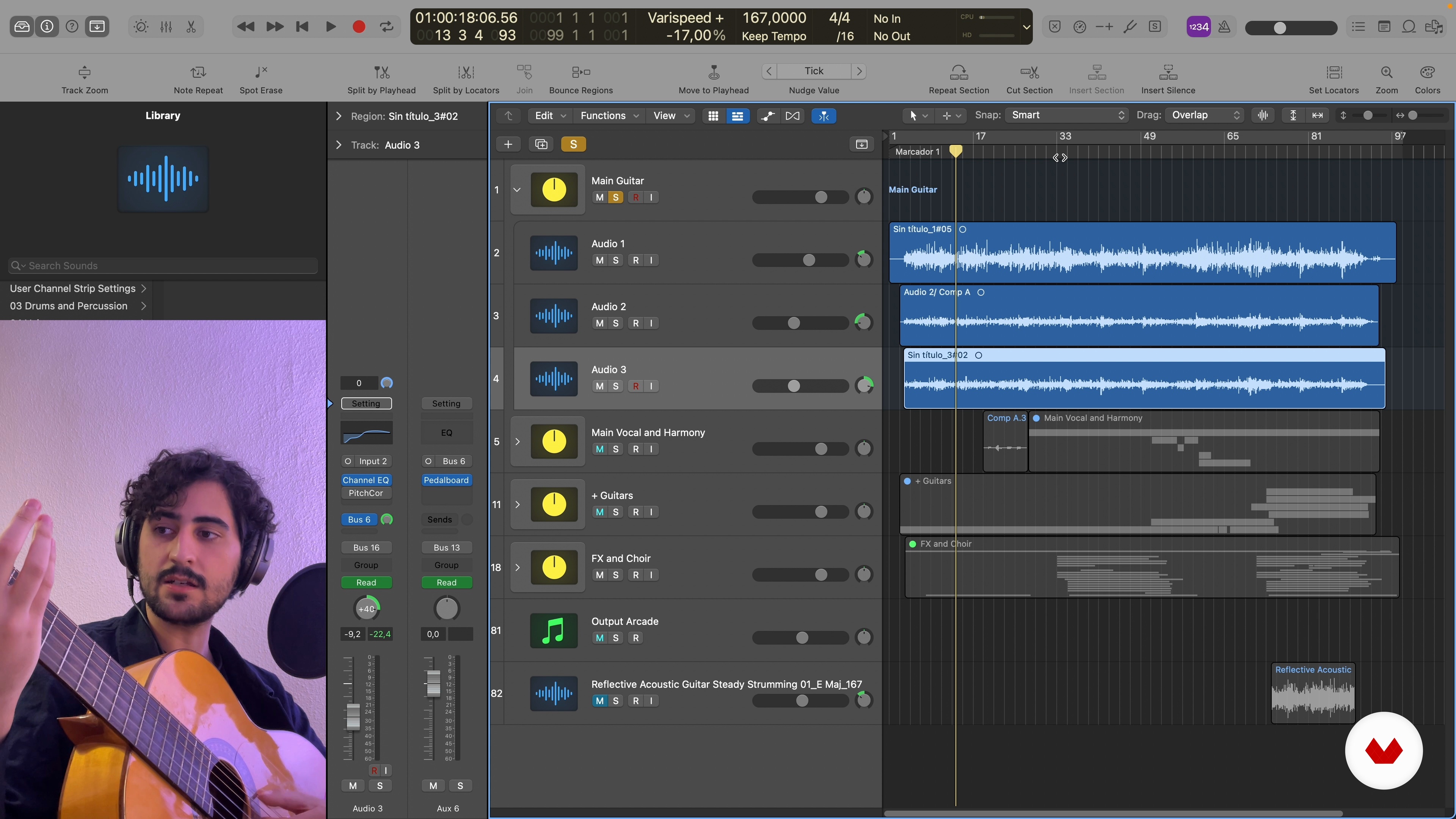 “Okay, so to start, I'm going to show you this track of mine, it's called El Mundo Me Ve in Spanish, which means the world sees me. I'm gonna be showing you how I arranged this song for my guitar playing. and how I even added more guitars. Over here. You can see there's the main guitar. which I recorded three times, one main guitar recording. And then two other ones. That basically do the same So this is how it sounds like. gets the guitar, the main guitar line. Oh, no. with a lot of effects for sure And by the way, I will be showing you what I'm playing on the guitar. in case you cannot see...”