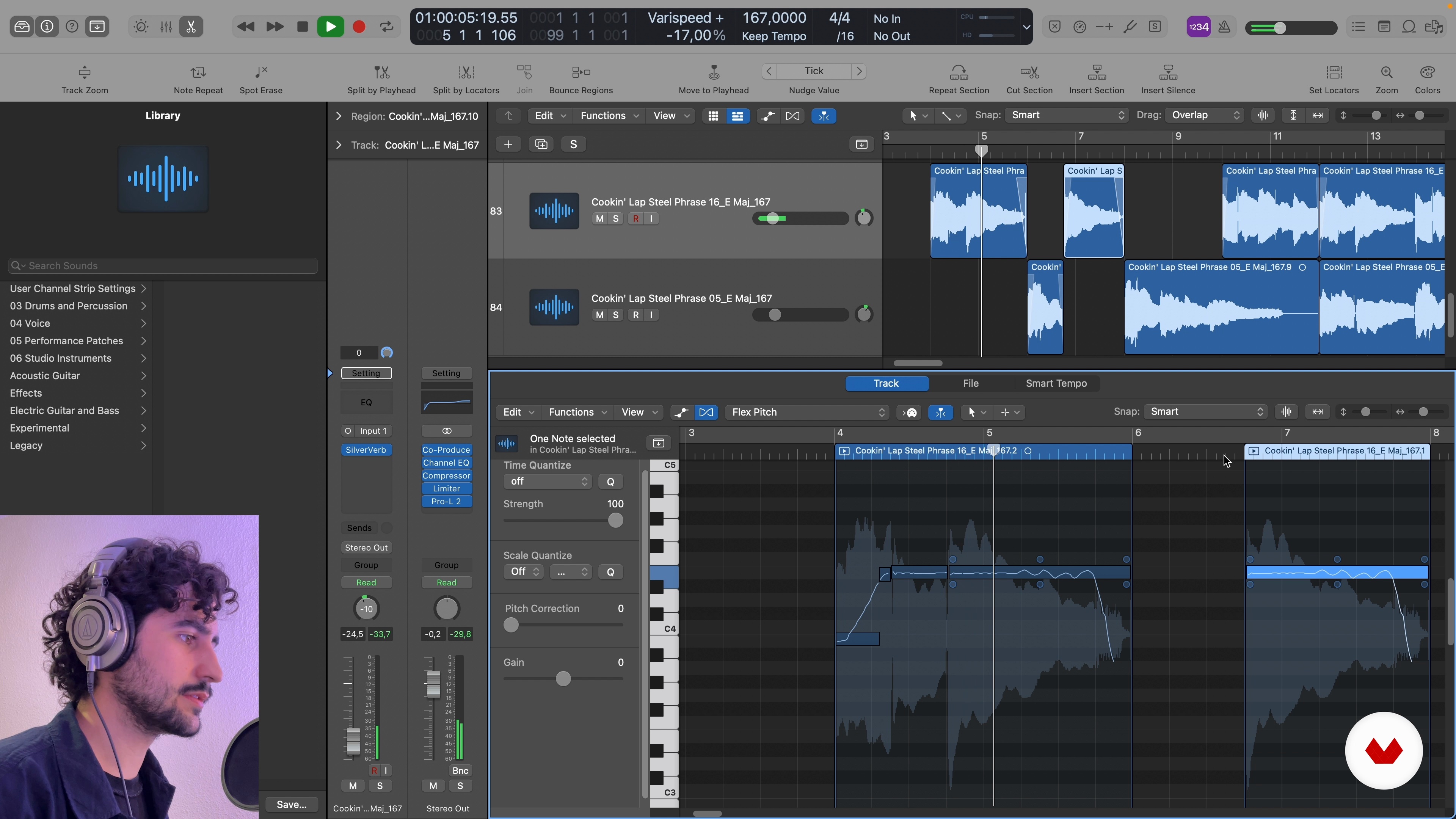 “You will use Co-Producer inside Logic Pro to generate guitar samples that match your song’s key and mood. You will drag, loop, and layer phrases, then reshape them with reverb, panning, fades, and pitch edits to build atmospheric melodies that stay coherent and non-repetitive.”