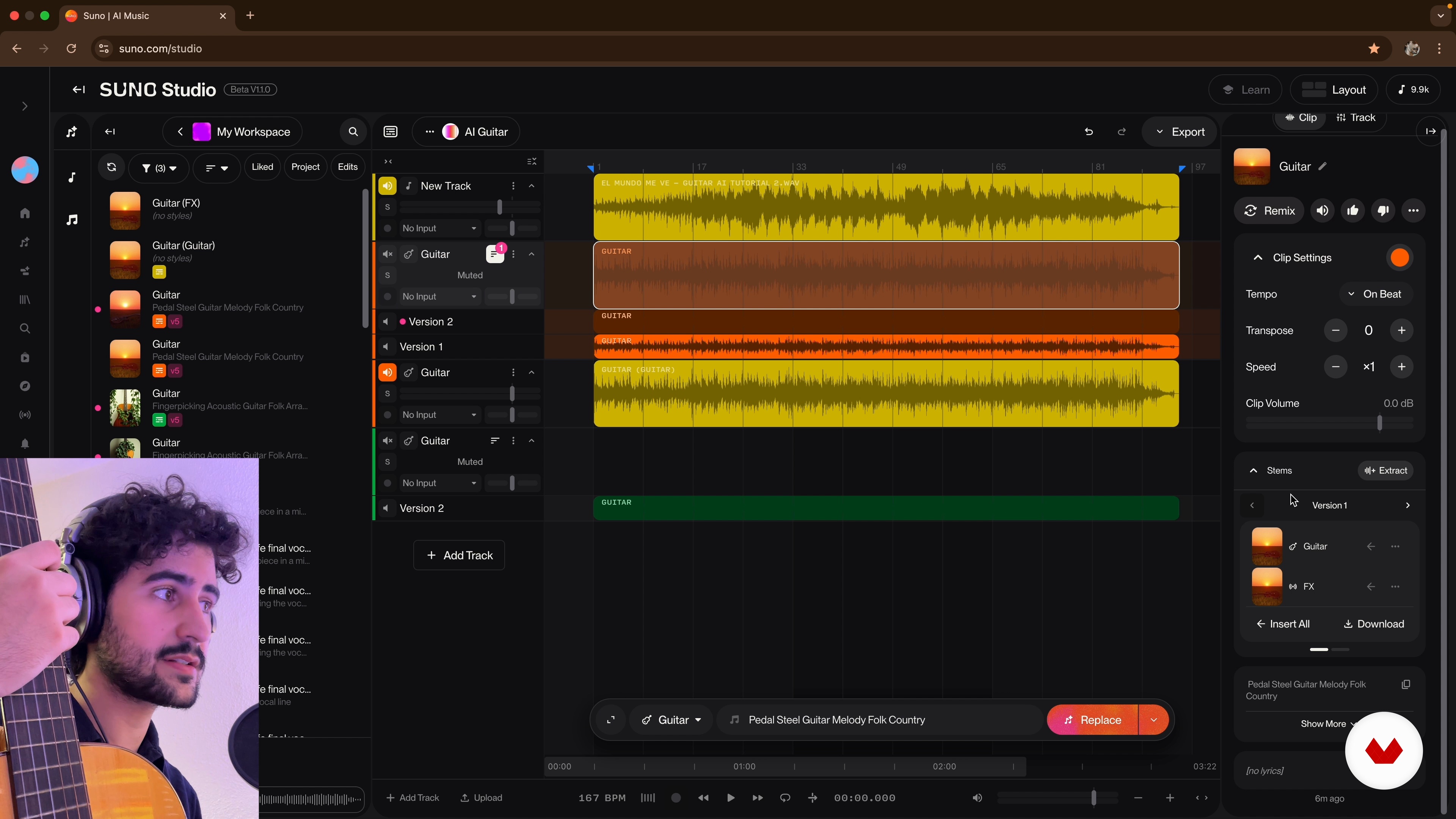 “Okay, so I showed you how I arrange my guitars in a track, in a song of mine. I also showed you how Cup Producer can help you get new ideas of AI guitar arrangements. We did two of them or three even. One, having the AI is starting the brand new idea. that we then complemented with my real guitar. And then we can also use Suno studio. We are going to bounce. our song. without any of the extra guitars. We're only going to send the main guitar, and then the vocal. And then we're going to see how only with those two elements The AI can come up with arrangements that fit the whole song. Let's d...”