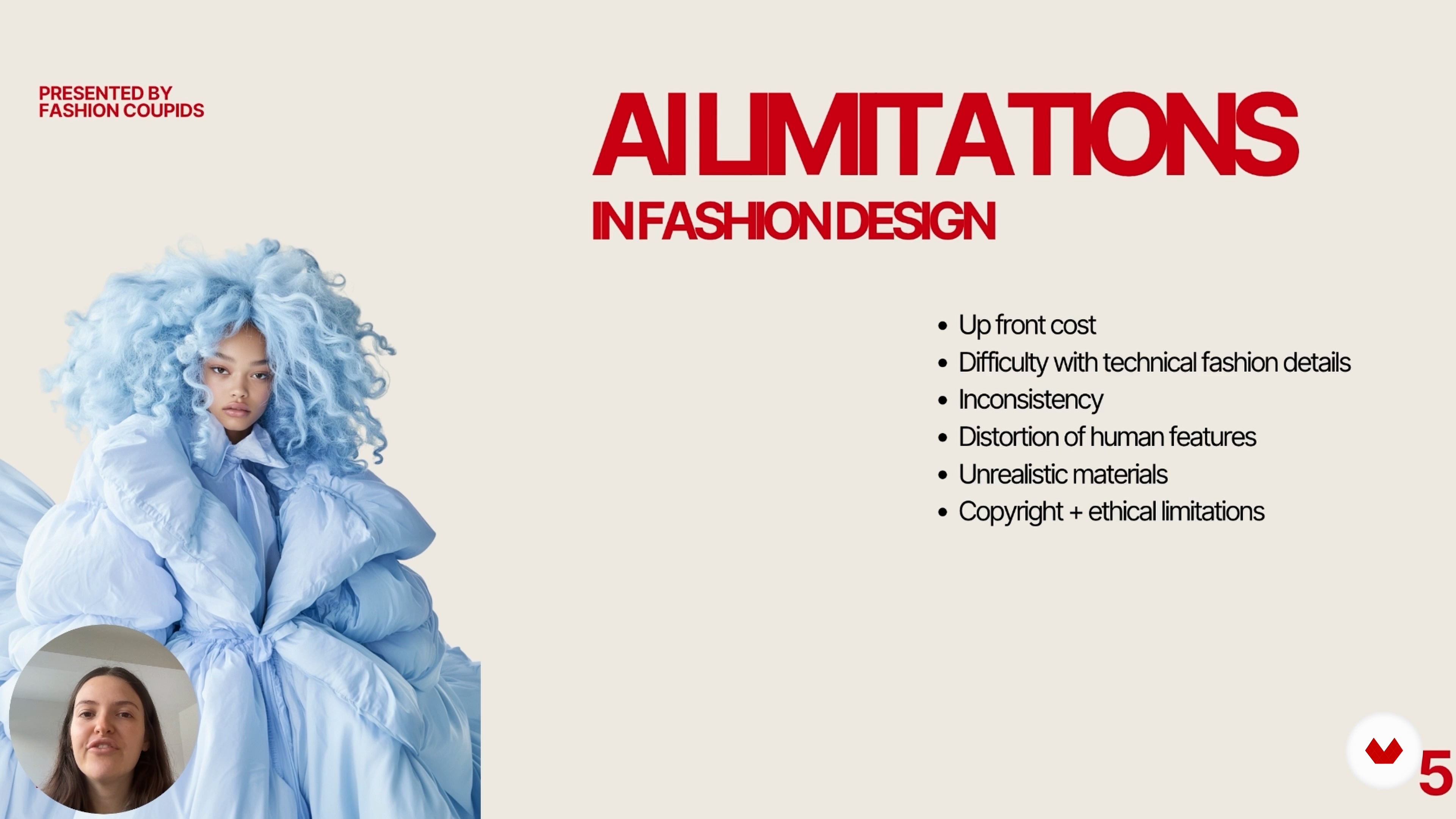 In this video lesson Fashion Coupids addresses the topic: Capabilities and Limitations of AI in Fashion Design, which is part of the Domestika online course: Create Fashion Designs using AI. Explore AI fashion design with ChatGPT Midjourney create patterns sketches realistic model views cohesive collections.