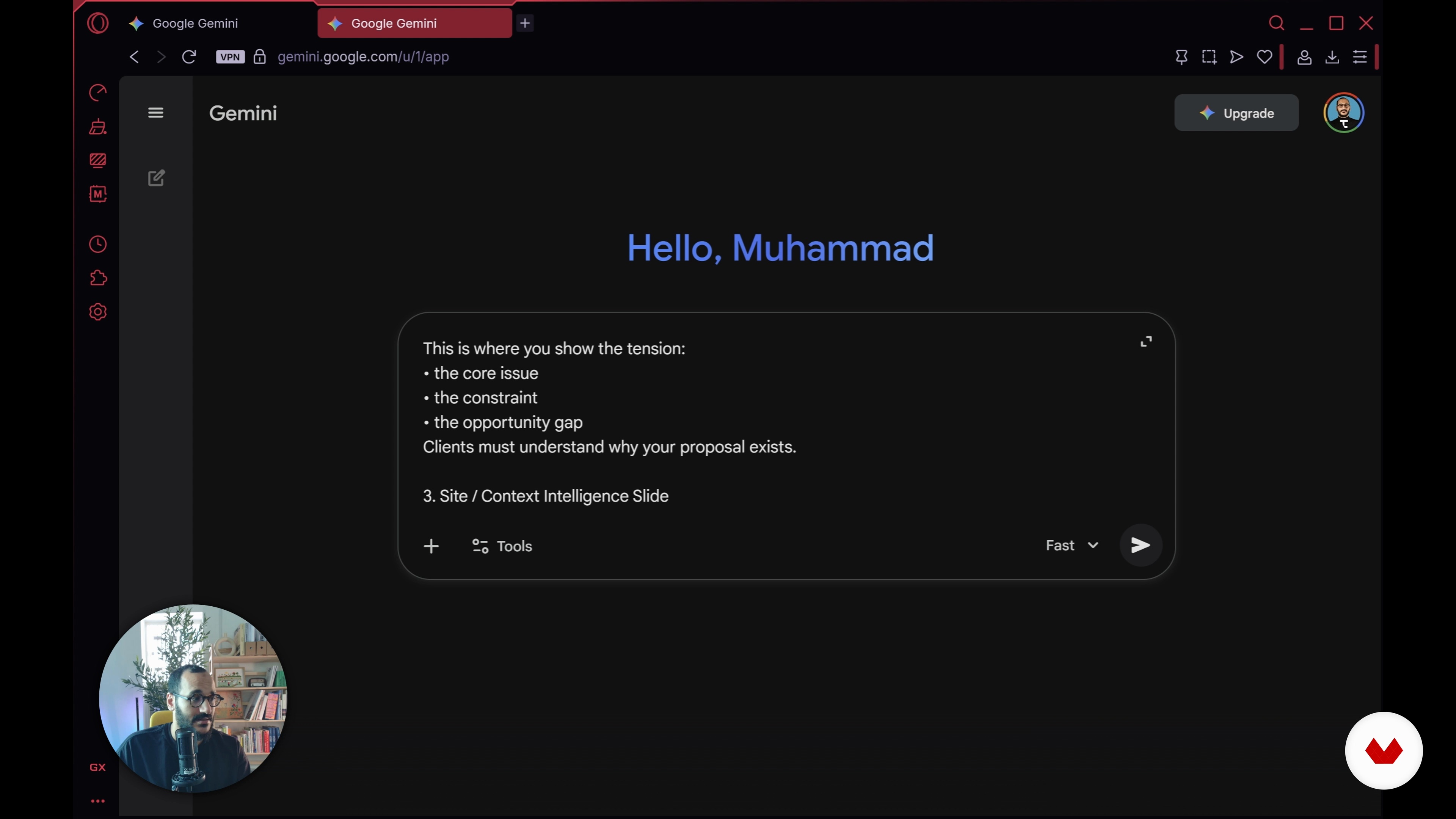 “In this lesson, we are going to learn a very important technique, which is the eight structural templates that we can use as a base template for any slide that we are going to design in our client decks or different presentations, different proposals. So we have eight types of slides. We're going to use Gemini's help to create not only the slide design but also the prompt that is going to generate this design, okay? So not to waste the limitation of the thinking, we can use the fast and have in my side notes the types of slides that I want. Each office or each architect has their own system...”