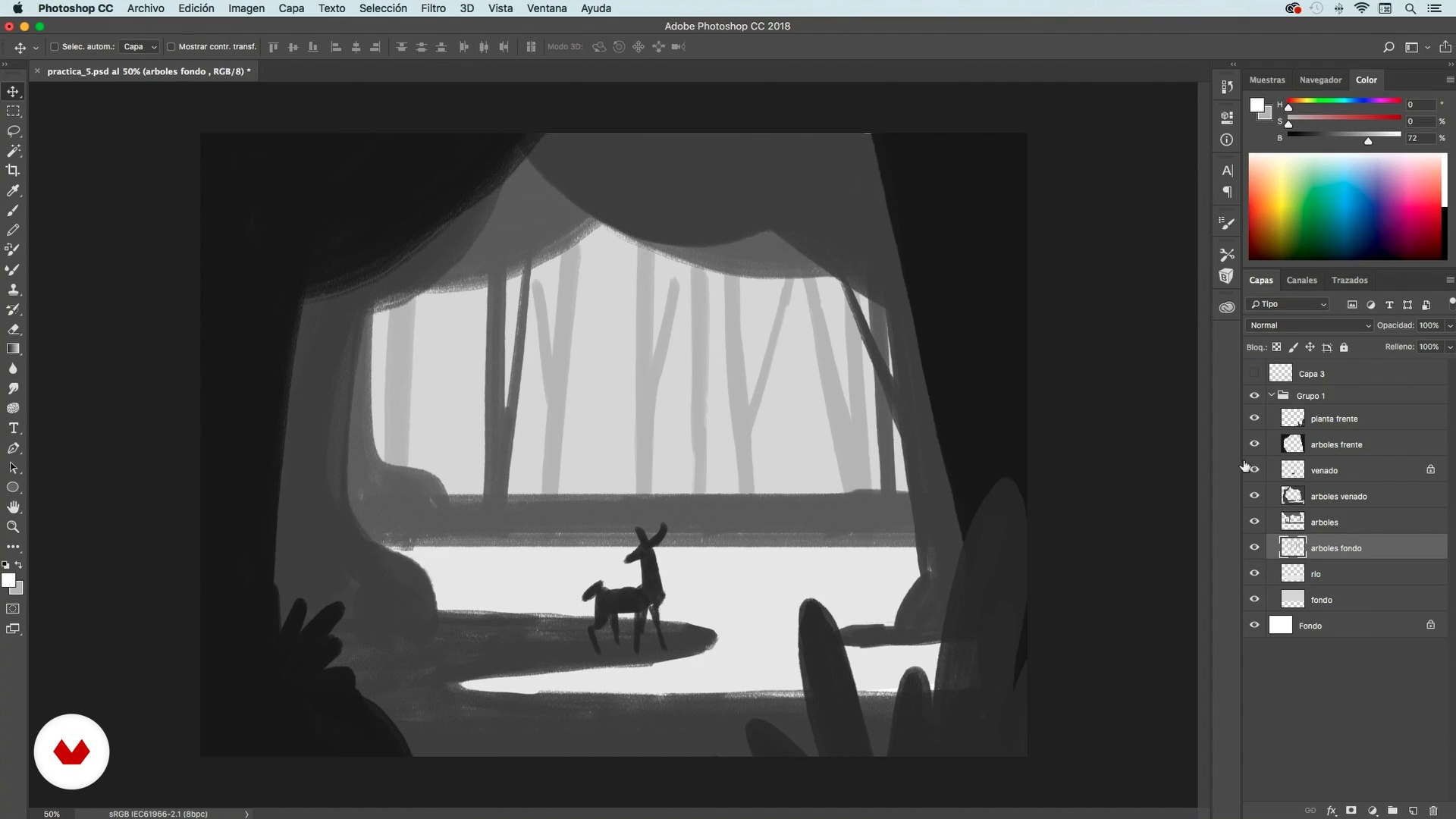 “PHOTOSHOP FOR ILLUSTRATION COURSE 5 LESSON 5 Practice: Create your own illustrated scene In this lesson we will practice what we have learned to create an illustration. We will talk about styles and tips to improve illustrator skills. Let's practice. For this practice, I will work on a scene. I started with my scale of values to organize the illustration plans a bit. I have the separate elements in the layers panel and everything is in grayscale. I just took a textured brush and I made big blocks for each plane to have them separate and define priorities. I'm still wondering whether to leav...”