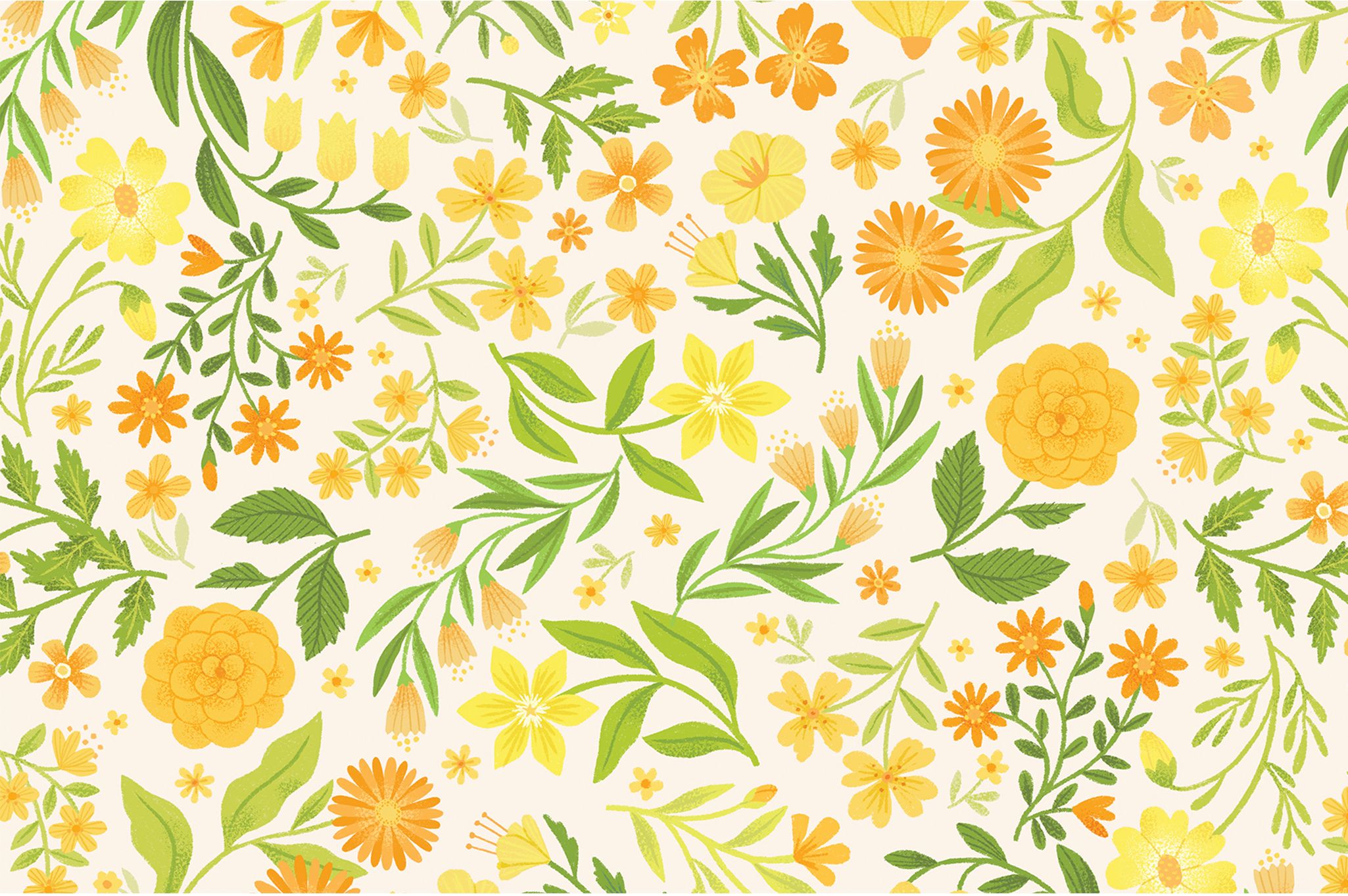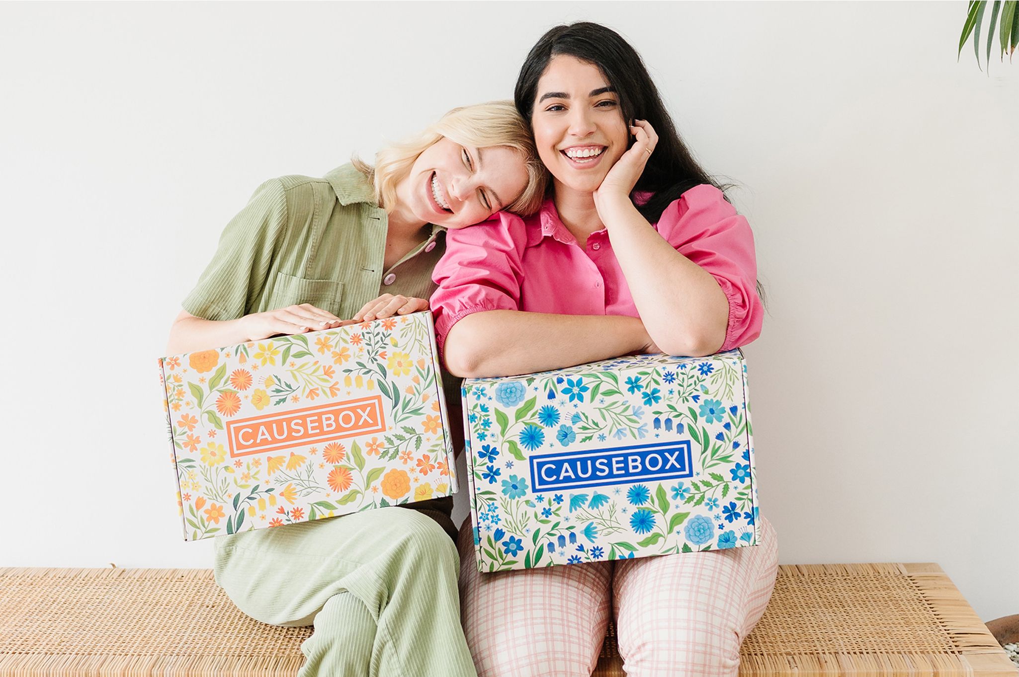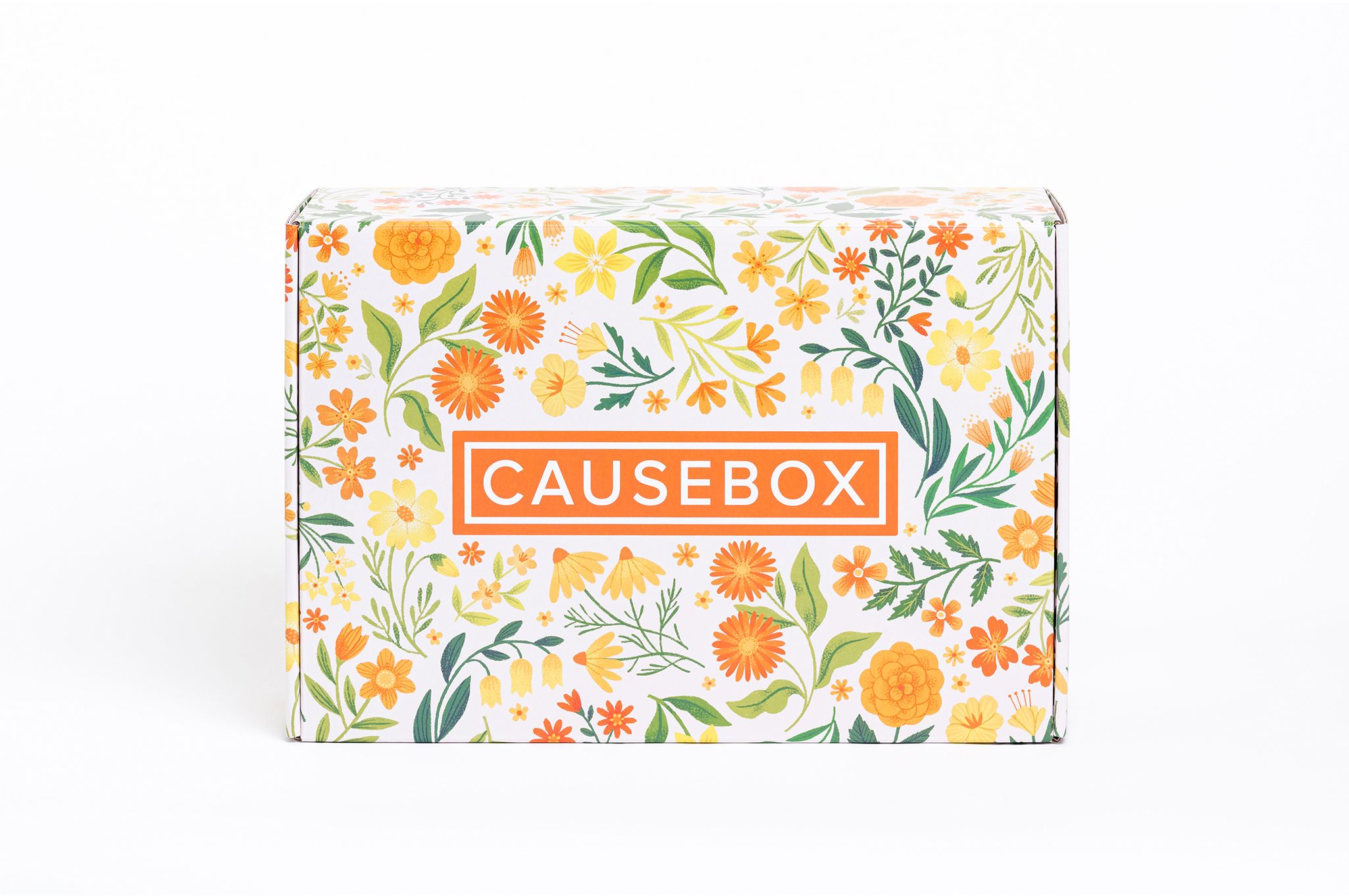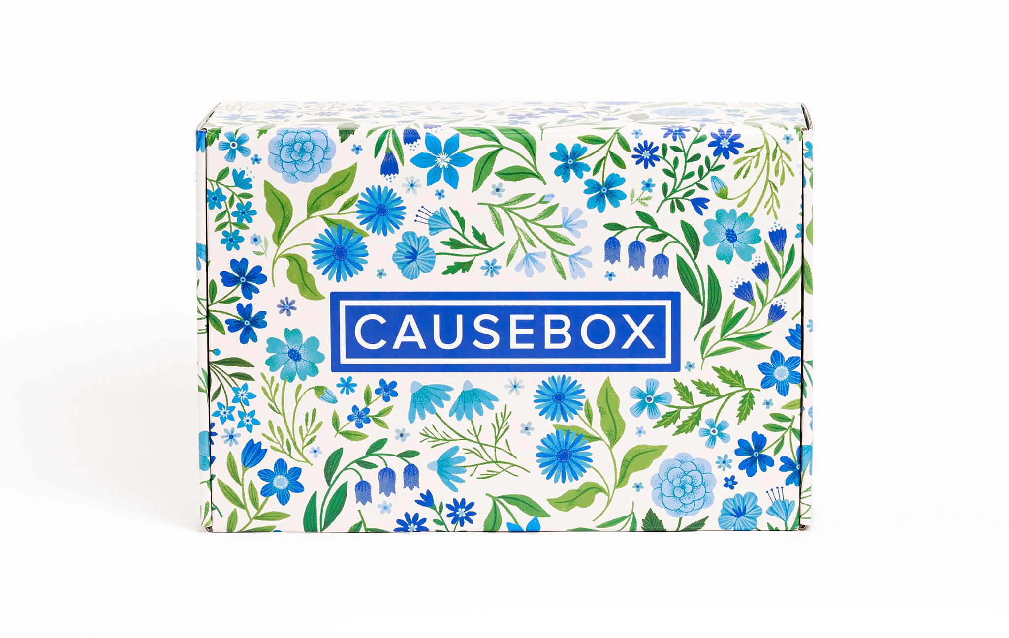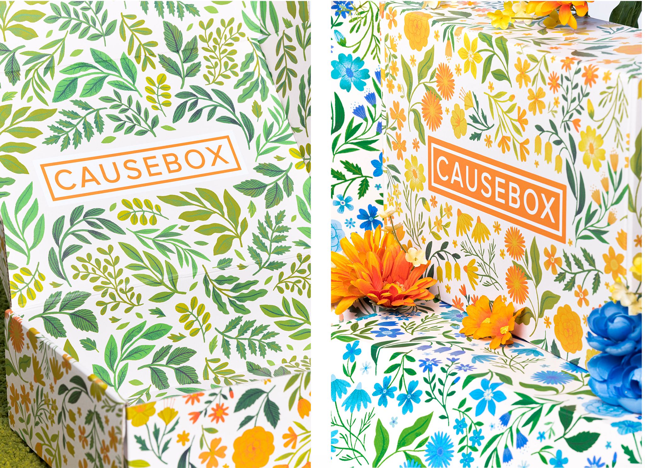 Dainty flowers and leaves patterns designed for the interior and the exterior of Causebox Spring 2020 Welcome Box in two different colour palettes.