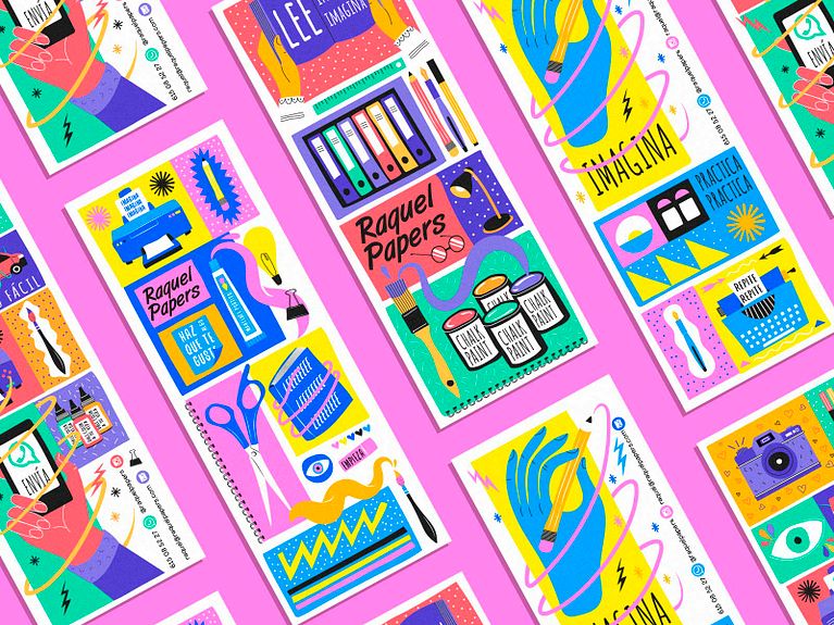 En la búsqueda de un lenguaje apropiado para este diseño vimos que un trazo libre y gestual hacían de estos puntos de libro un objeto muy expresivo y coleccionable. Creamos una serie de ilustraciones que encajamos en un formato vertical a modo de puzzle en el que hay un claro juego de colores, letras y formas. La intención, a parte de dar a conocer los servicios y materiales de los que dispone la papelería, es la de inspirar a sus futuros dueños a experimentar con materiales, a leer más y perderle el miedo a jugar a ser artistas.