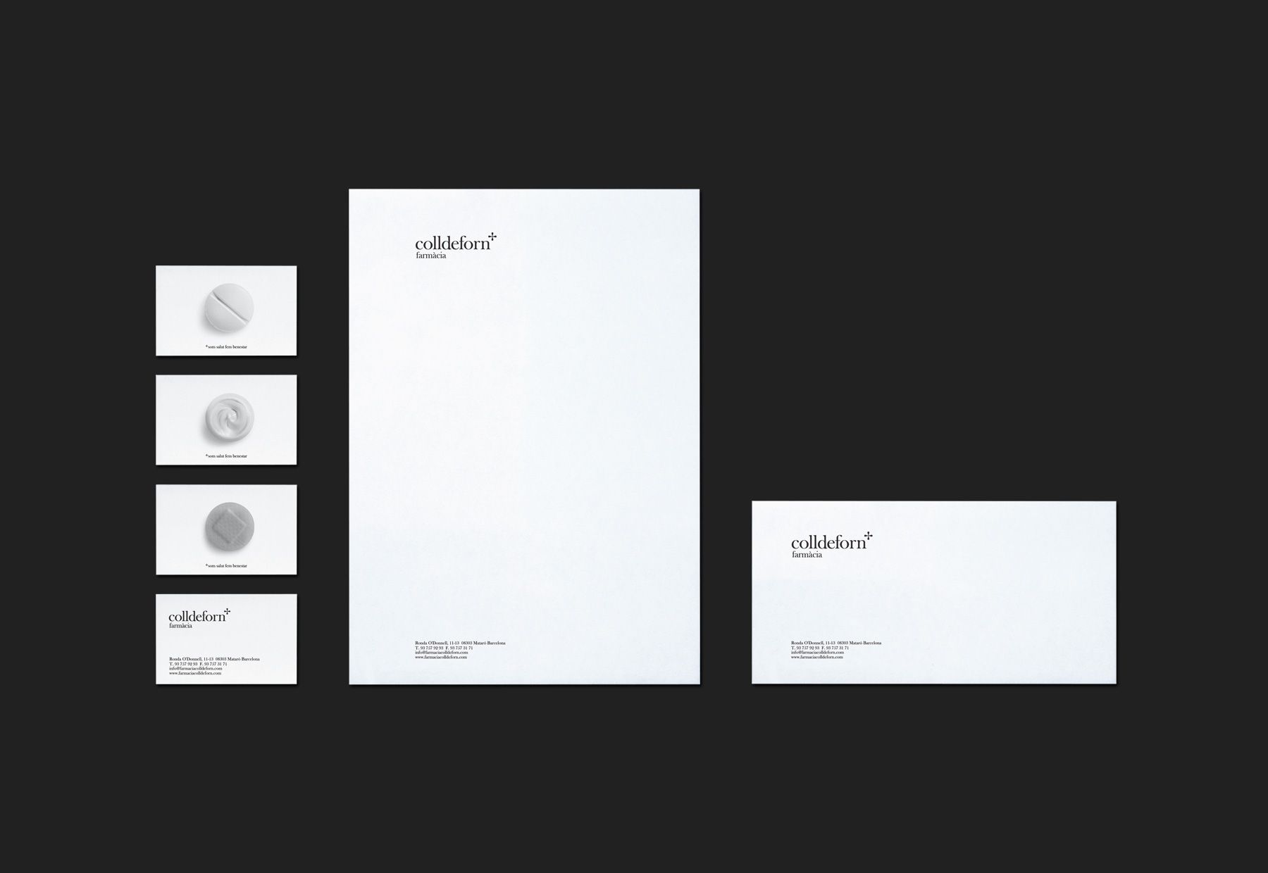 “Colldeforn” es una farmacia histórica que se propuso renovar radicalmente su imagen. El objetivo era alejarse de la clásica gráfica farmacéutica, por lo que se optó por reinventar la característica cruz dándole un halo erudito, que remitiera a la vertiente humanista del oficio de boticario. Cliente: Farmacia Colldeforn.