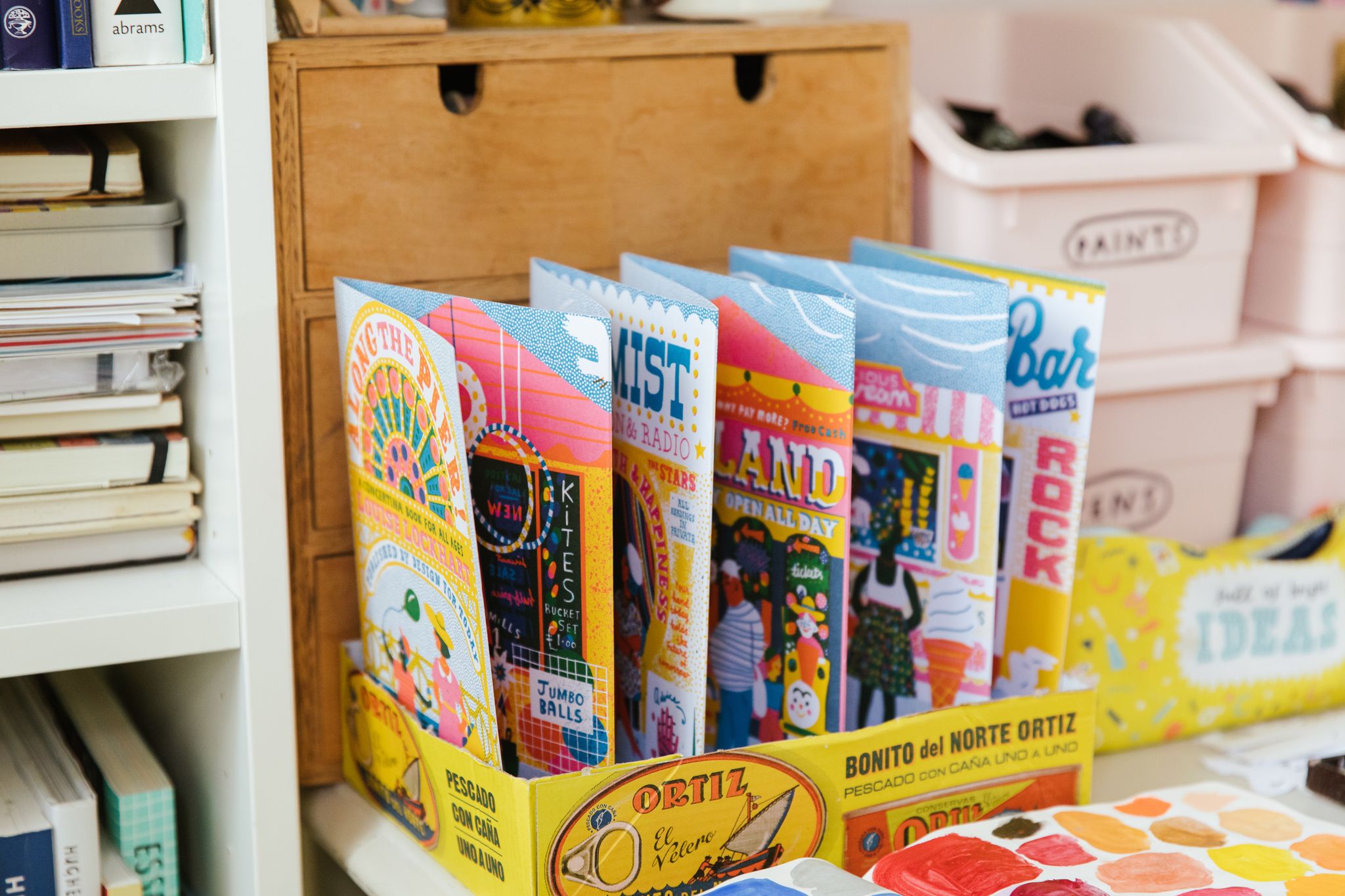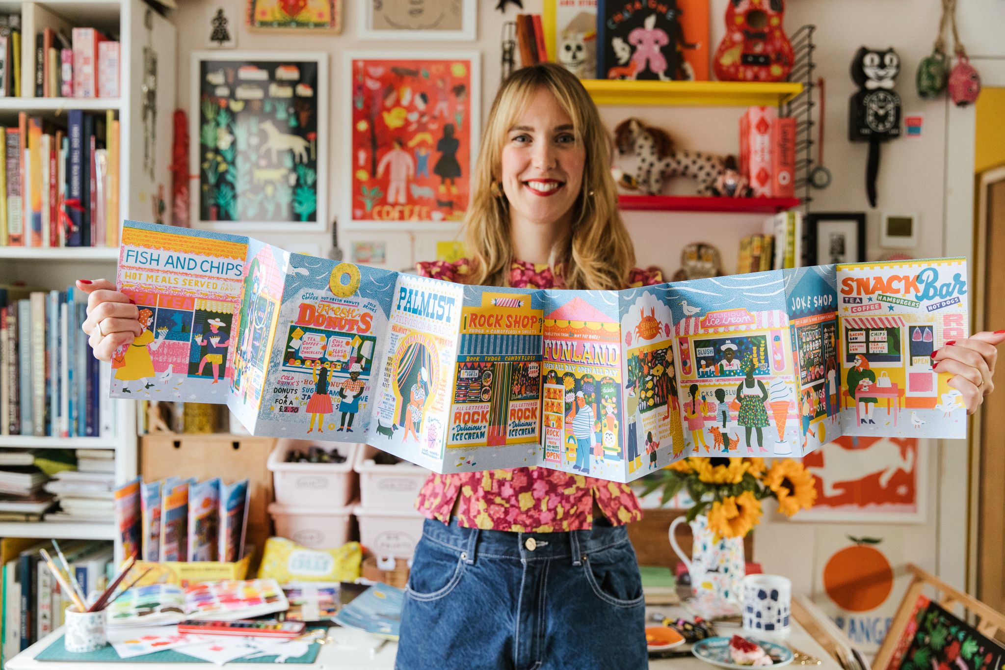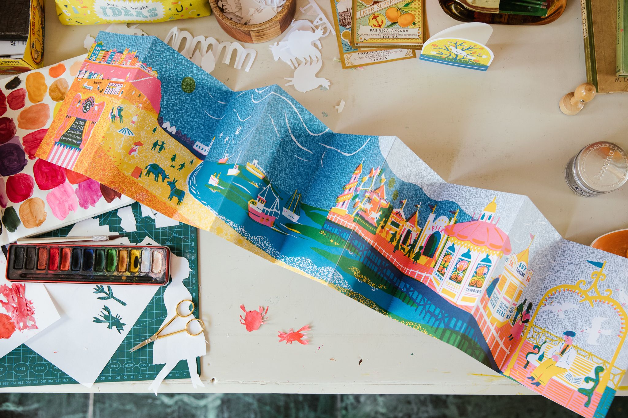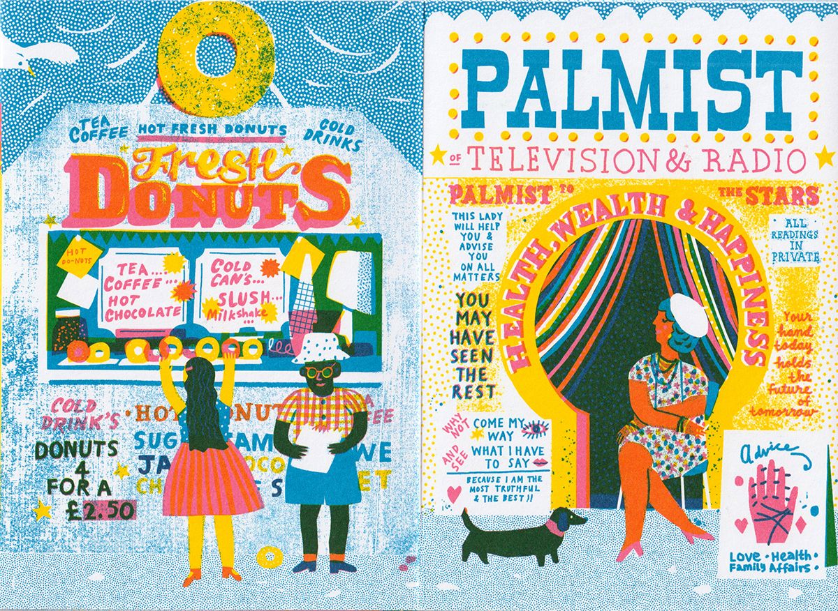 I created Along The Pier, a concertina book showing classic British seaside shops, published by Design For Today. I wanted to show a bit of my process behind the scenes too - I make my pictures using collage and paint, then scan them in and arrange them on Photoshop. This book was over two years in the making, as I collected photos of old shops and visited the Yorkshire and Lancashire coastline in the UK.