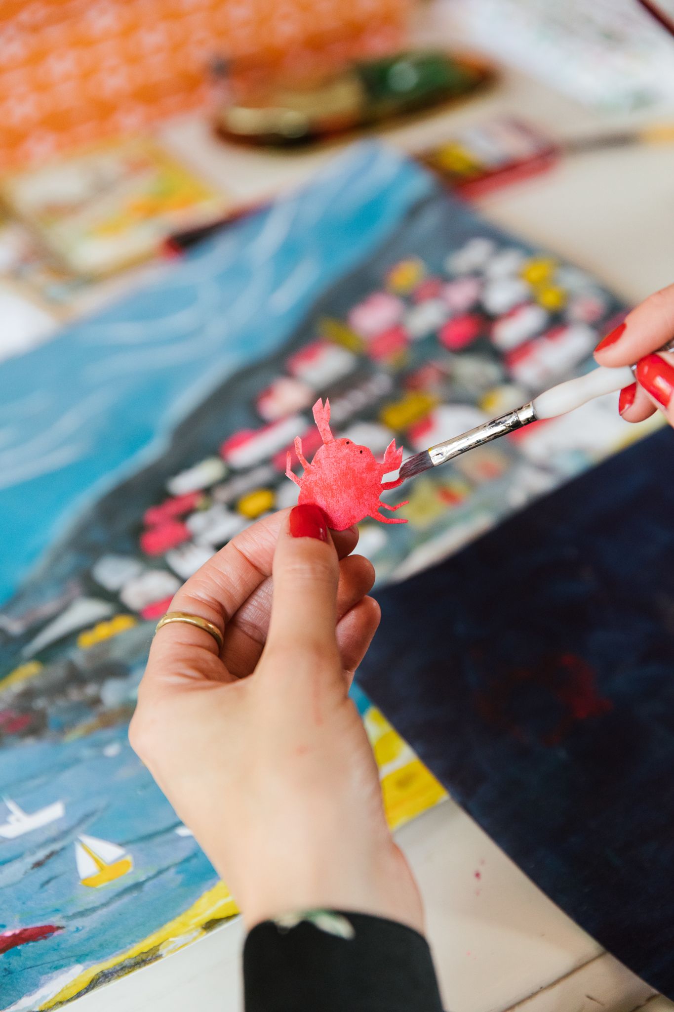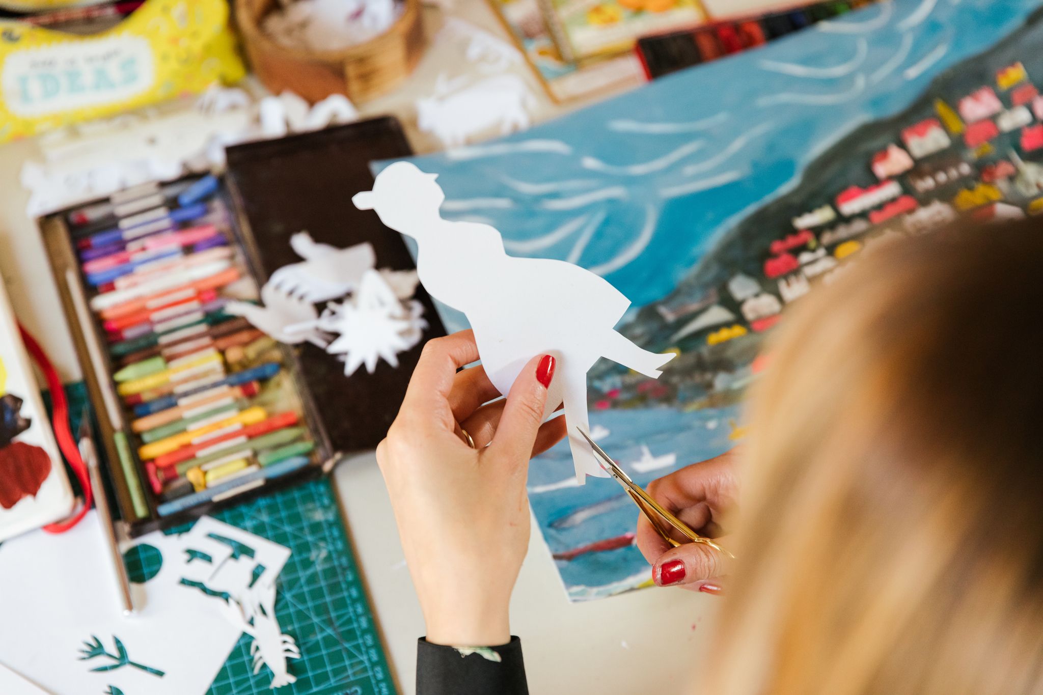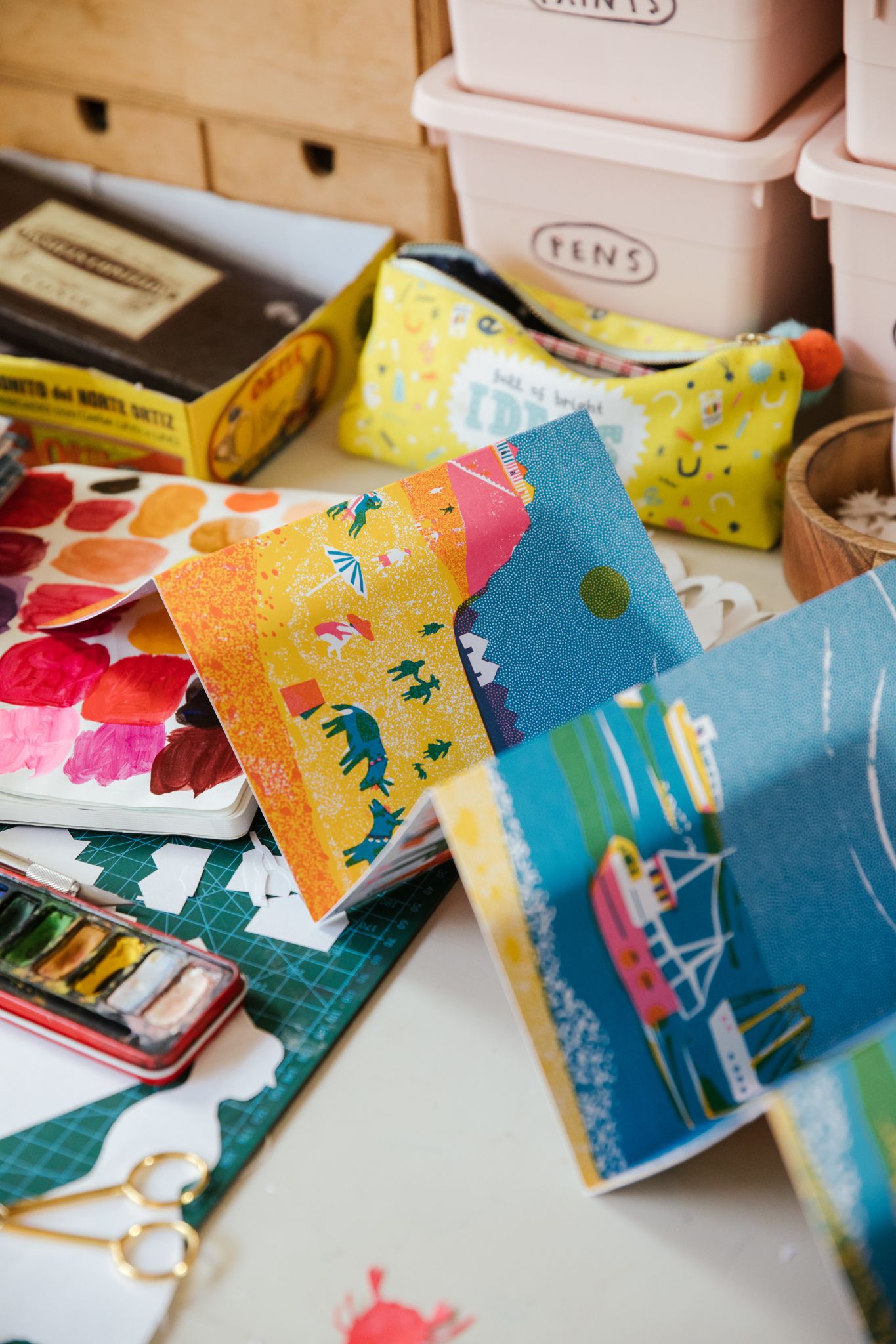 I created Along The Pier, a concertina book showing classic British seaside shops, published by Design For Today. I wanted to show a bit of my process behind the scenes too - I make my pictures using collage and paint, then scan them in and arrange them on Photoshop. This book was over two years in the making, as I collected photos of old shops and visited the Yorkshire and Lancashire coastline in the UK.