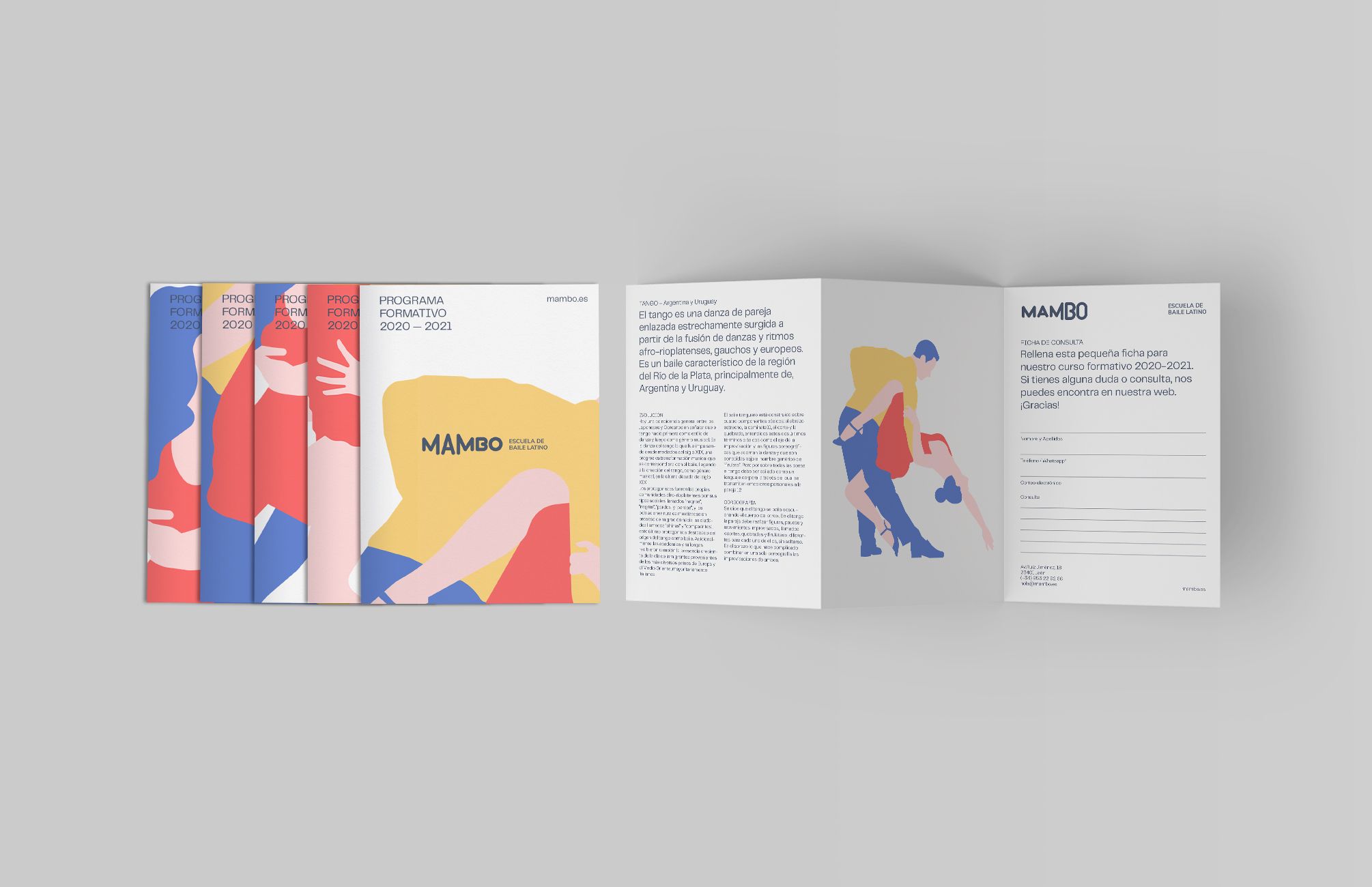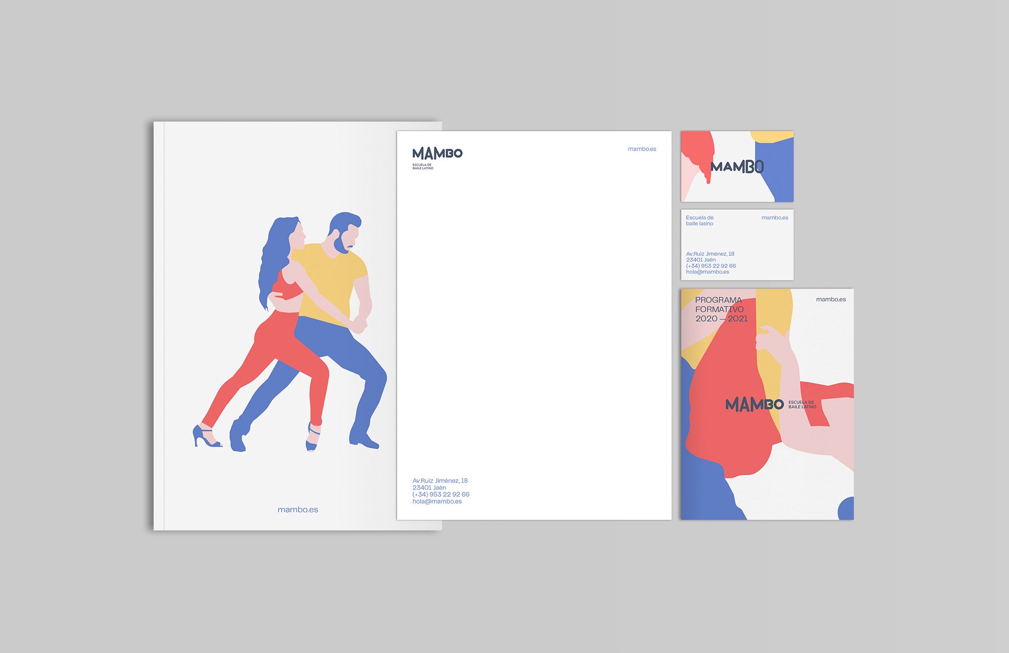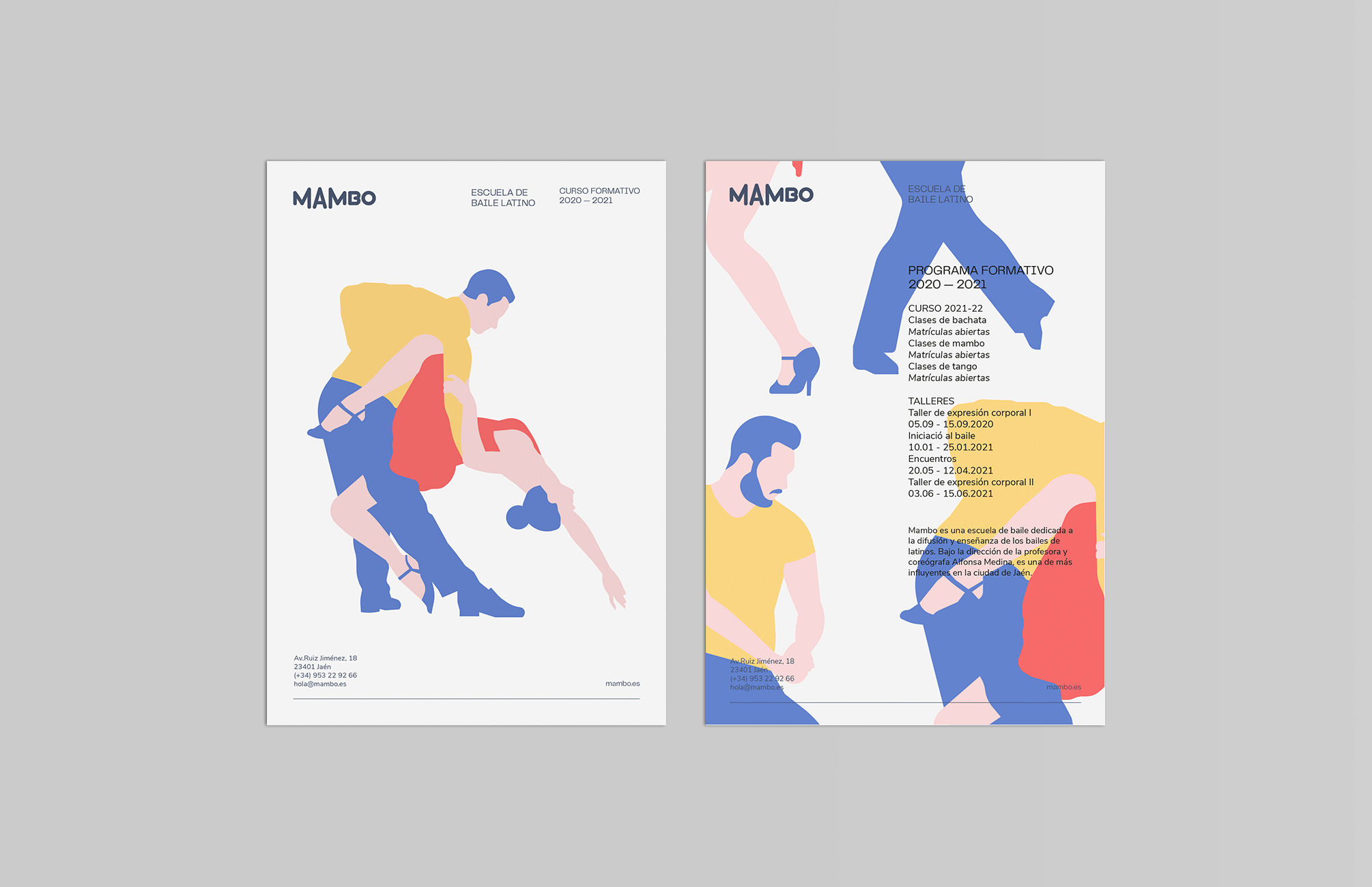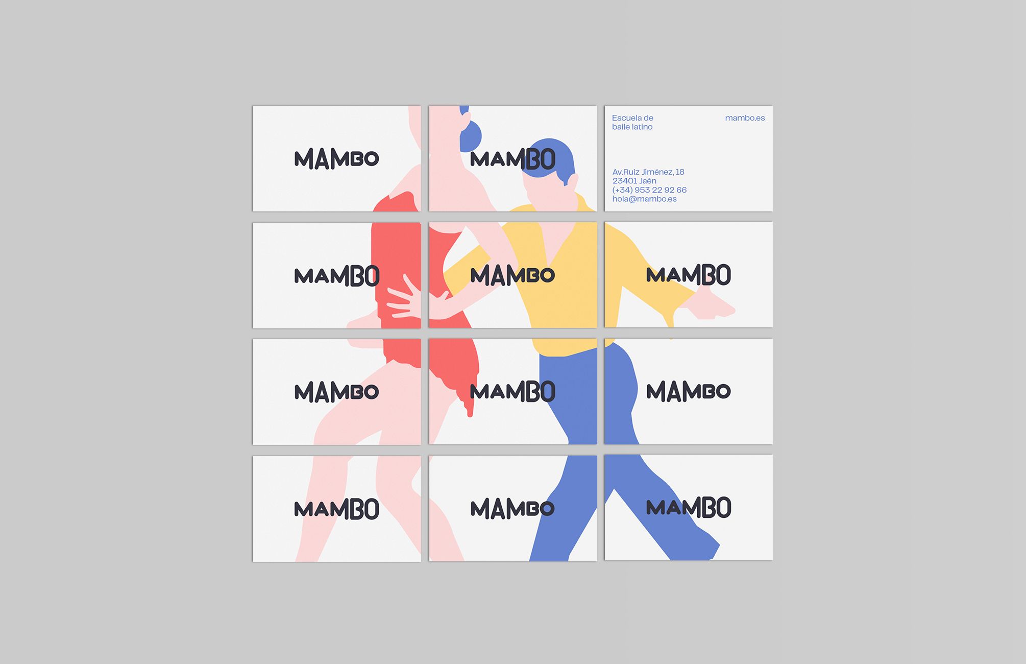 A raíz de la palabra Mambo vi que unas de las características más distintivas dentro de este tipo de baile es el grito clásico que se da al empezar y durante las canciones de este género musical. Para representar el grito gráficamente aumenté el tamaño de las cajas de sus tipos según la sílaba tónica de la palabra ¡Maaambo! Para el universo gráfico representé a través de las siluetas de los bailes, una serie de ilustraciones que genera un patrón orgánico y con movimiento, que acompaña a la imagen a lo largo de todas sus aplicaciones.