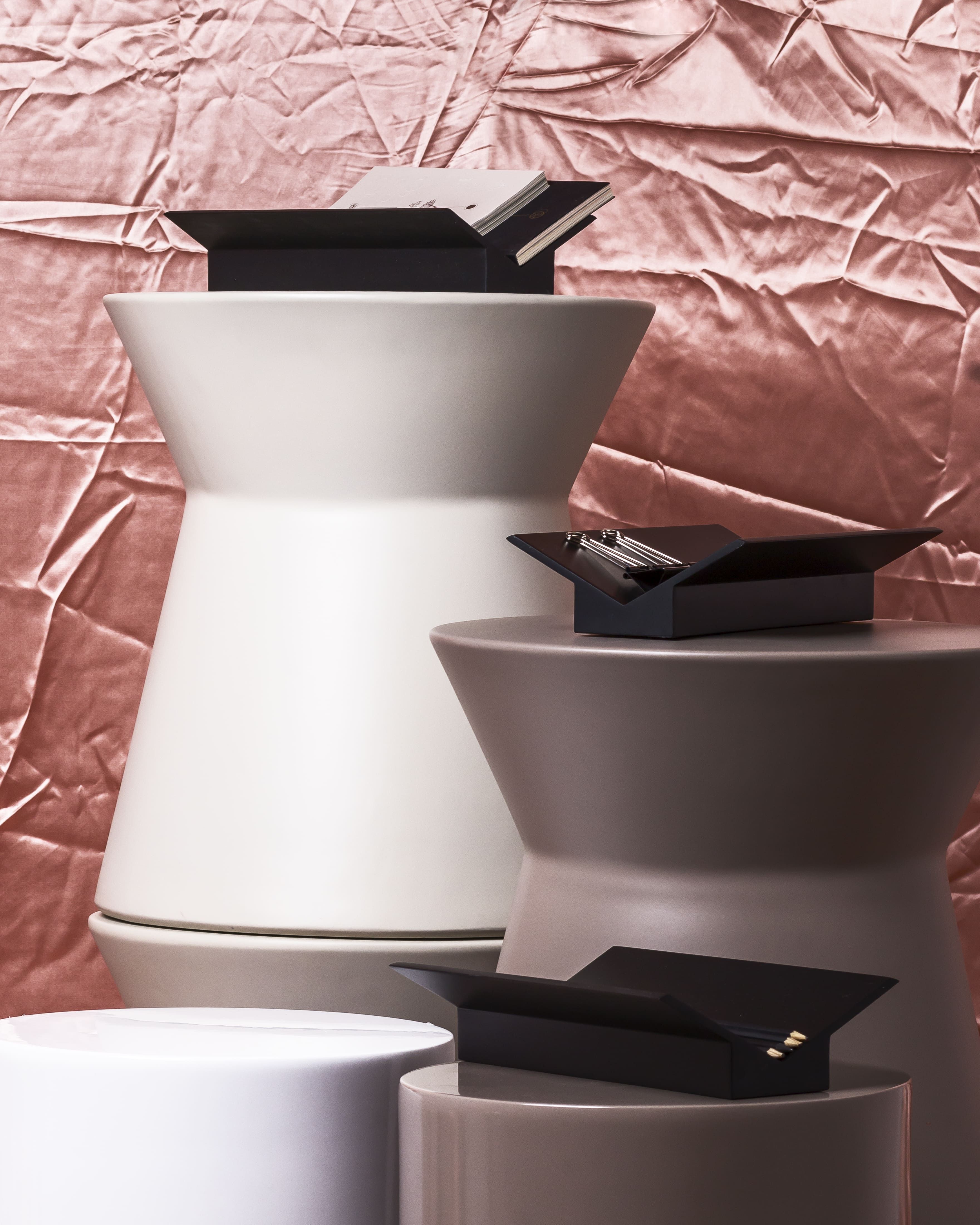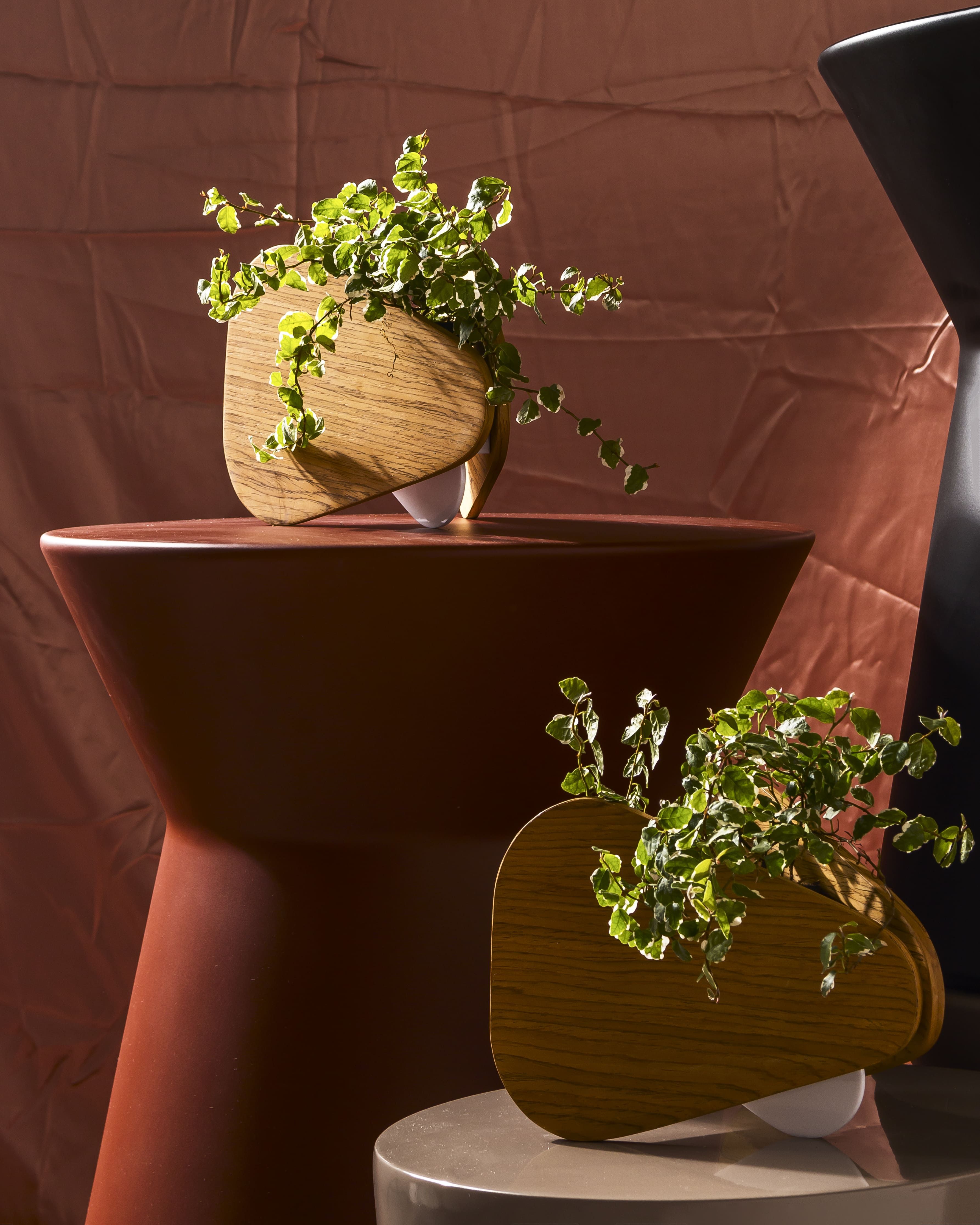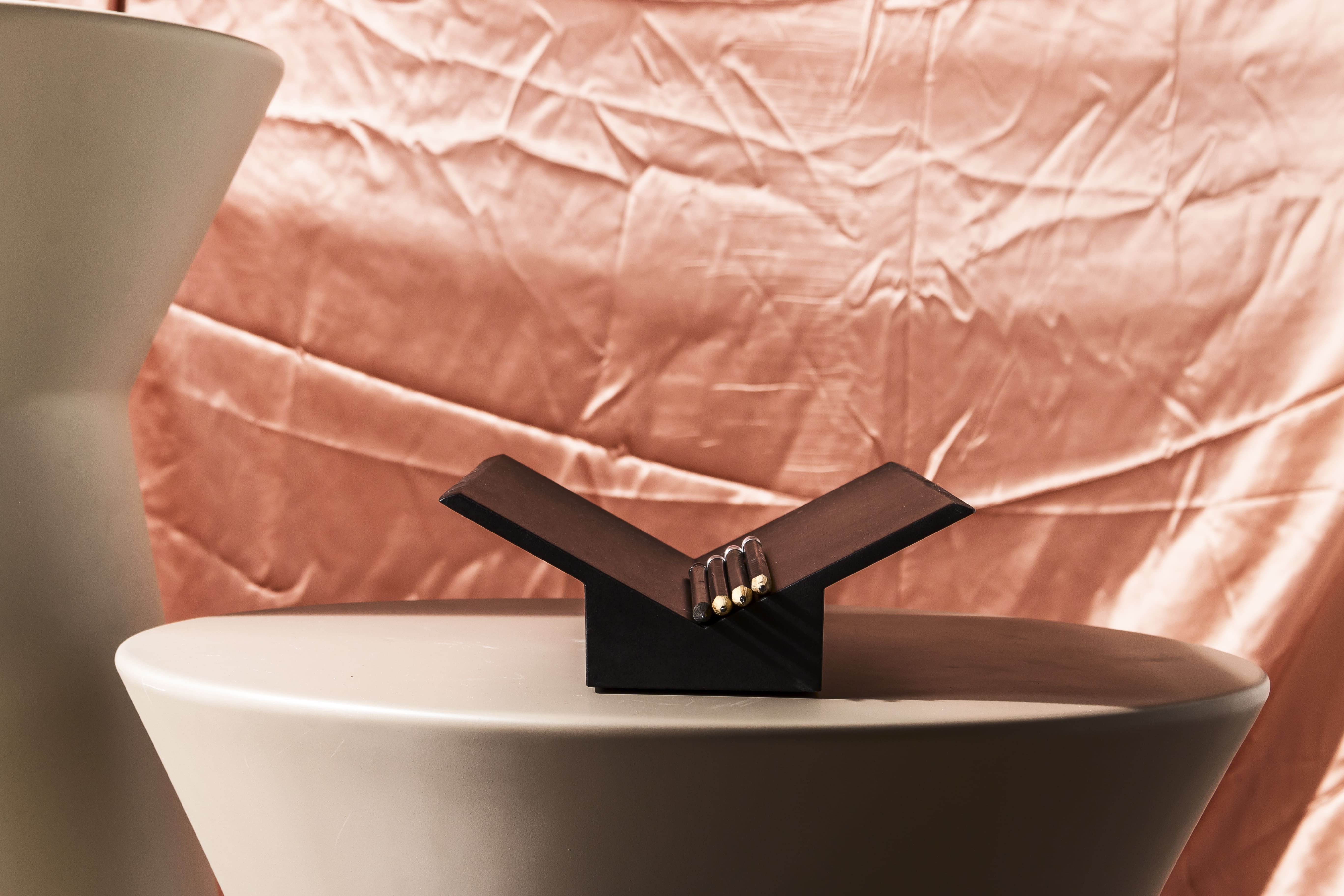 Todos os objetos com linhas retas, ângulos, inclinações e essa estética rígida porém delicada. União de matemática, história e poesia. Composta por um vaso e um porta objetos, as peças foram confeccionadas pela marcenaria Oldine, a Laca preta presente na primeira remessa pode ser substituída por qualquer cor dependendo do projeto.