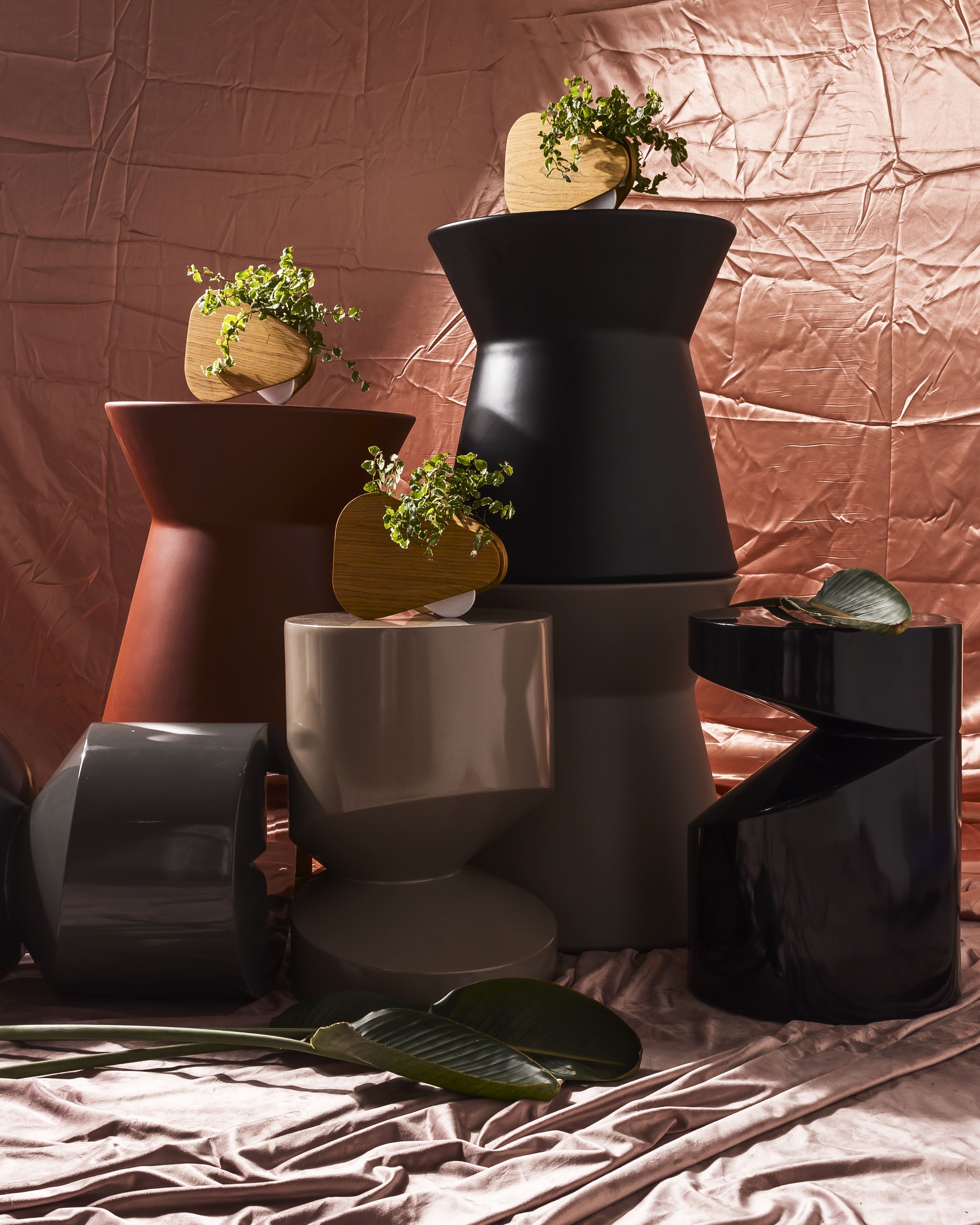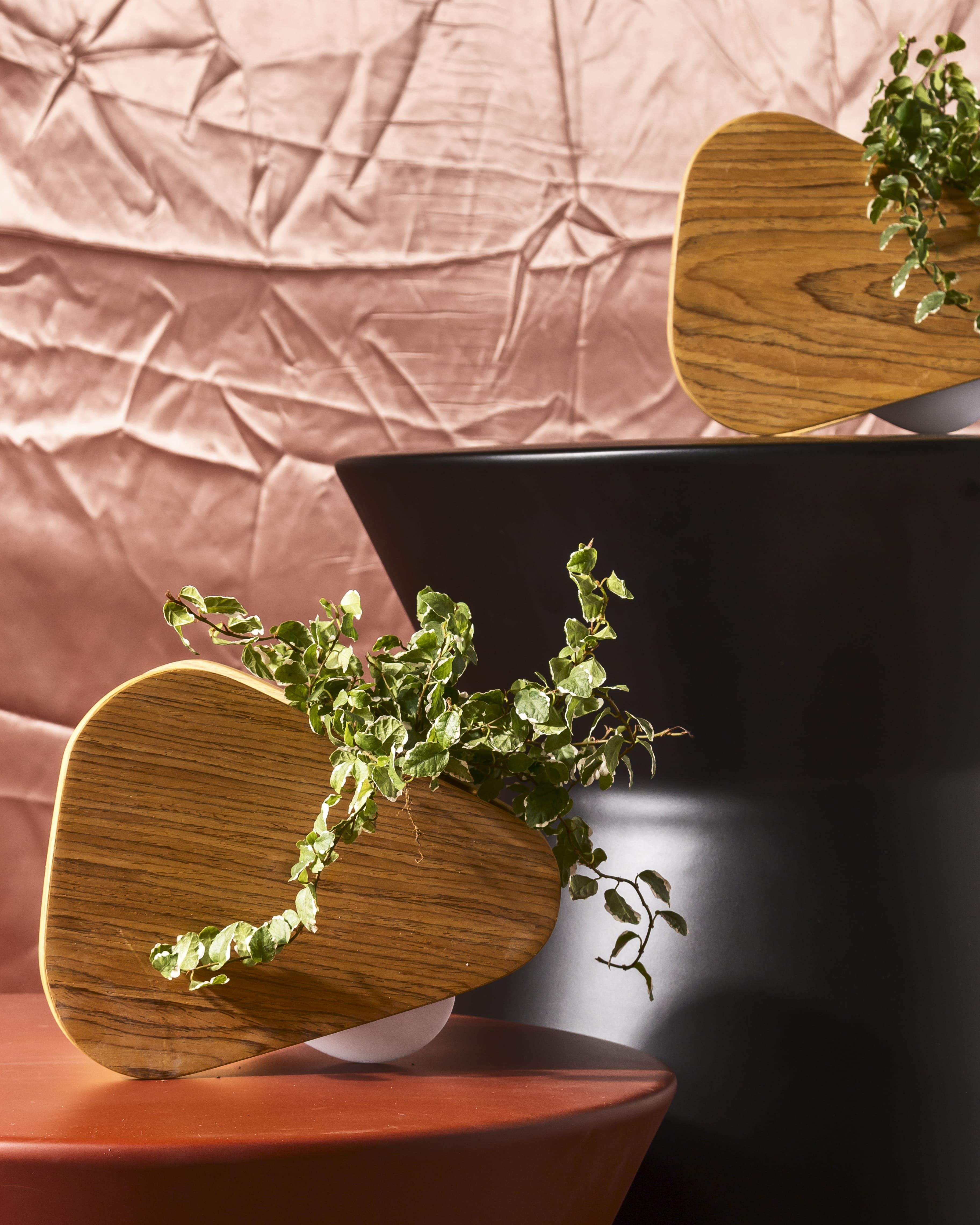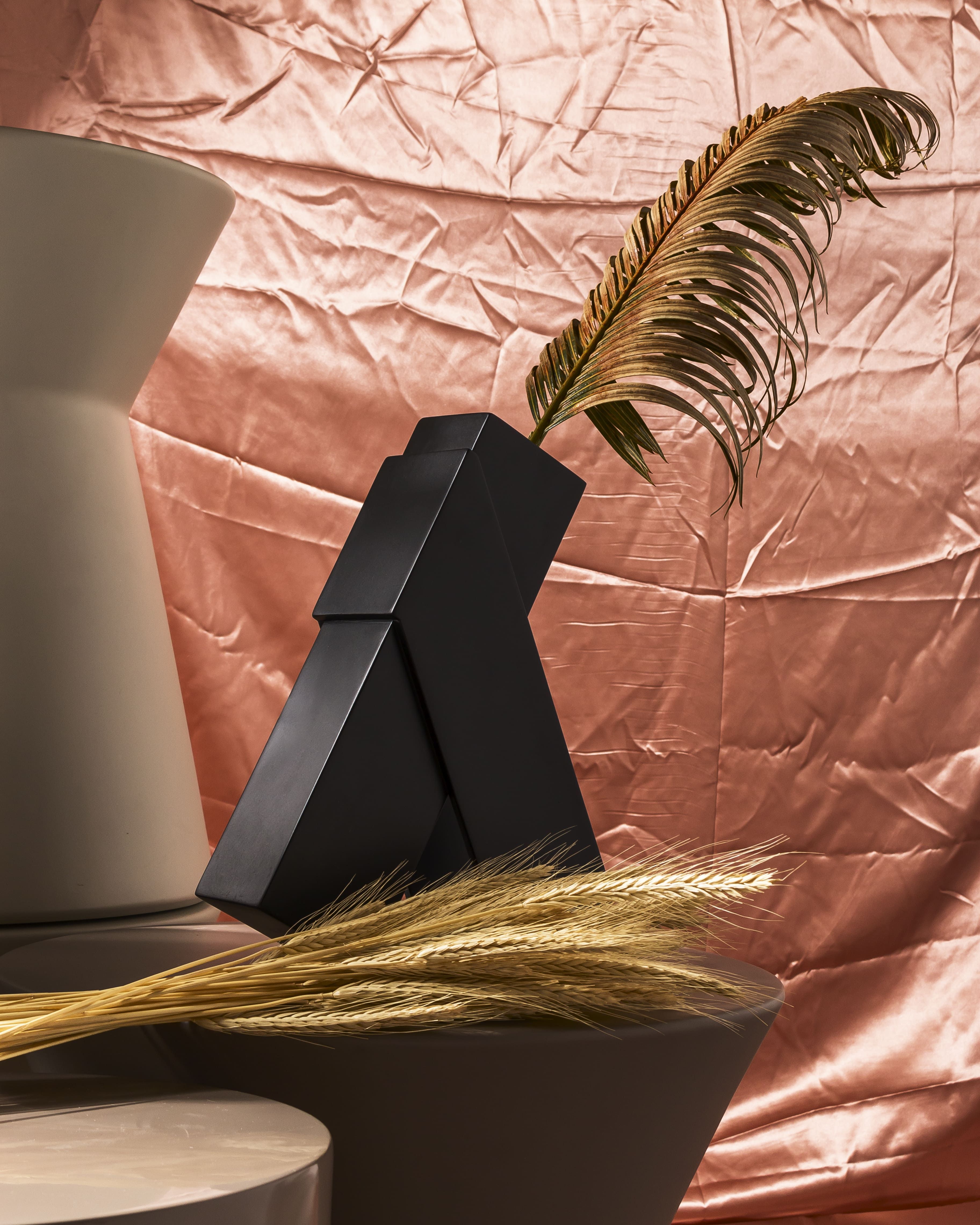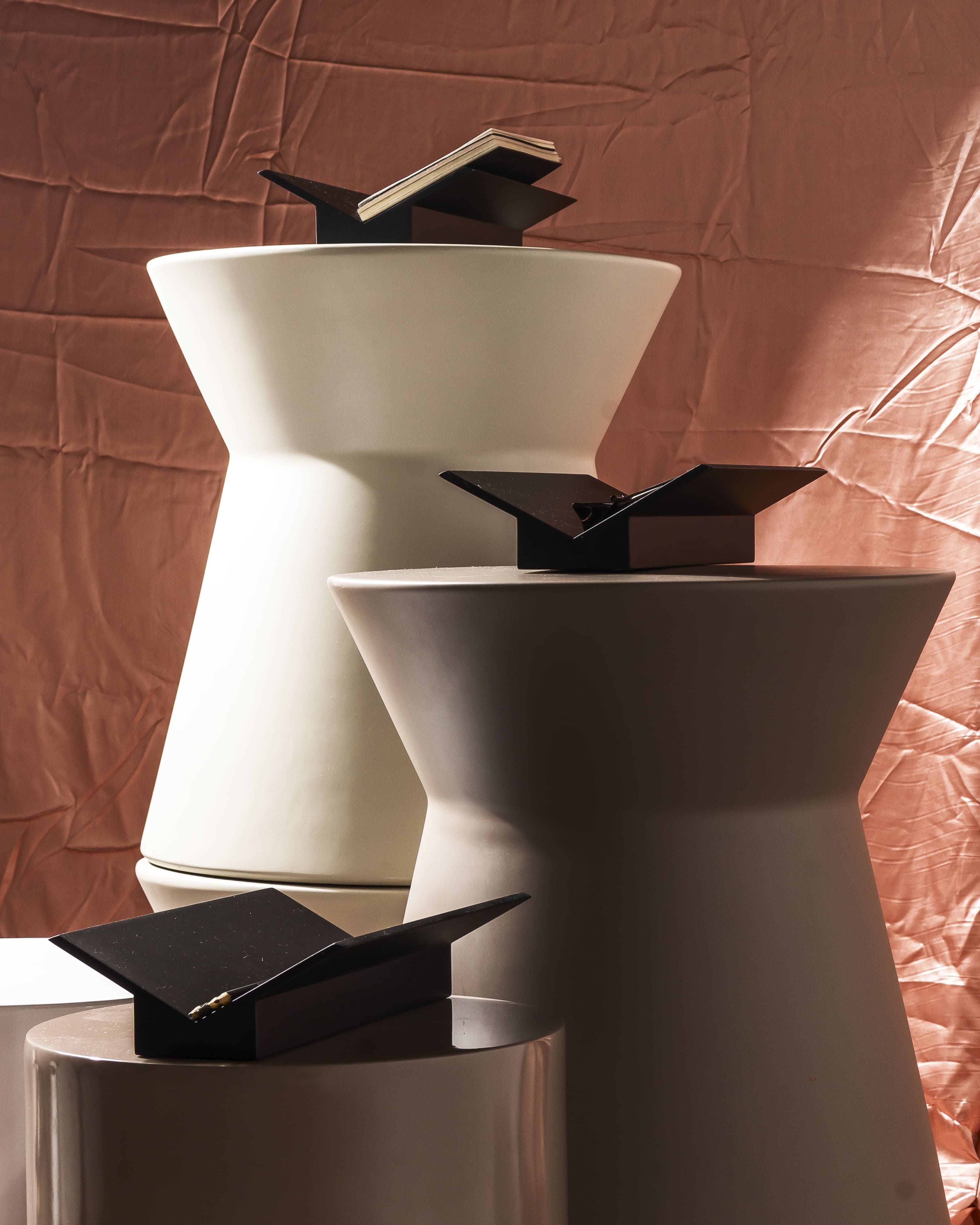 Todos os objetos com linhas retas, ângulos, inclinações e essa estética rígida porém delicada. União de matemática, história e poesia. Composta por um vaso e um porta objetos, as peças foram confeccionadas pela marcenaria Oldine, a Laca preta presente na primeira remessa pode ser substituída por qualquer cor dependendo do projeto.