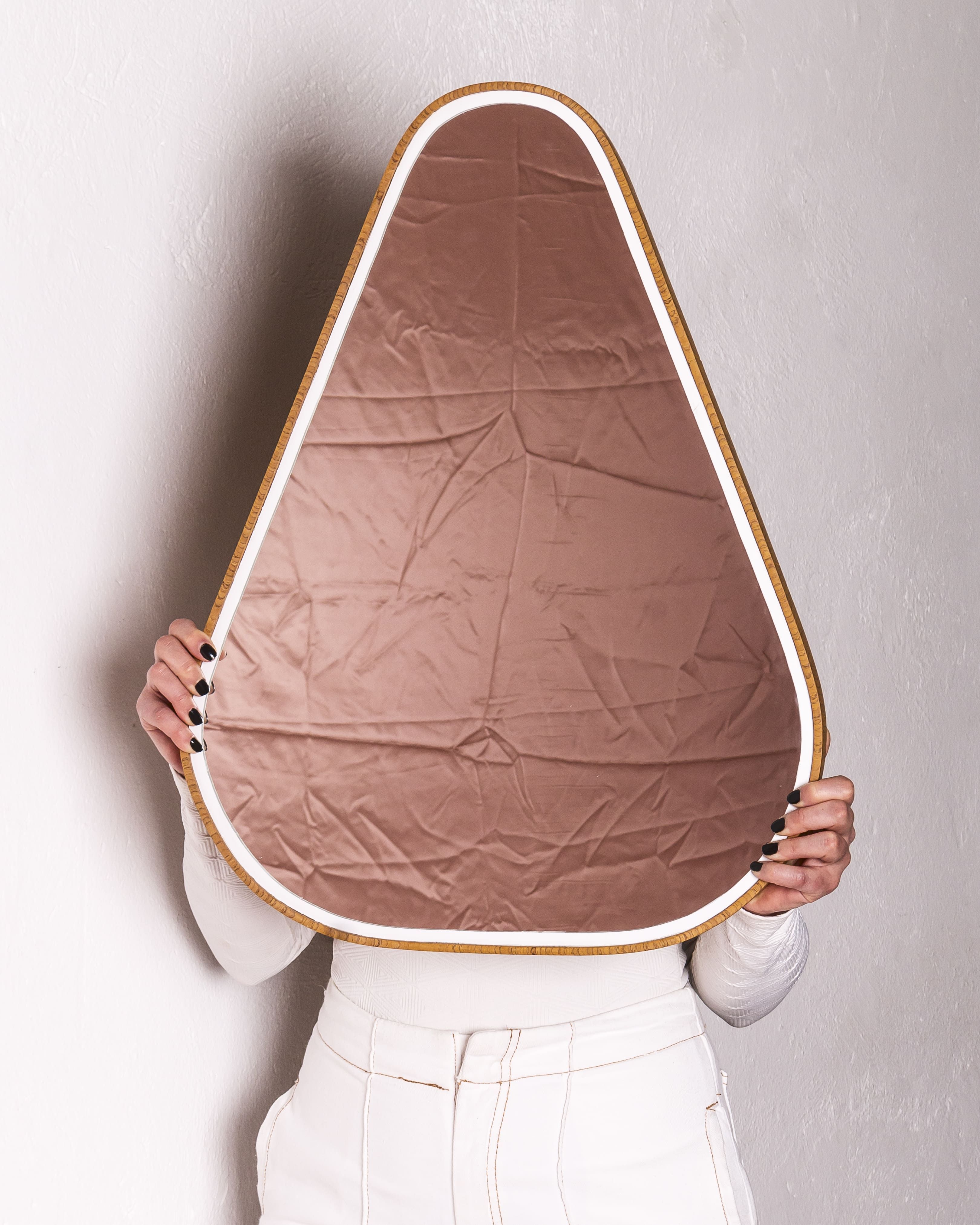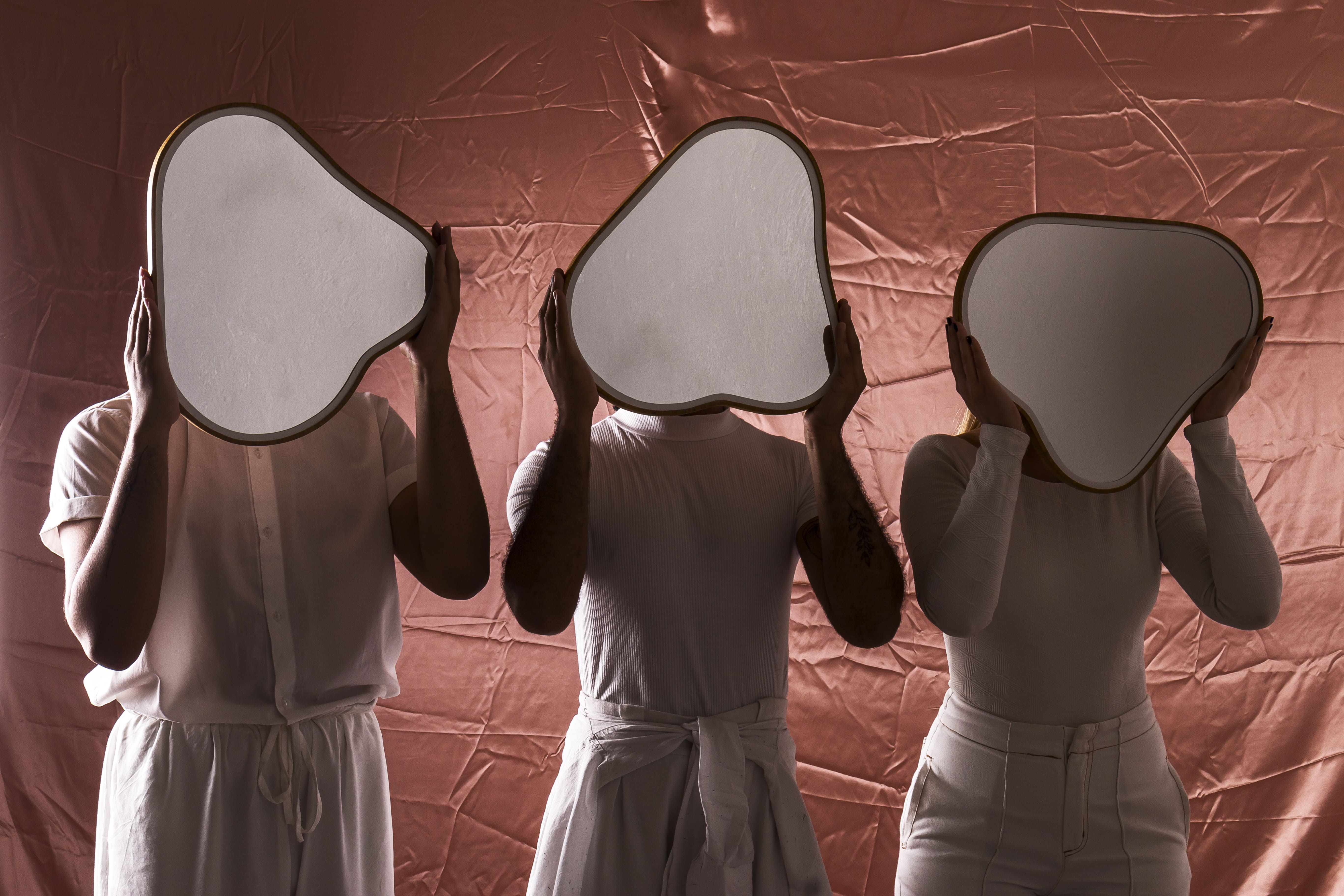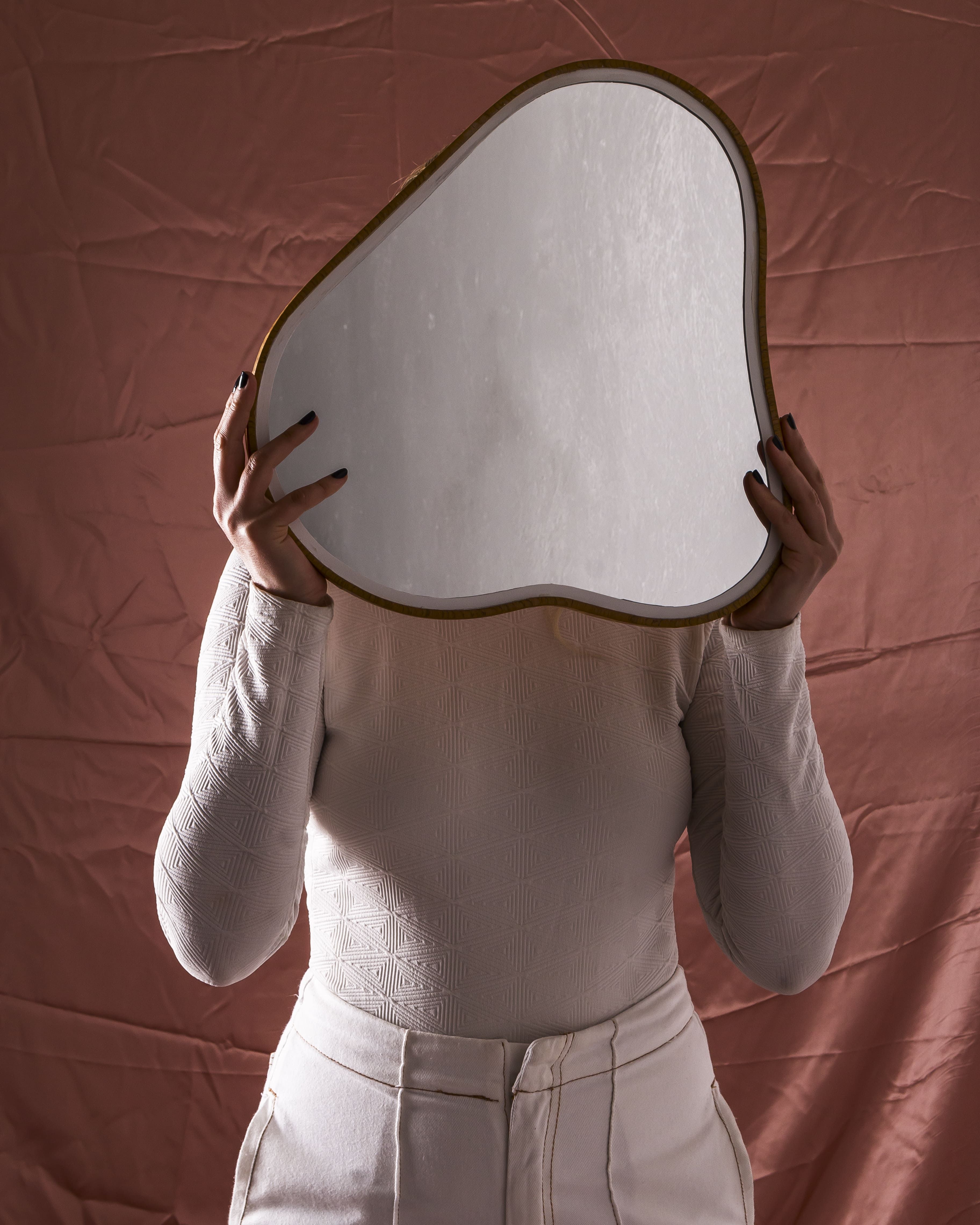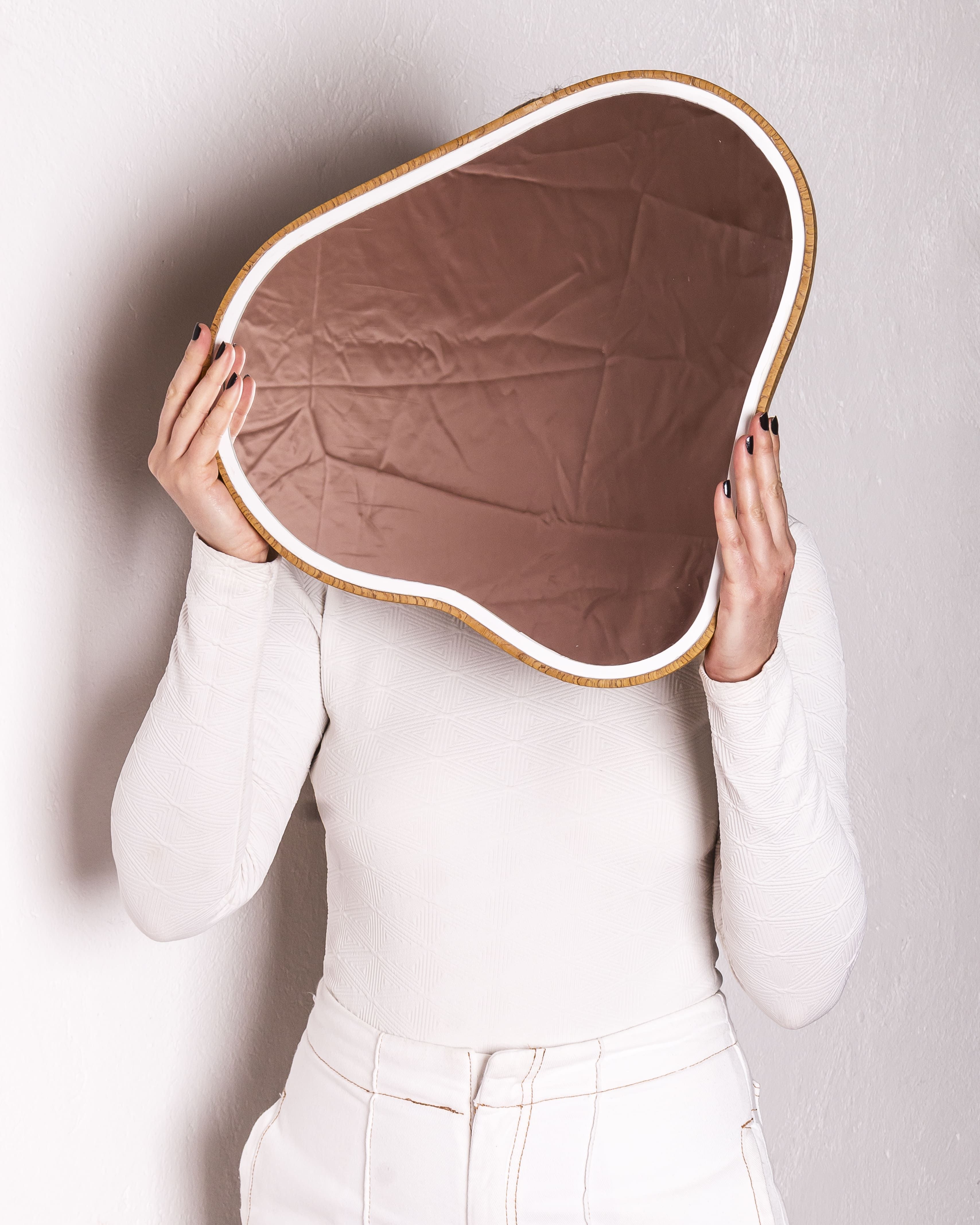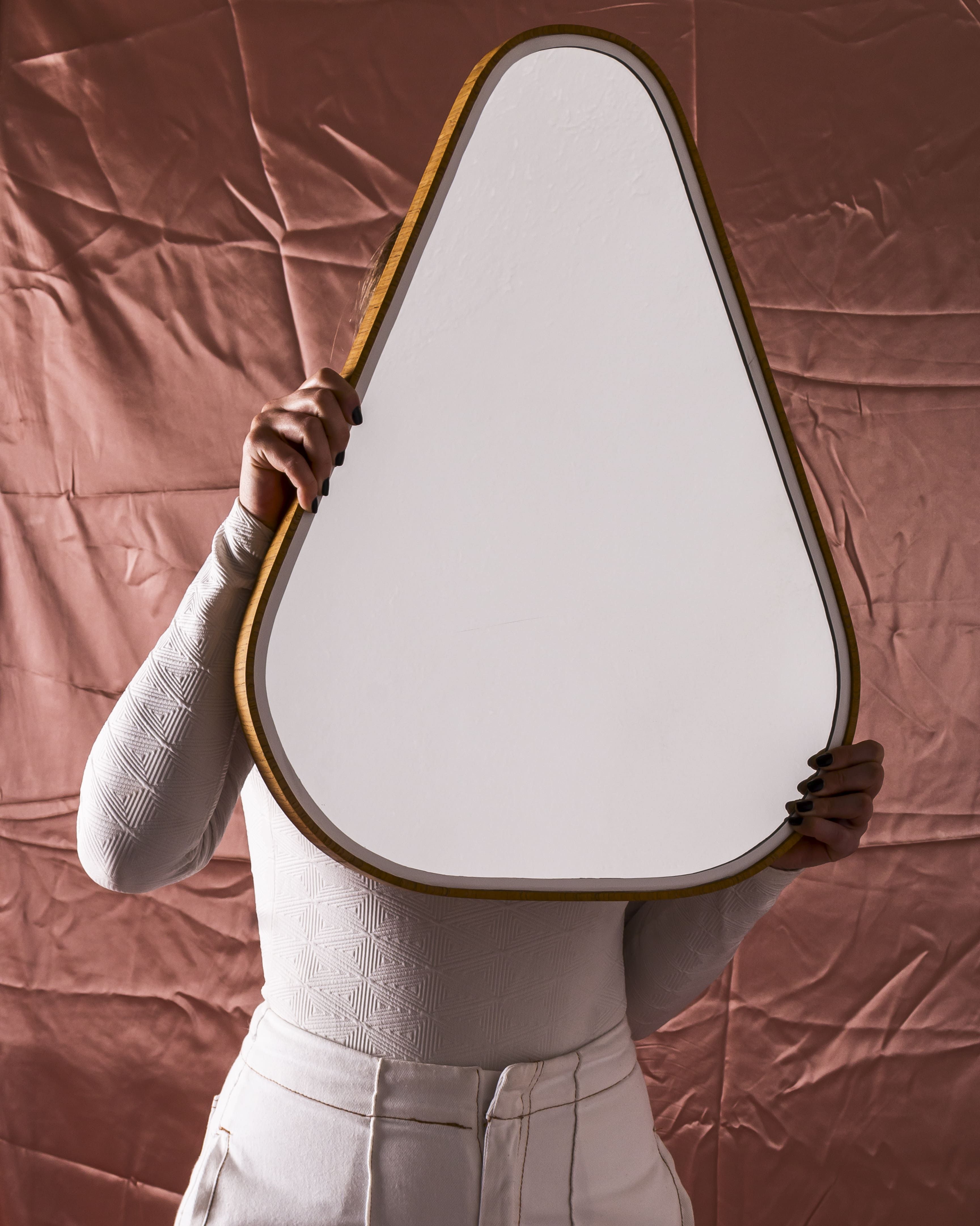 O branco está presente na estrutura do vaso e no contorno do espelho assim como o tom presente dentro da fruta. Os espelhos são em duas formas diferentes, uma inspirada no próprio fruto (castanha do caju) e outra no seu pedúnculo piriforme. Ambos podem ser fixados na parede em diversas formas, trazendo flexibilidade e adaptação ao projeto.