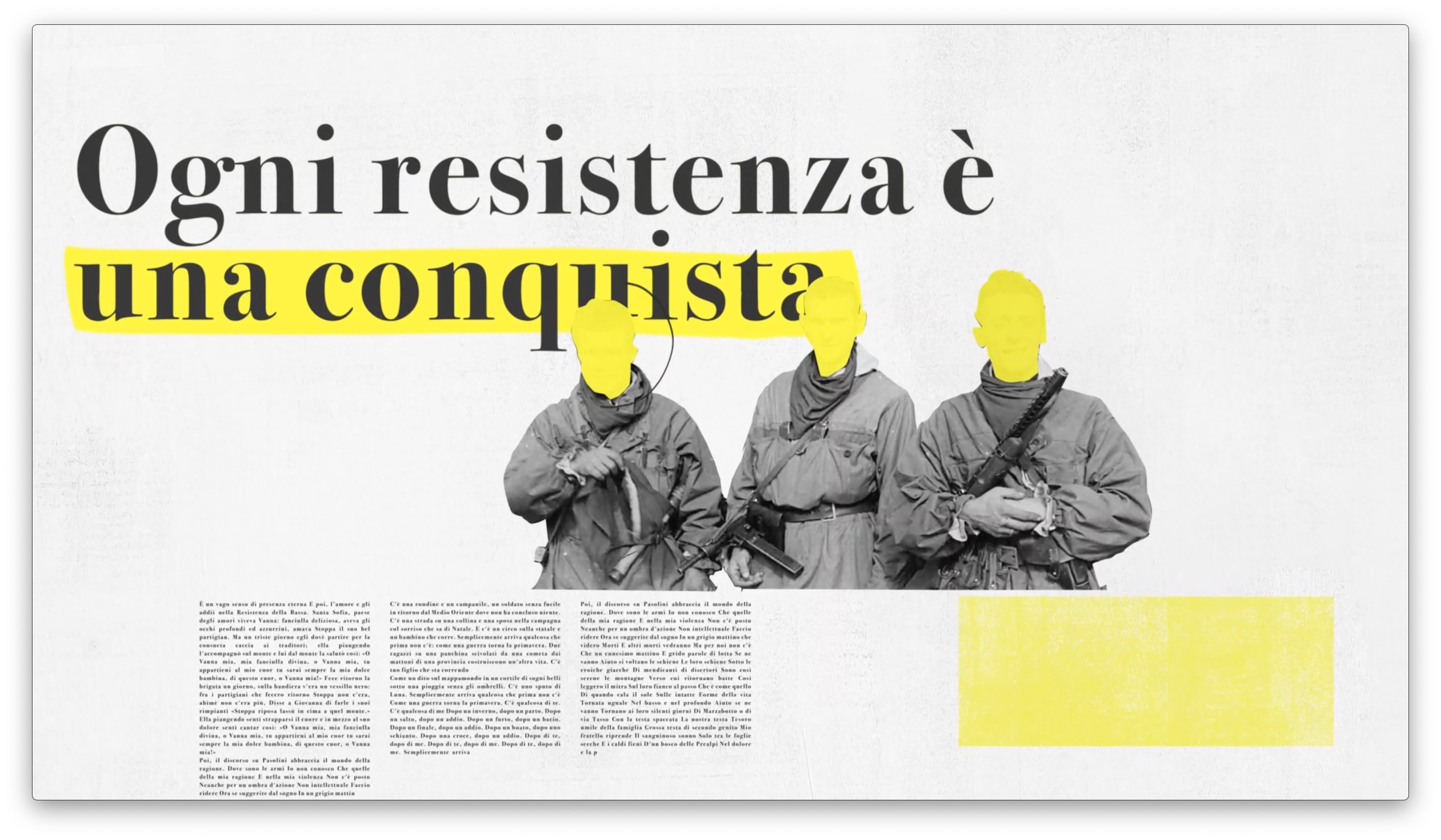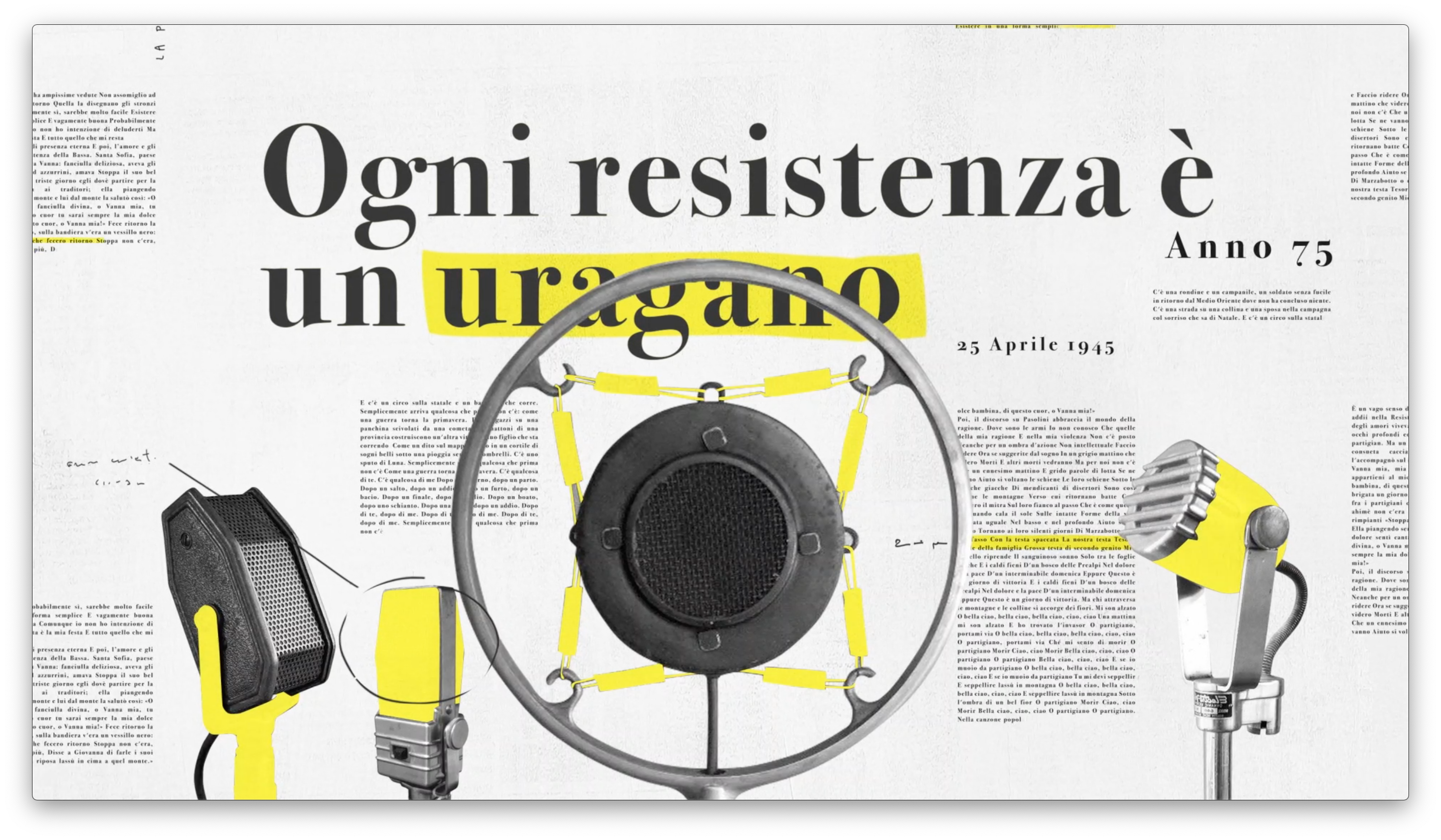 Voci resistenti è un concerto streaming dedicato ai 75 anni della Resistenza. Evento Parma 2020 che coinvolge artisti come Vinicio Capossela, Vasco Brondi, Maria Antonietta, Marlene Kunz, è prodotto da Tiwi Studio per Sky Arte. Lo sviluppo narrativo, che graficamente richiama i quotidiani dell’epoca, è scandito da titoli ispirati alle varianti della parola “resistenza”.