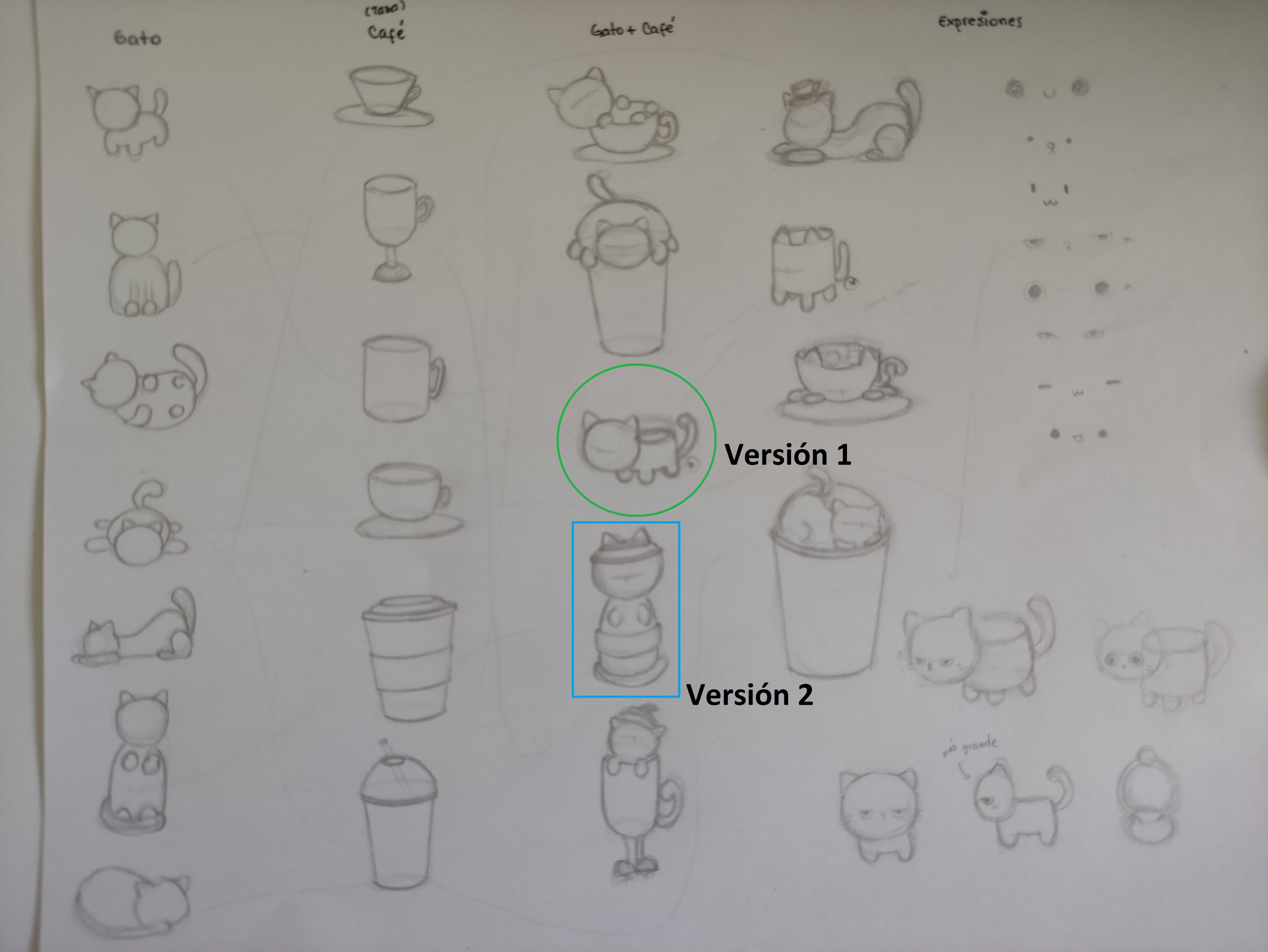 Admito que al iniciar el curso tenía en mente hacer un modelo de una de mis gatas. Así que, en cuanto a diseño, más que nada fue agregar un segundo elemento que me gustara, que resultó siendo un café. Así fue como en la etapa de bocetaje mezclé ambas cosas, para luego agregarle una expresión. Esto último no fue muy difícil, mi gata tiene una expresión casi permanente xD