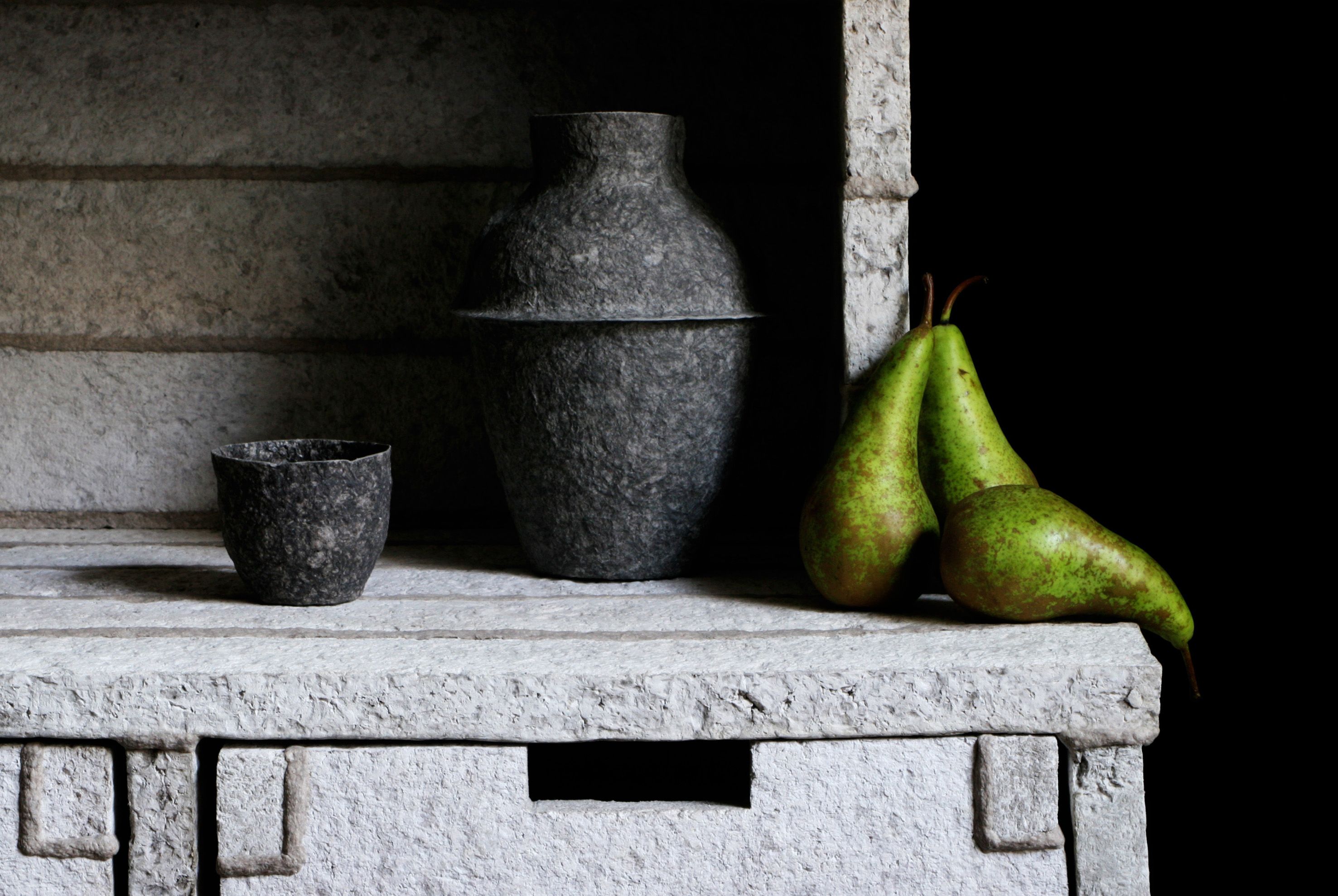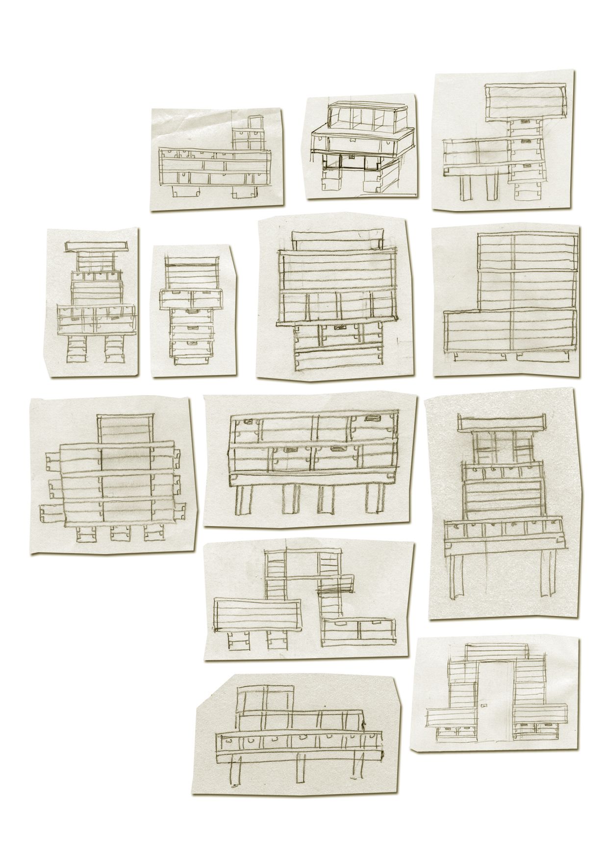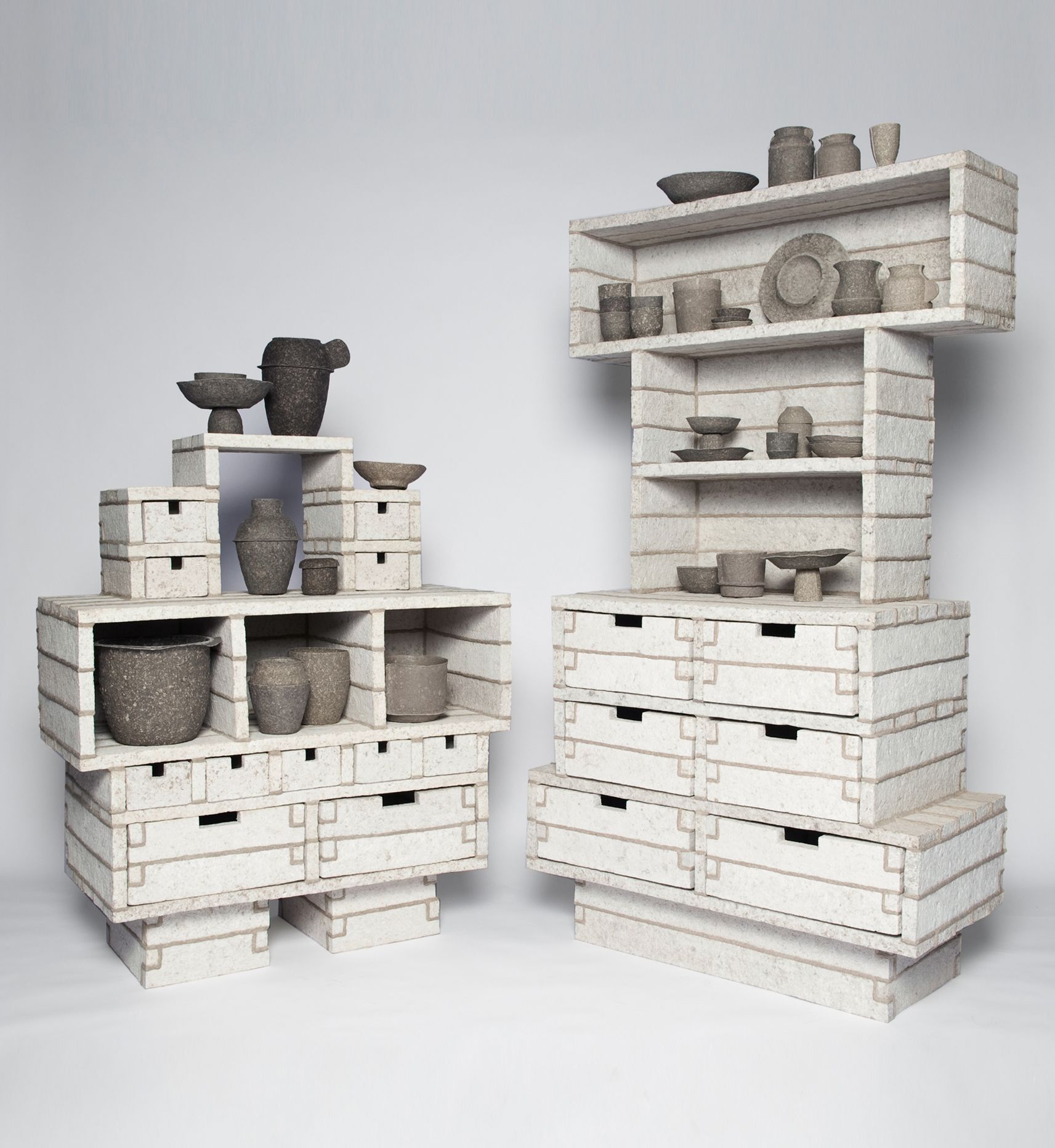 The Paperpulp Cabinets are entirely made from this ‘new old’ material, constructed from various oblong boards stacked upon one another. Some parts have drawers, while others are left open to function as shelves. The inch-thick box component has been moulded from paper pulp and assembled using simple box-jointing techniques borrowed from woodwork, and is fixed together with paper pulp too.