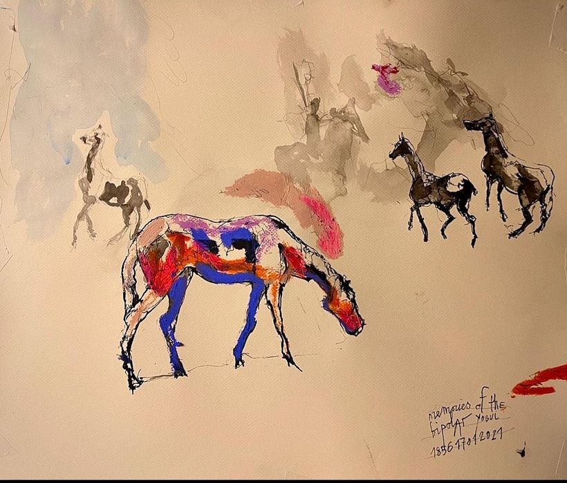 He remembered him, absorbed, watching him that very early morning in the ceremonial garden. He had taken her good thoughts and now found him there. There was also a woman and together they painted a canvas that gradually took the shape of a female face. That painting was very beautiful and he could see its colors reflected. Then he immersed himself in it, mistaking his feathers for the acrylic. He came out quickly, did his acrobatic dance on the couple who couldn't believe what he was seeing and whispered in the man's ear_ Your good thoughts brought you here. These are the doors that were opening. You knew how to see what was behind. Painting makes you happy and your works have the magic of making people happy.