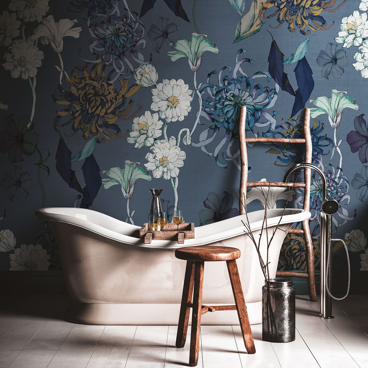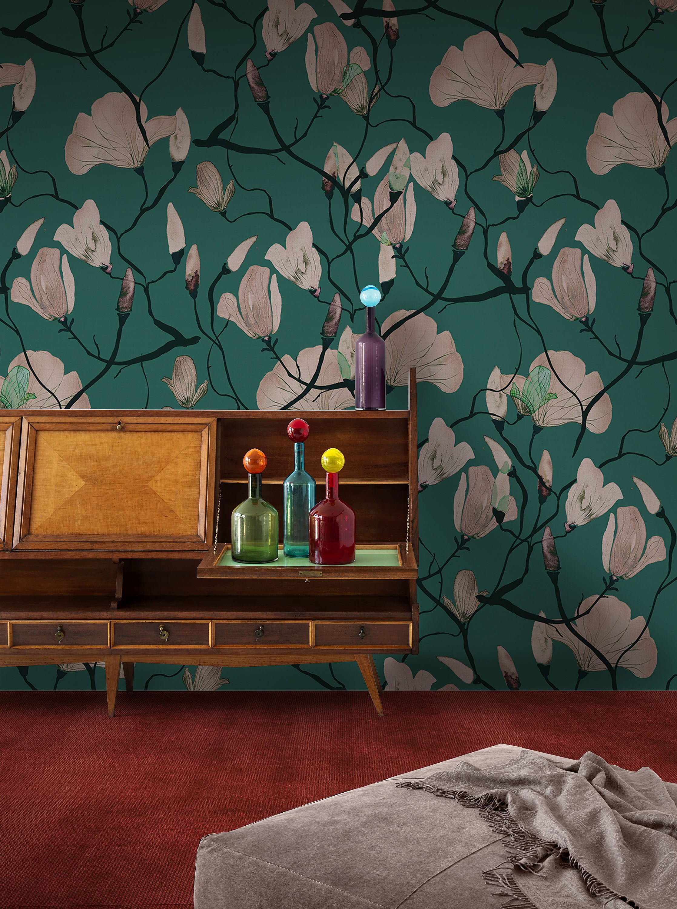 Large banana leaves, chrysanthemums and daffodils, eucalyptus leaves, magnolia flowers have been chosen for the Inkiostro Bianco wallpaper collections: the materials are technical and refined, to guarantee an optimal result in domestic and contract contexts.